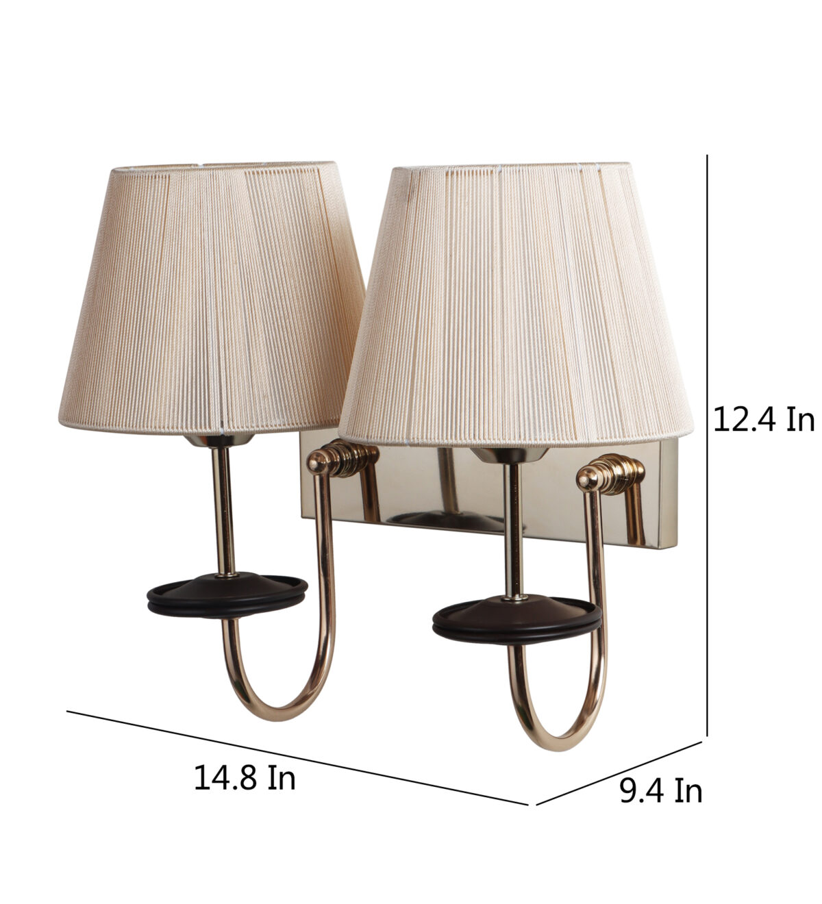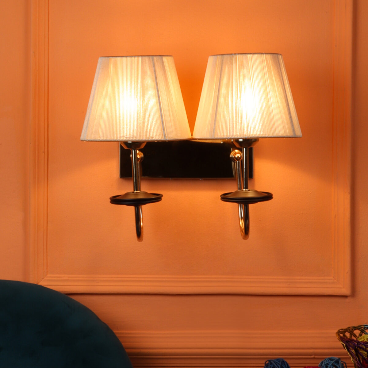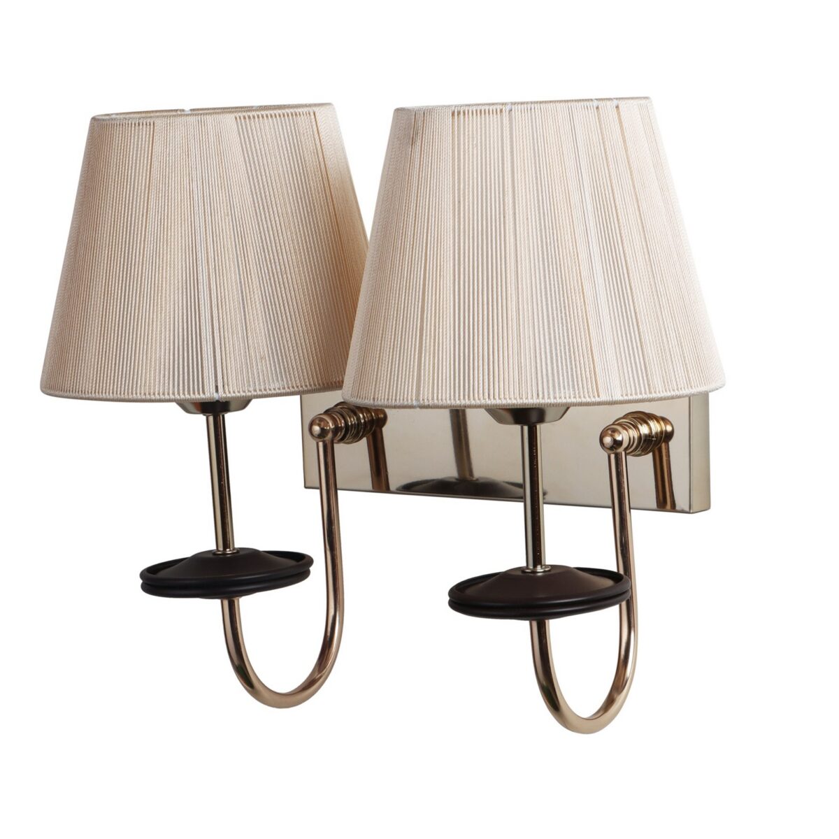 Gold finish double wall light with taper off white fabric shade. It is maintenance free, comes with an E27 holder, only the change of lamp is required, which is available locally everywhere. Application includes both residential and commercial premises wherever it matches with your interiors. Matching single wall light code – WL2719. LAMP NOT INCLUDED.