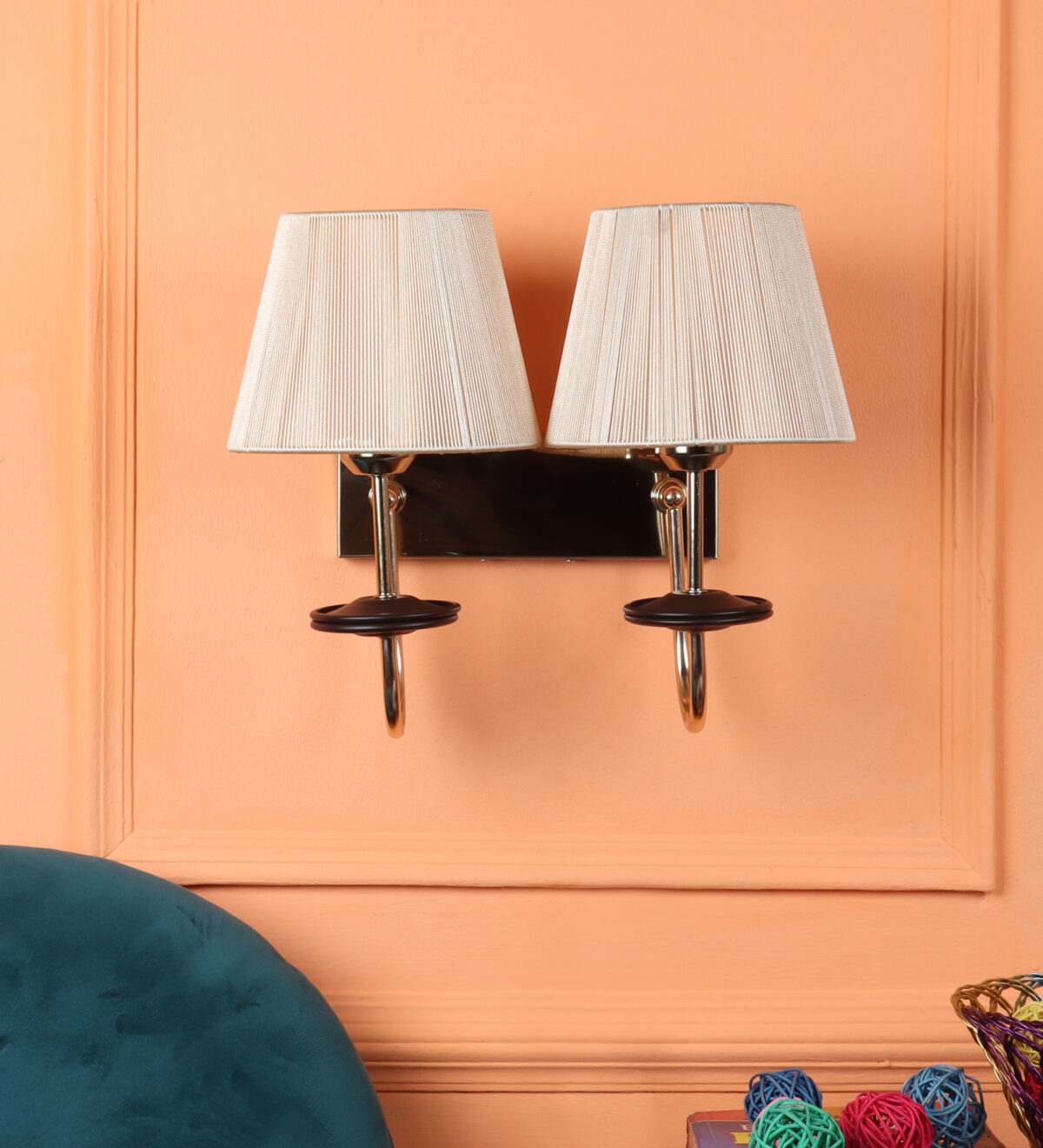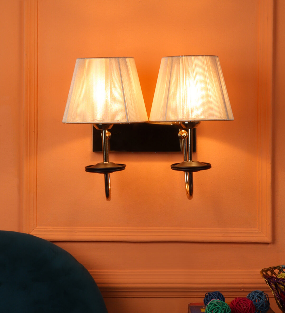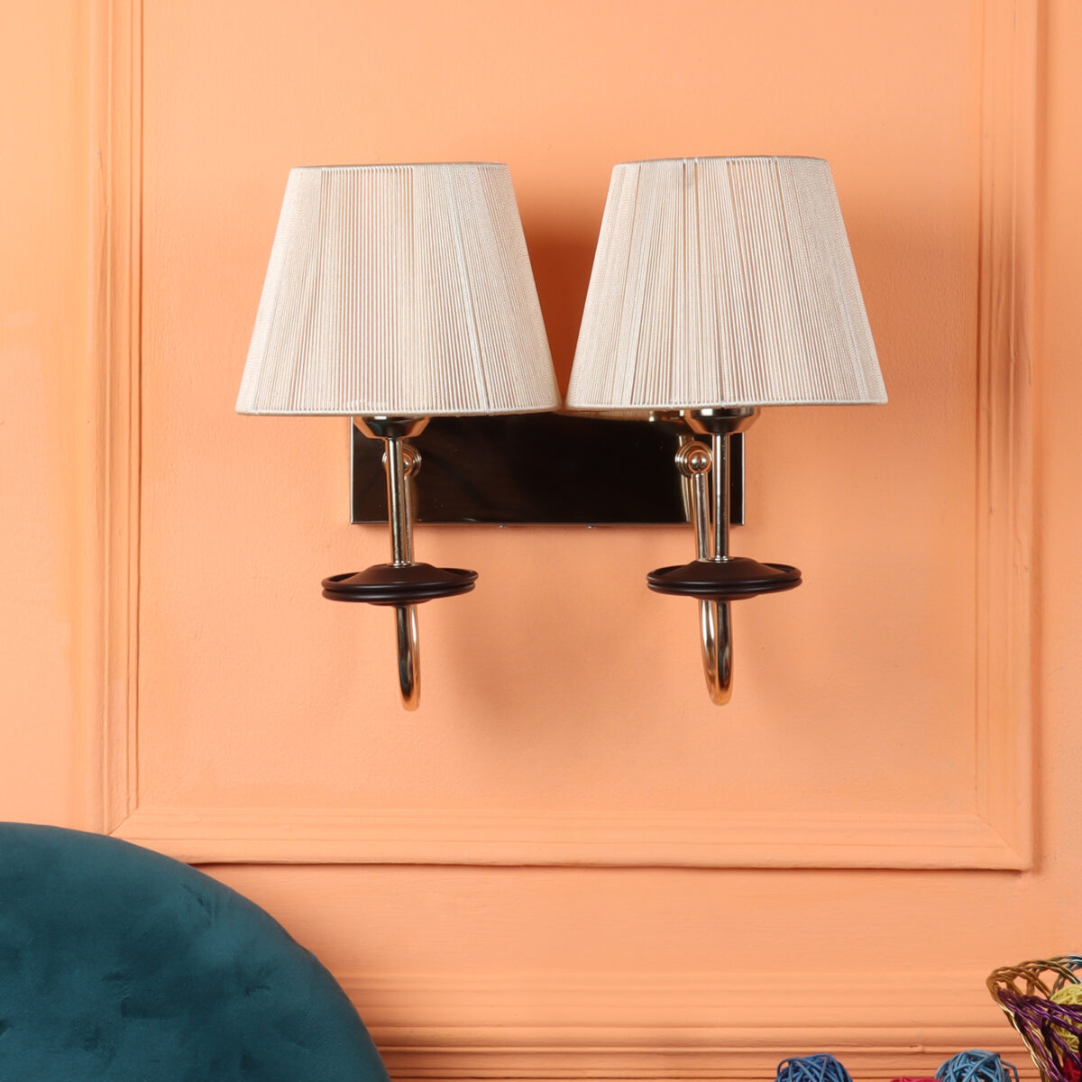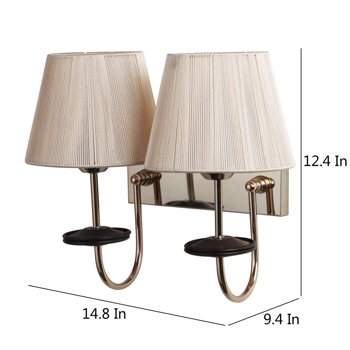 Gold finish double wall light with taper off white fabric shade. It is maintenance free, comes with an E27 holder, only the change of lamp is required, which is available locally everywhere. Application includes both residential and commercial premises wherever it matches with your interiors. Matching single wall light code – WL2719. LAMP NOT INCLUDED.