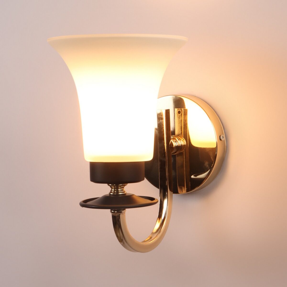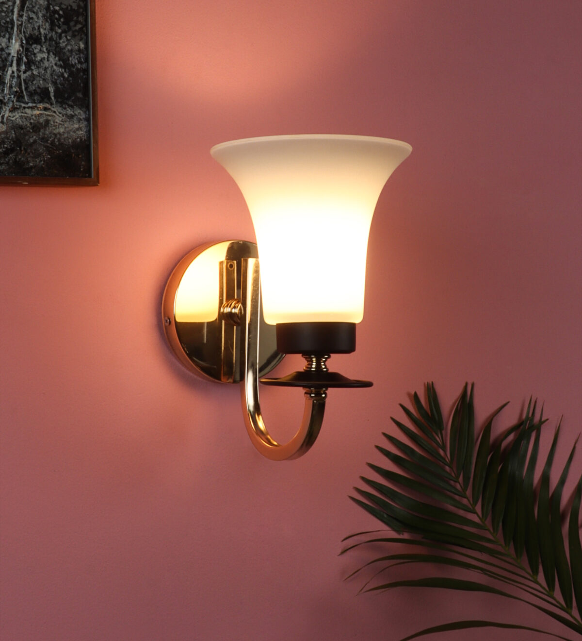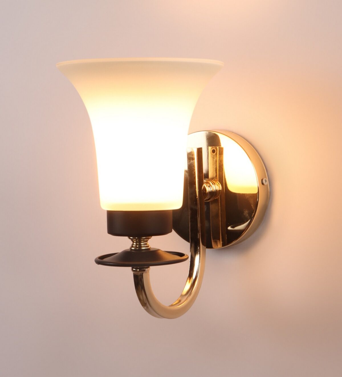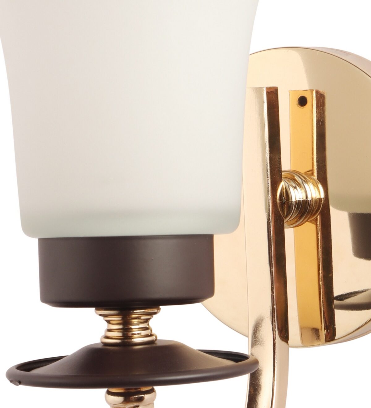 Gold, brown modern, mild steel single wall light in white bell shaped glass. It is maintenance free, comes with an E27 holder, only the change of lamp is required, which is available locally everywhere. Matching double wall light code – WL2732. Matching chandellier code – CH463. Application includes both residential and commercial premises wherever it matches with your interiors. Can be customized as per requirement in case of bulk quantities. LAMP NOT INCLUDED.