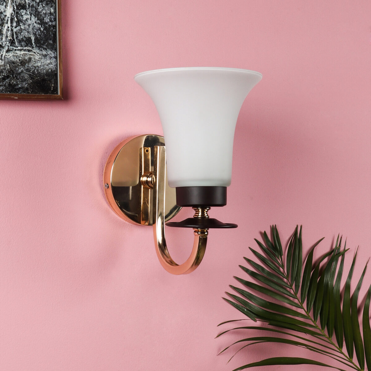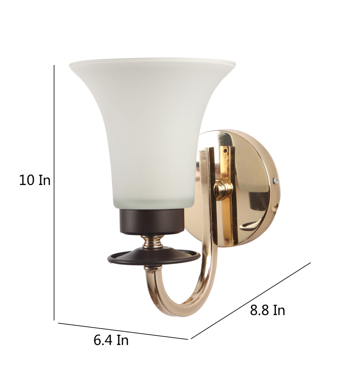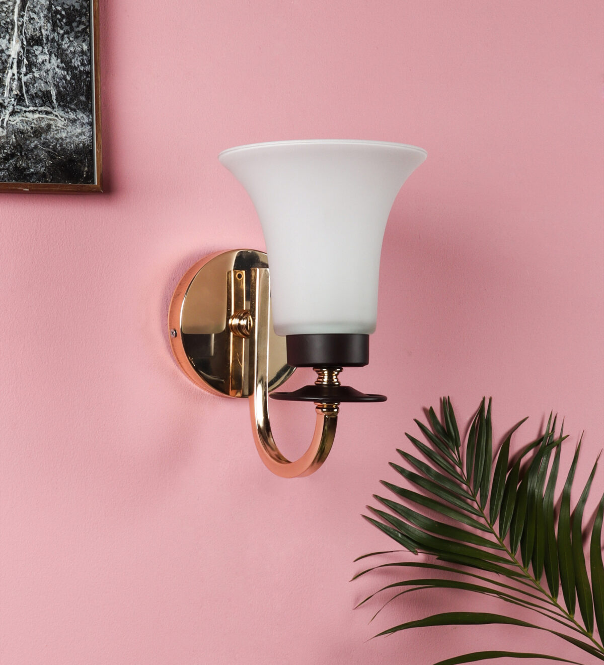 Gold, brown modern, mild steel single wall light in white bell shaped glass. It is maintenance free, comes with an E27 holder, only the change of lamp is required, which is available locally everywhere. Matching double wall light code – WL2732. Matching chandellier code – CH463. Application includes both residential and commercial premises wherever it matches with your interiors. Can be customized as per requirement in case of bulk quantities. LAMP NOT INCLUDED.