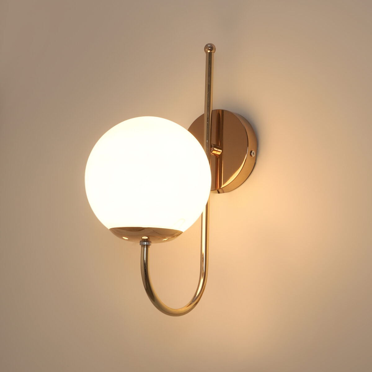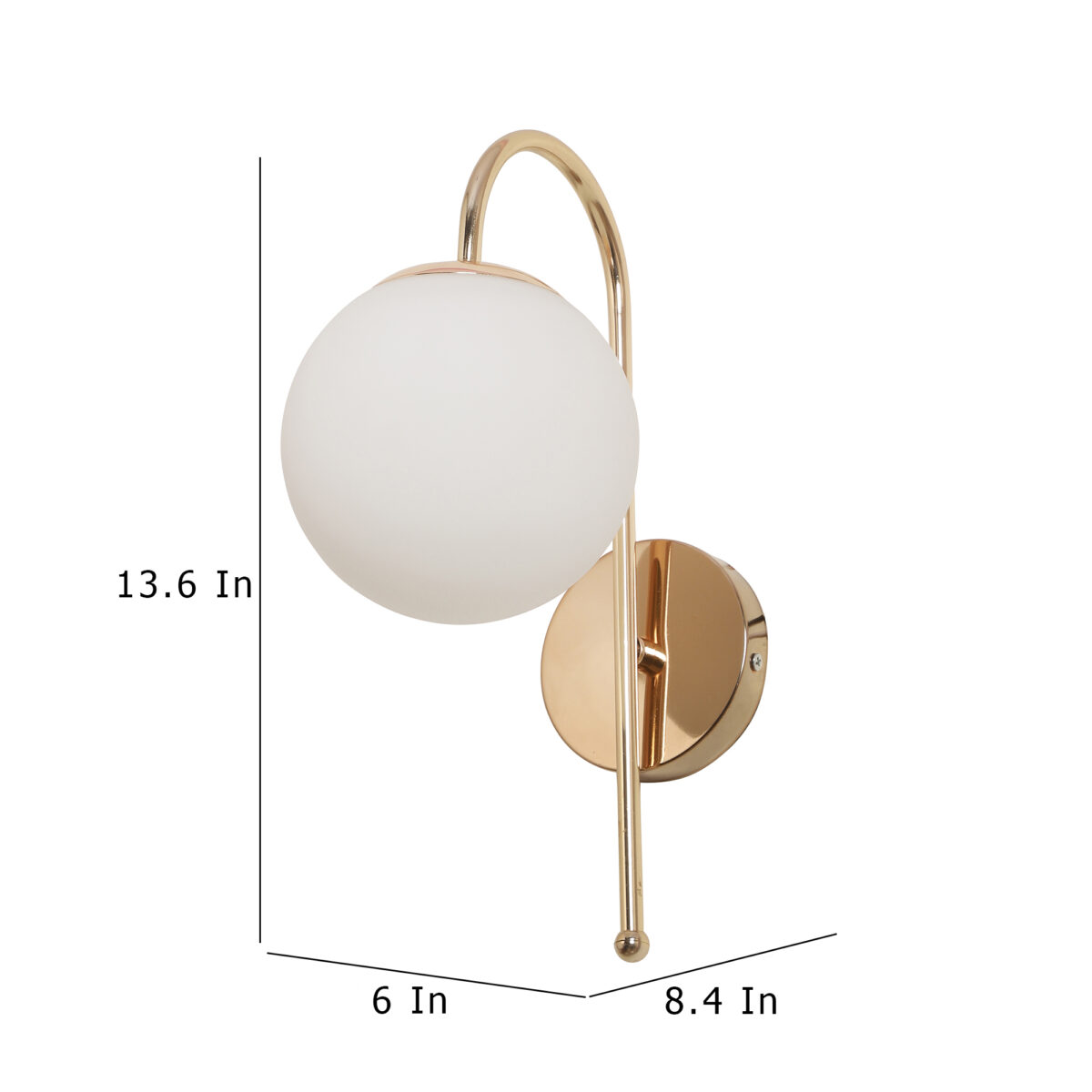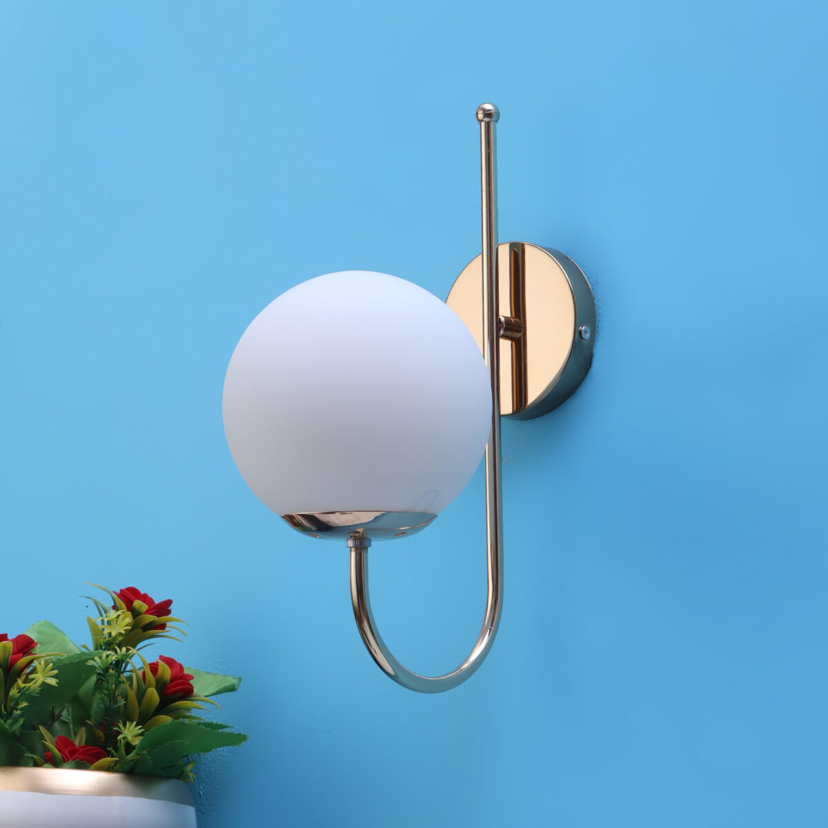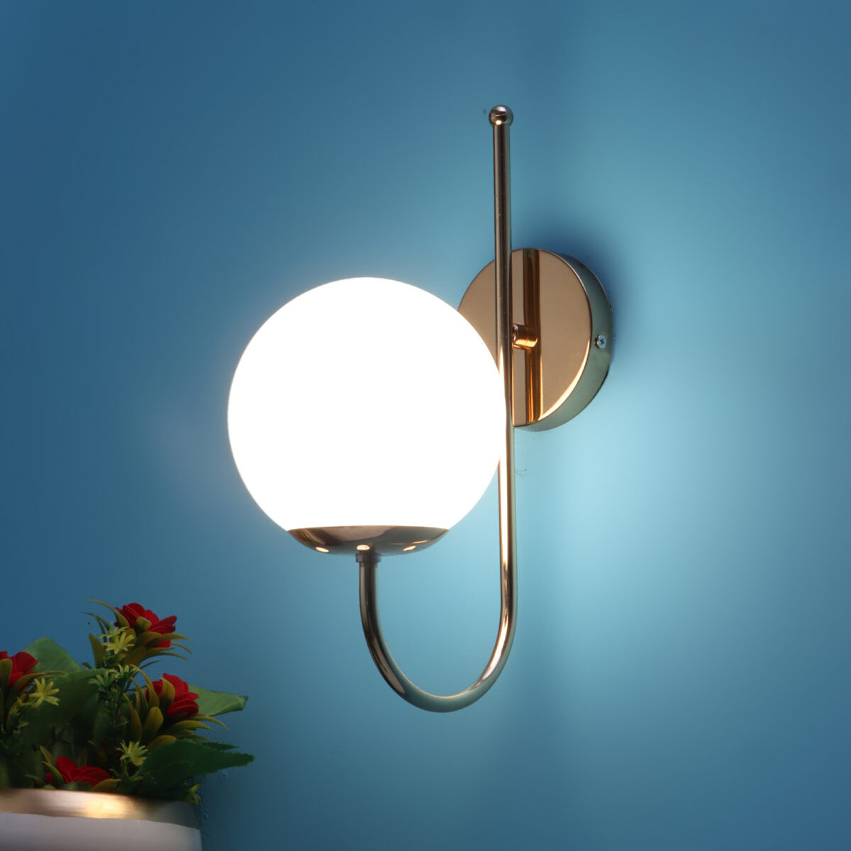 Gold finish single wall light with small round globe (doom) type white glass . It is maintenance free, easy to remove glass and wash it. Comes with an E27 holder, only the change of lamp is required, which is available locally everywhere. Application includes both residential and commercial premises wherever it matches with your interiors. Can be customized as per requirement. LAMP NOT INCLUDED.