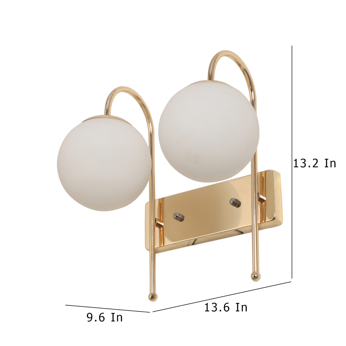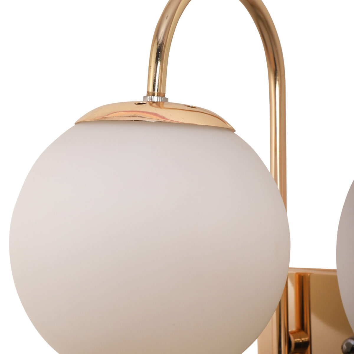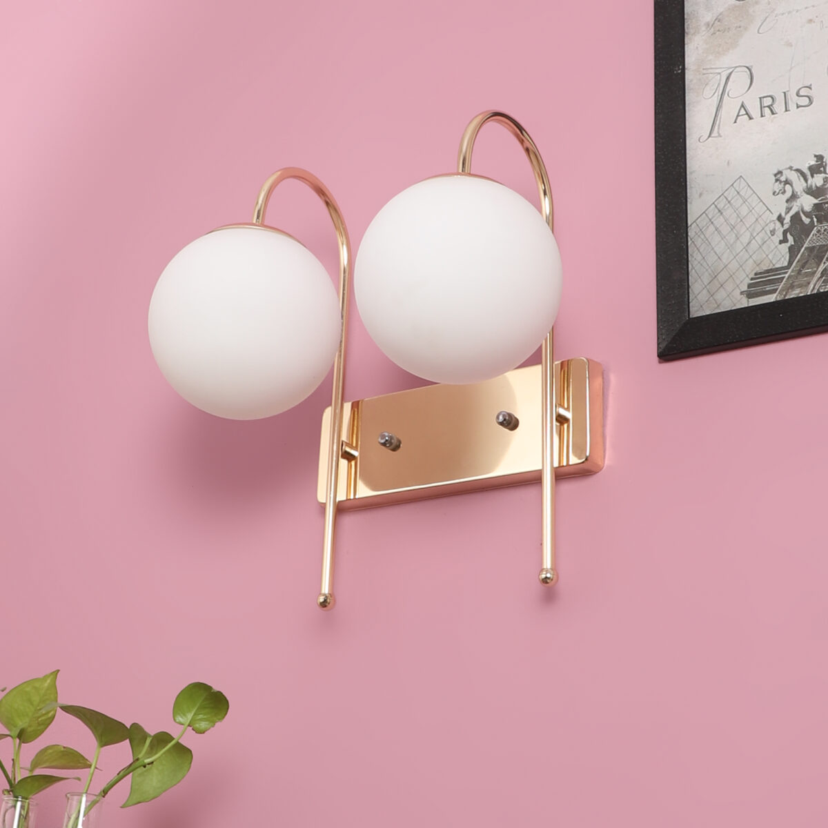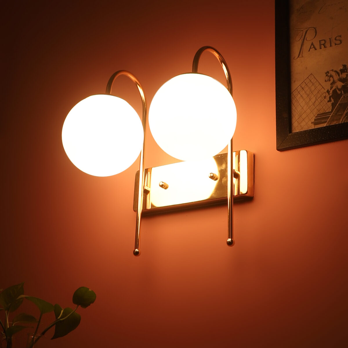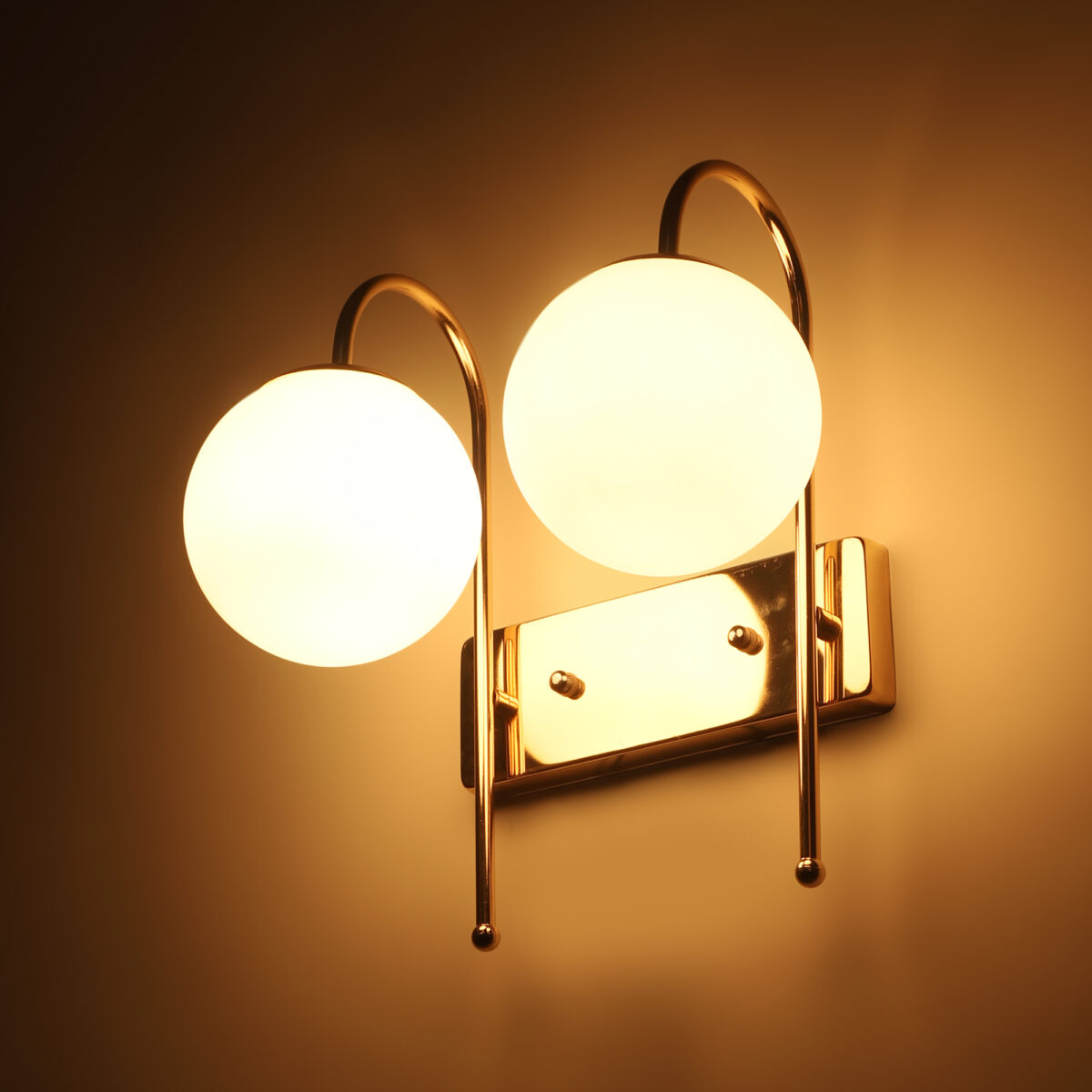 Gold finish double wall light with small round globe (doom) type white glasses. It is maintenance free, easy to remove glasses and wash them. Comes with an E27 holder, only the change of lamp is required, which is available locally everywhere. Application includes both residential and commercial premises wherever it matches with your interiors. Can be customized as per requirement. LAMP NOT INCLUDED.