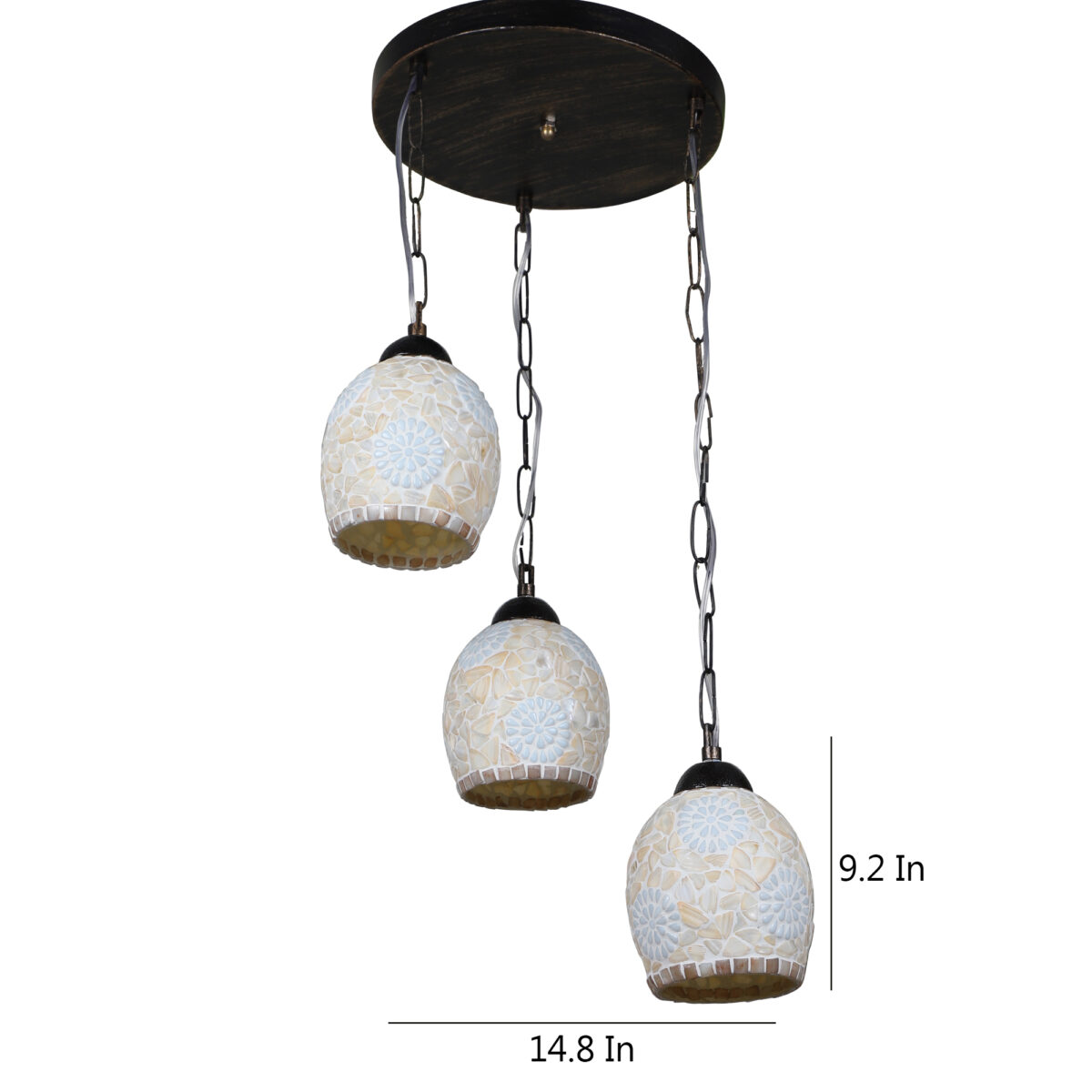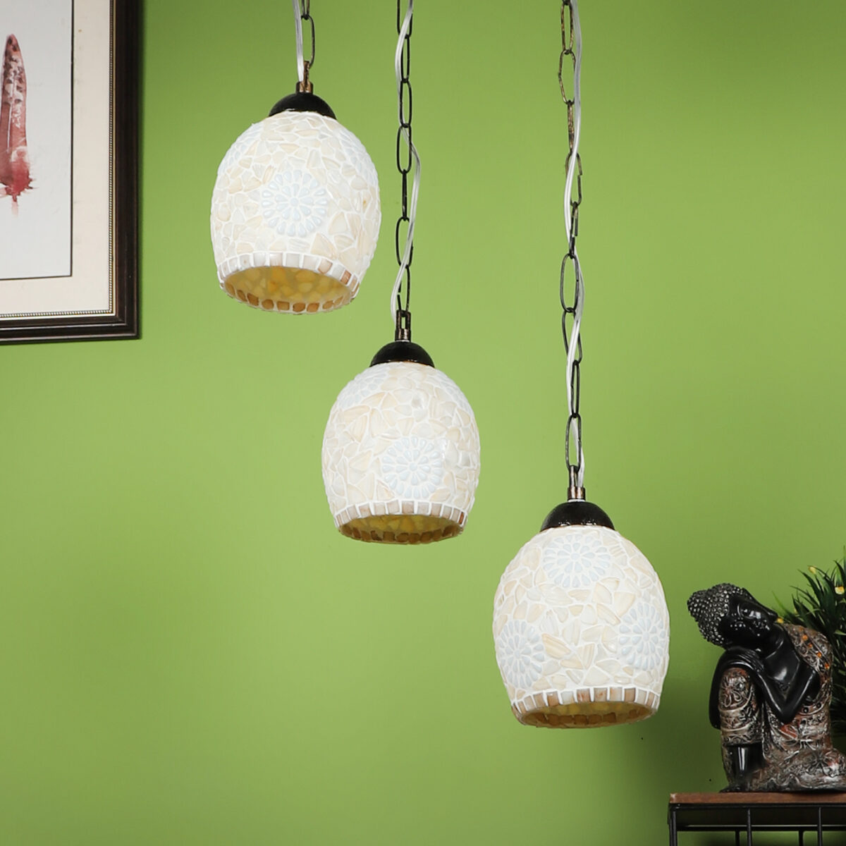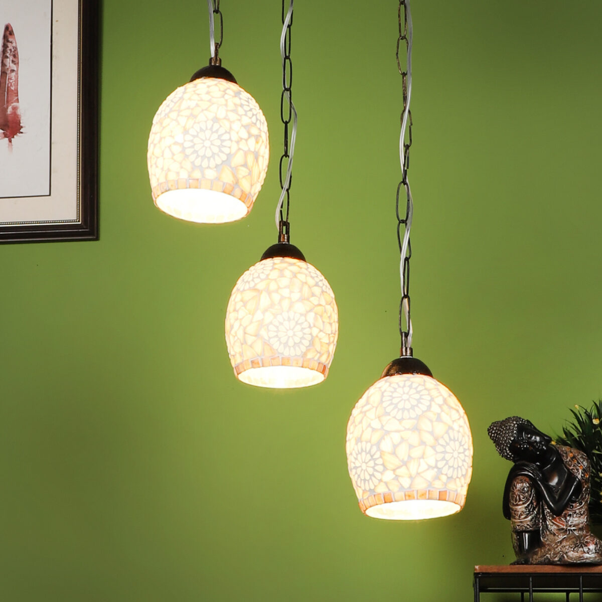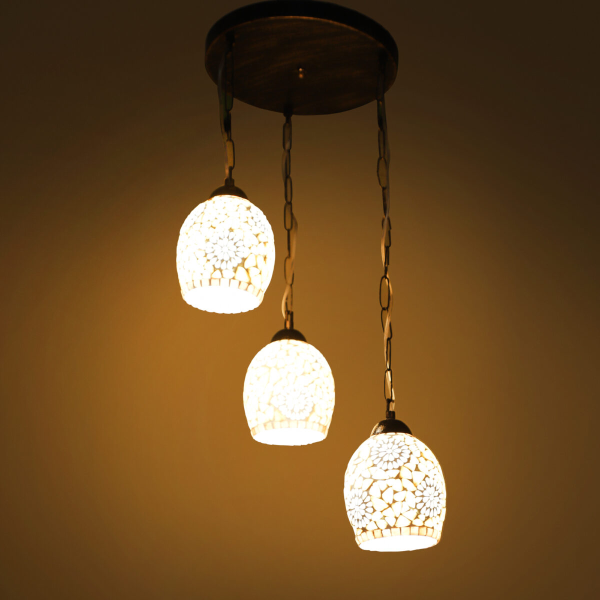 Mother of pearl contemporaneity, elegant, mild steel triple hanging light.The suspension can be adjusted at time of installation to the desired height. It is maintenance free, comes with an E27 holder, only the change of lamp is required, which is available locally everywhere. Application includes both residential and commercial premises wherever it matches with your interiors. Matching single hanging code – HL4048-L. Matching wall light code – WL2273. Can be customized as per requirement in case of bulk quantities. Lamp not included.
