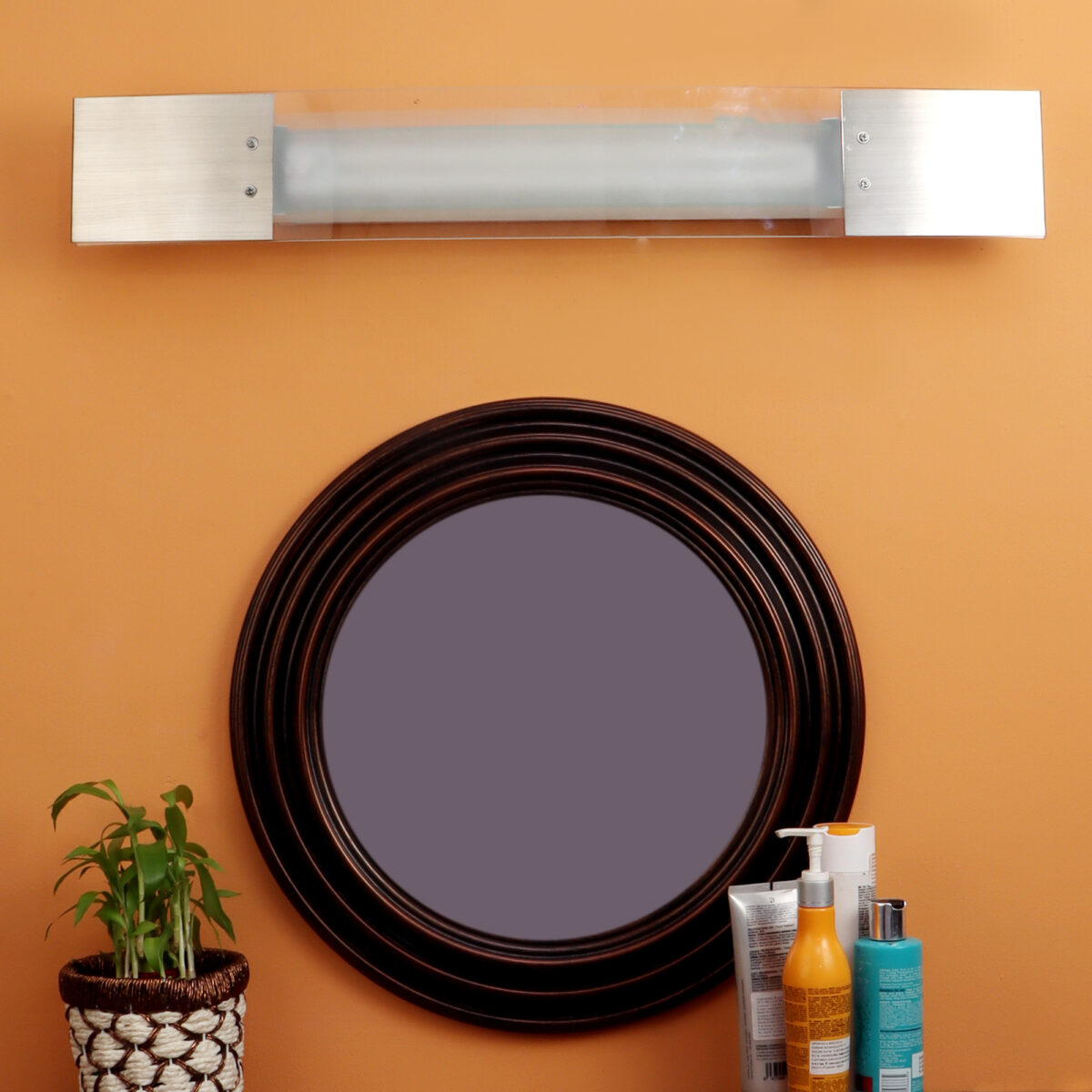 Steel mirror light in Silver (satin nickel) finish with a frosted glass. It comes with a 36 watt PLL tube for a very bright output. Great for installation above a mirror to provide illumination when shaving or applying make-up. It is maintenance free, comes with a PLL tube warm white (yellow) output. LED tube substitute also available easily in the market. It is maintenance free change of lamp is required, which is available locally everywhere. Also available in dark brown (wood finish) with code ML265COMBO. It is one of the bestselling product. Lamp included.