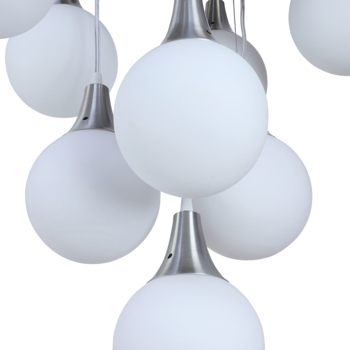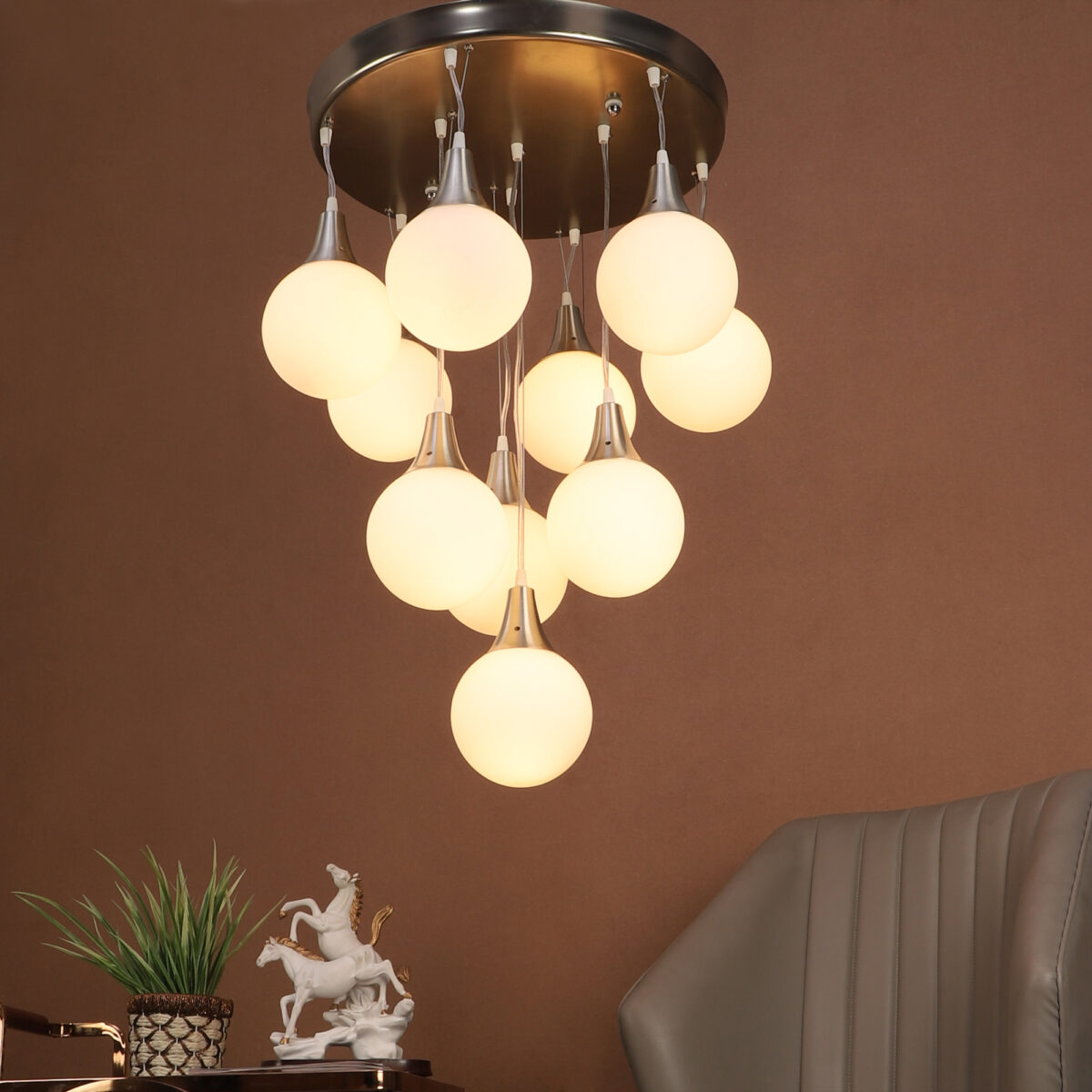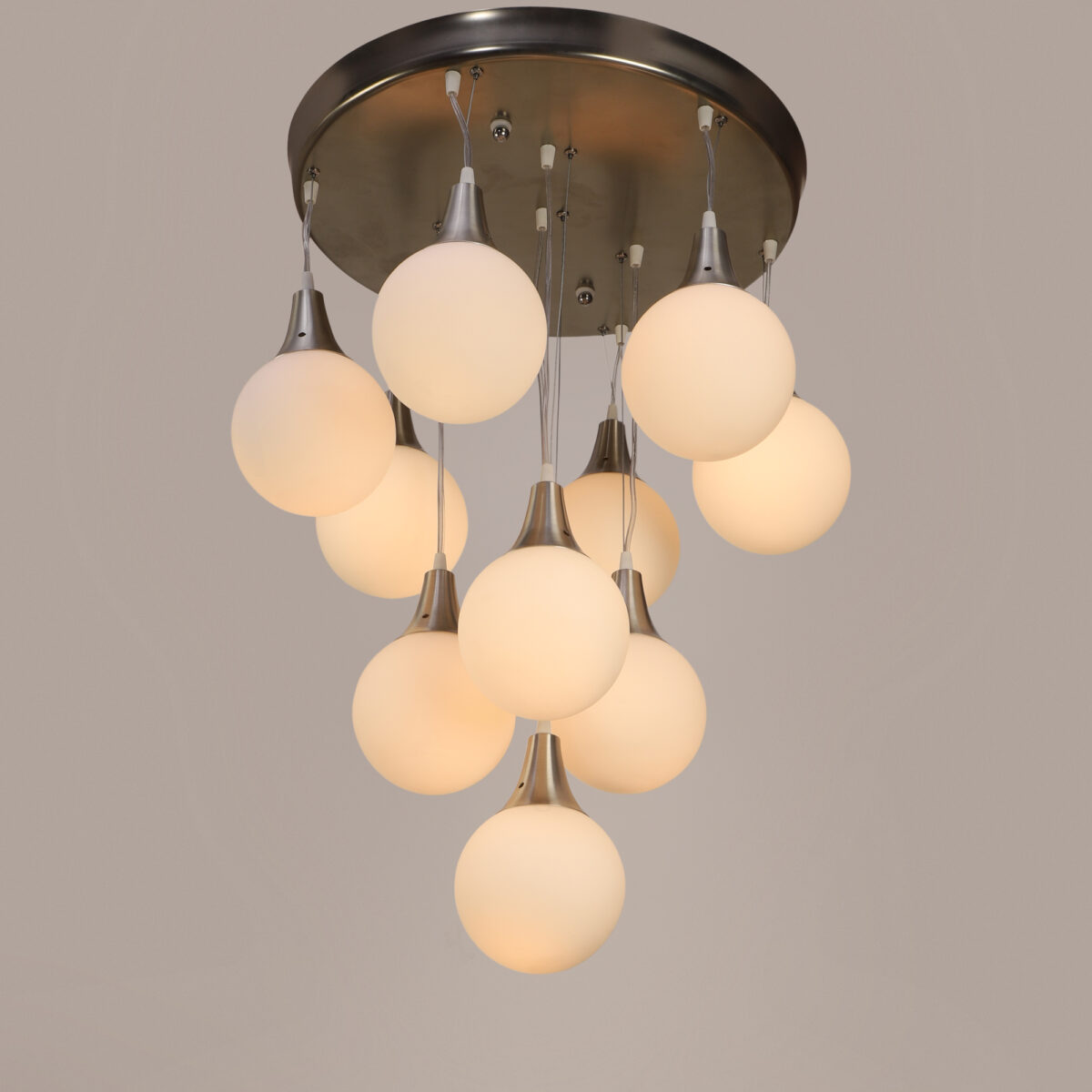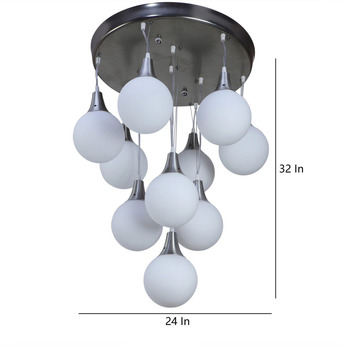 Silver (satin nickel) finish, modern doom (globe) glass cluster chandelier / hanging light having ten lamps made of mild steel and glass. It is one of the regular design which is never out of trend. The suspension can be adjusted at time of installation to the desired height. It is maintenance free, easy to remove glass and wash them, comes with an E27 holder, only the change of lamp is required, which is available locally everywhere. Application includes both residential and commercial premises wherever it matches with your interiors. Matching wall light code – Wl1262, WL1272. Matching hanging light – HL3935-6. Can be customized as per requirement in case of bulk quantities. LAMP NOT INCLUDED.