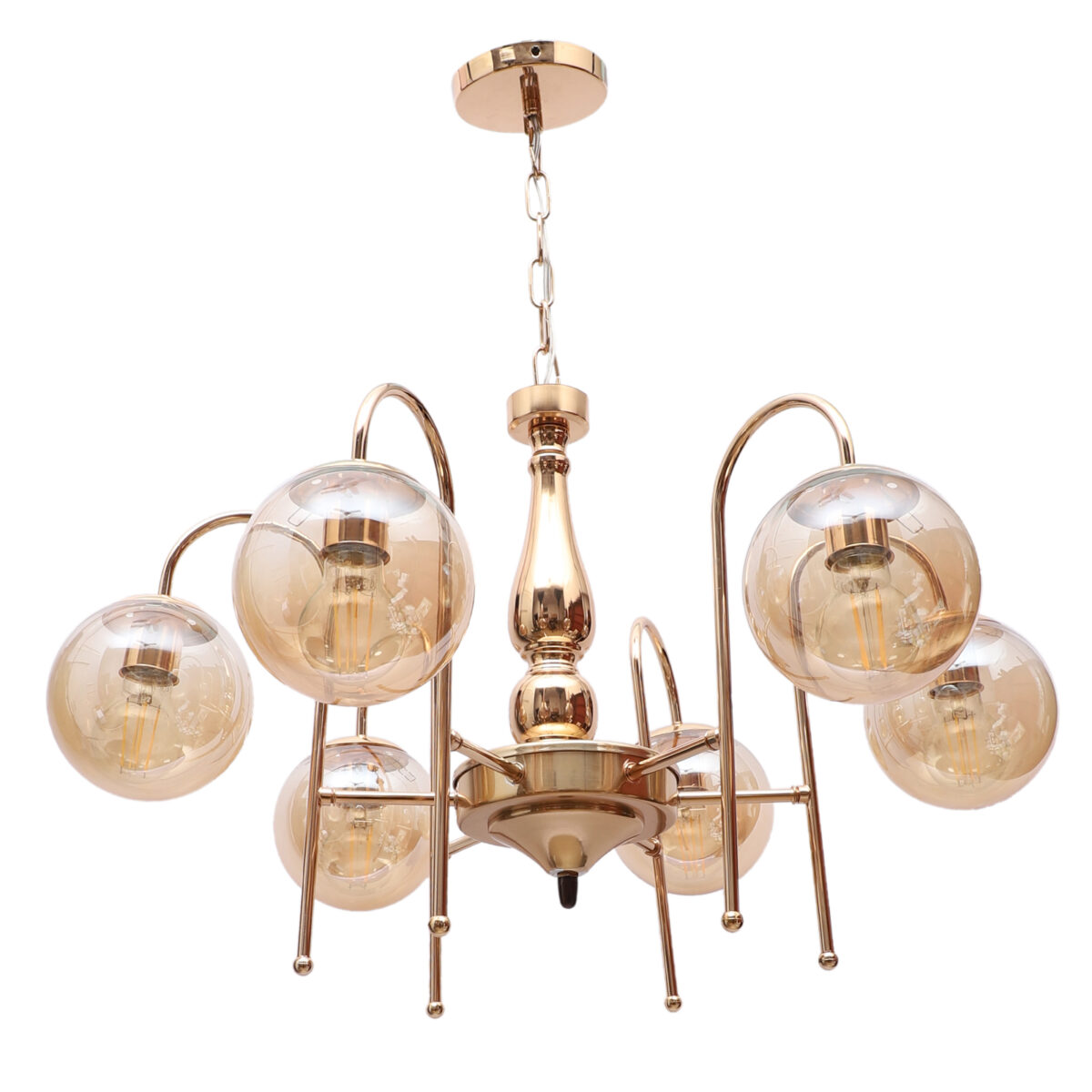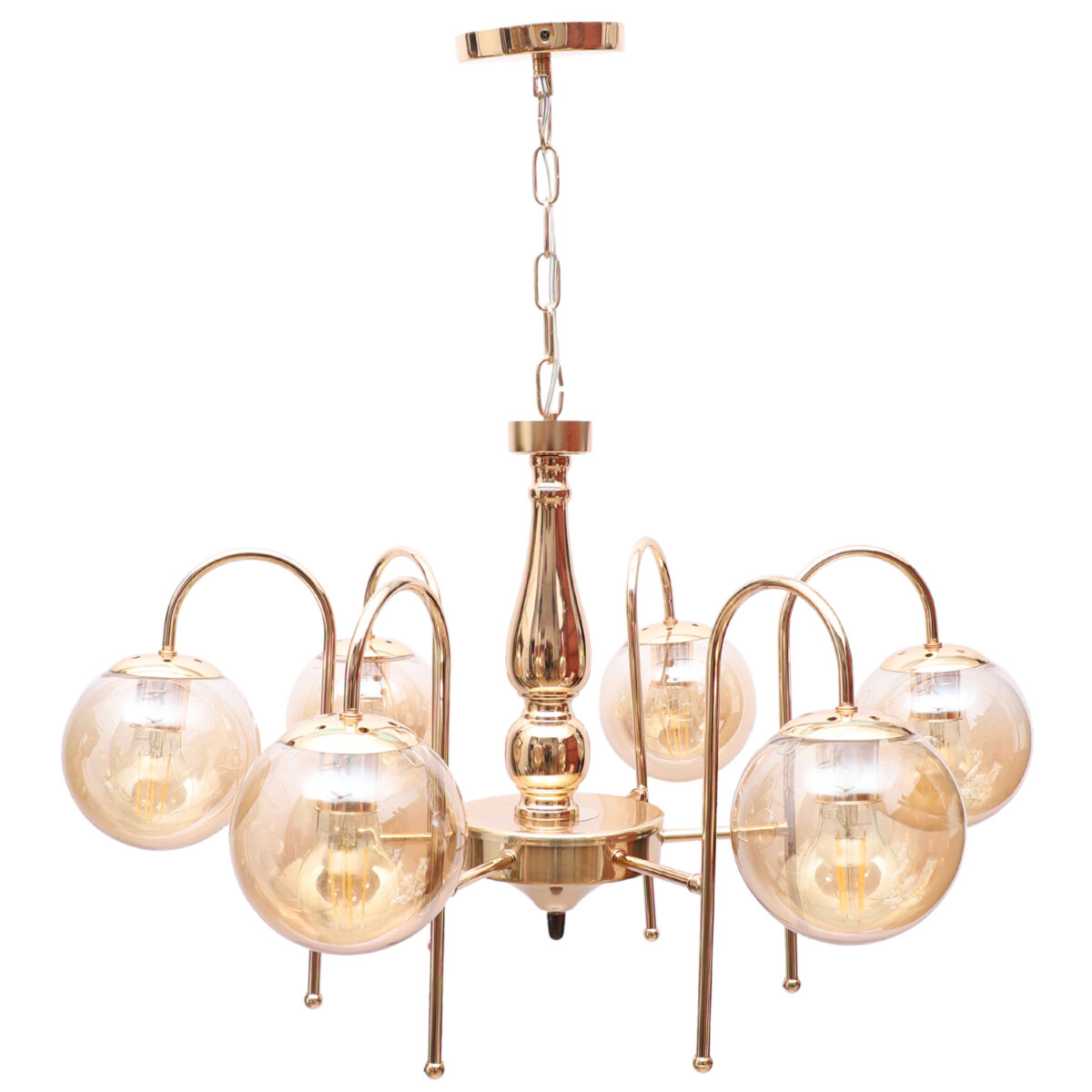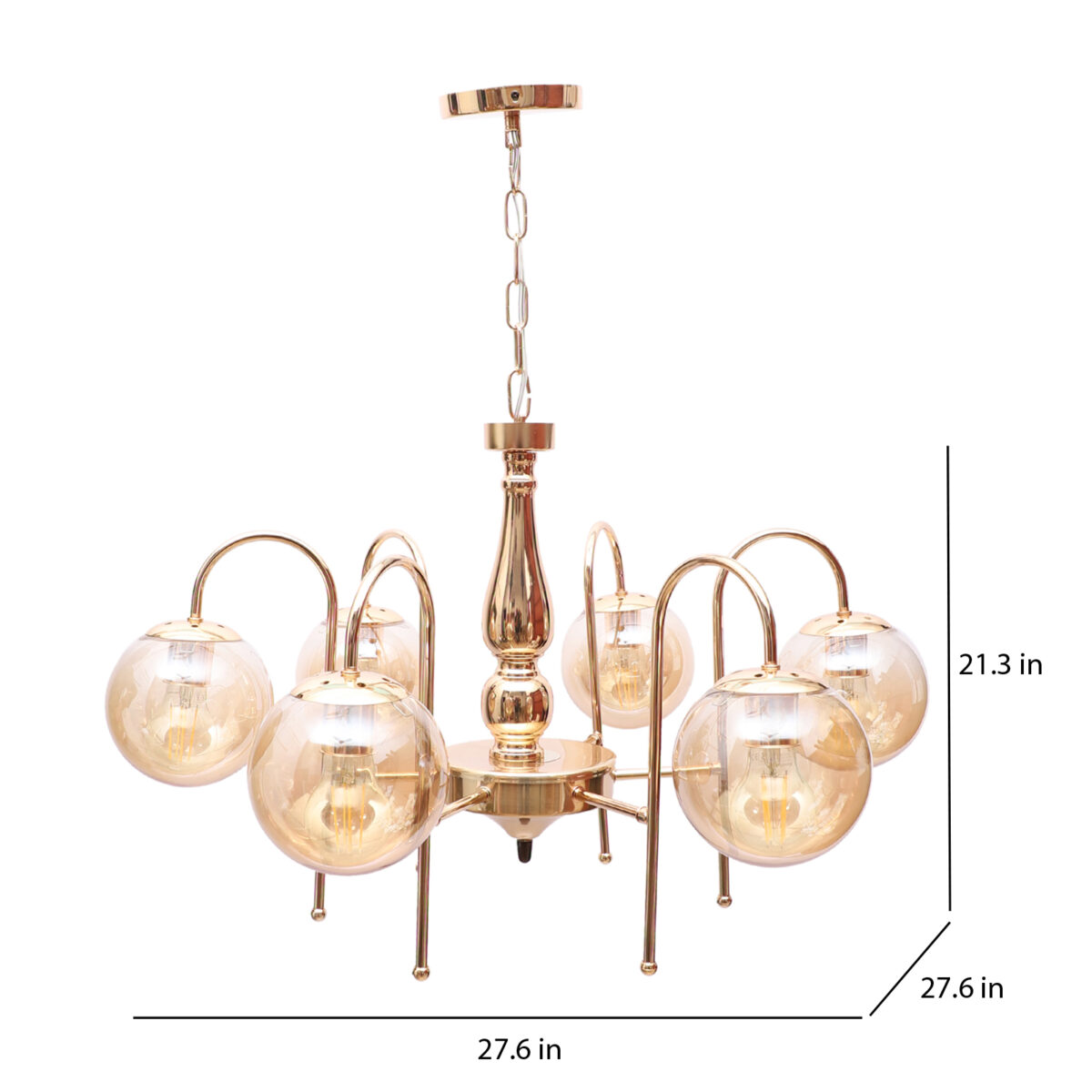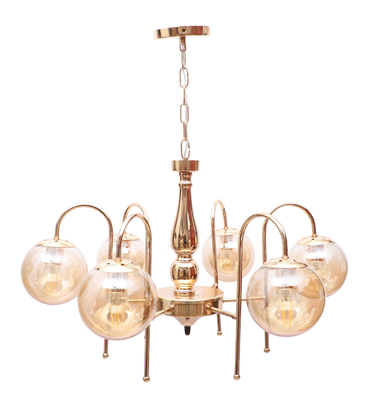 Gold finish chandellier having six lights.The suspension can be adjusted at time of installation to the desired height. It is maintenance free, it is easy to remove glasses and wash them. Comes with an E27 holder.Can be customized as per requirement even for small quantities. Other sizes can be made as per reruirement. LAMP NOT INCLUDED.