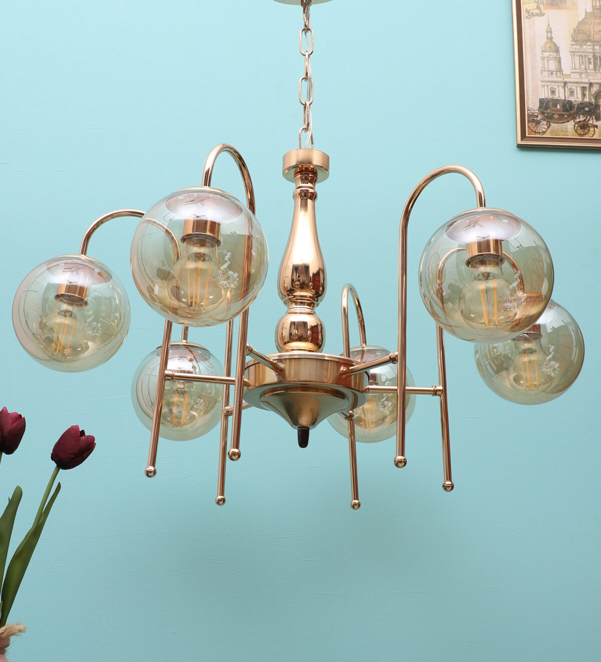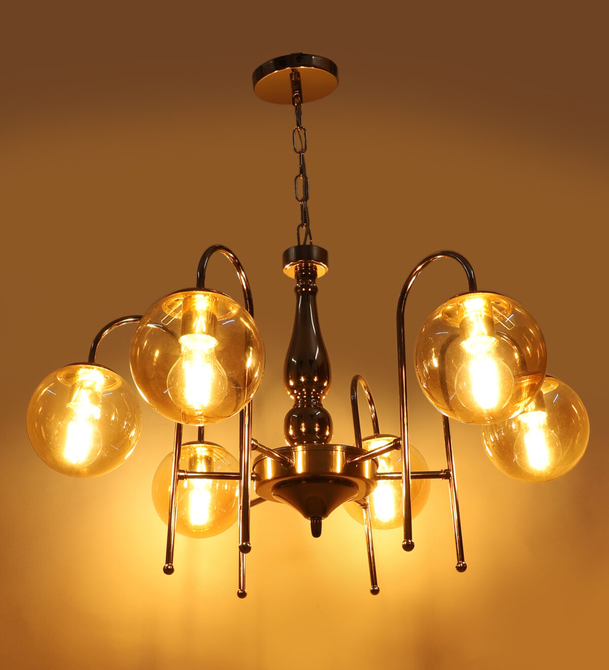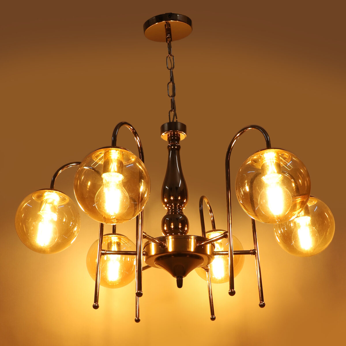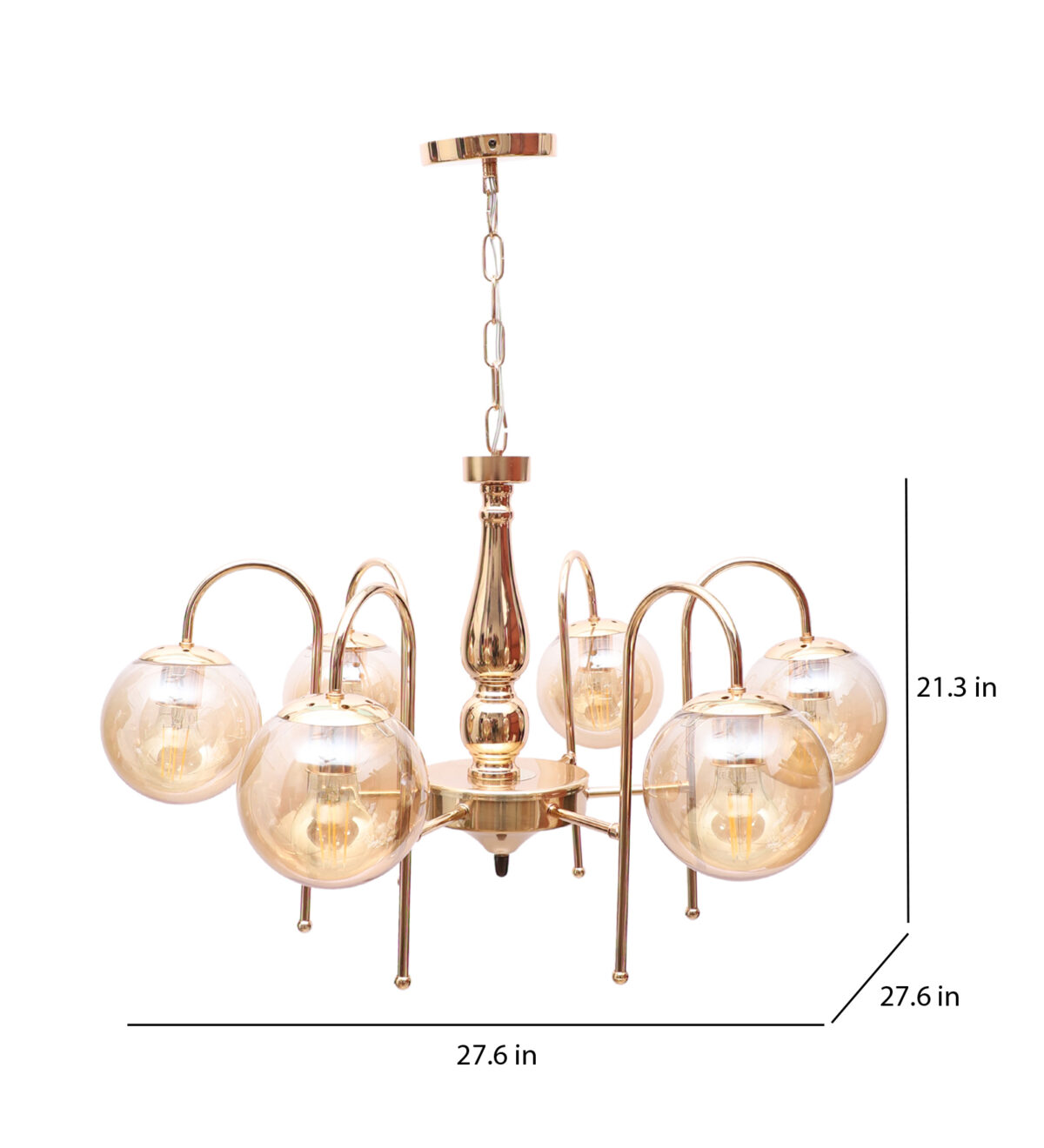 Gold finish chandellier having six lights.The suspension can be adjusted at time of installation to the desired height. It is maintenance free, it is easy to remove glasses and wash them. Comes with an E27 holder.Can be customized as per requirement even for small quantities. Other sizes can be made as per reruirement. LAMP NOT INCLUDED.