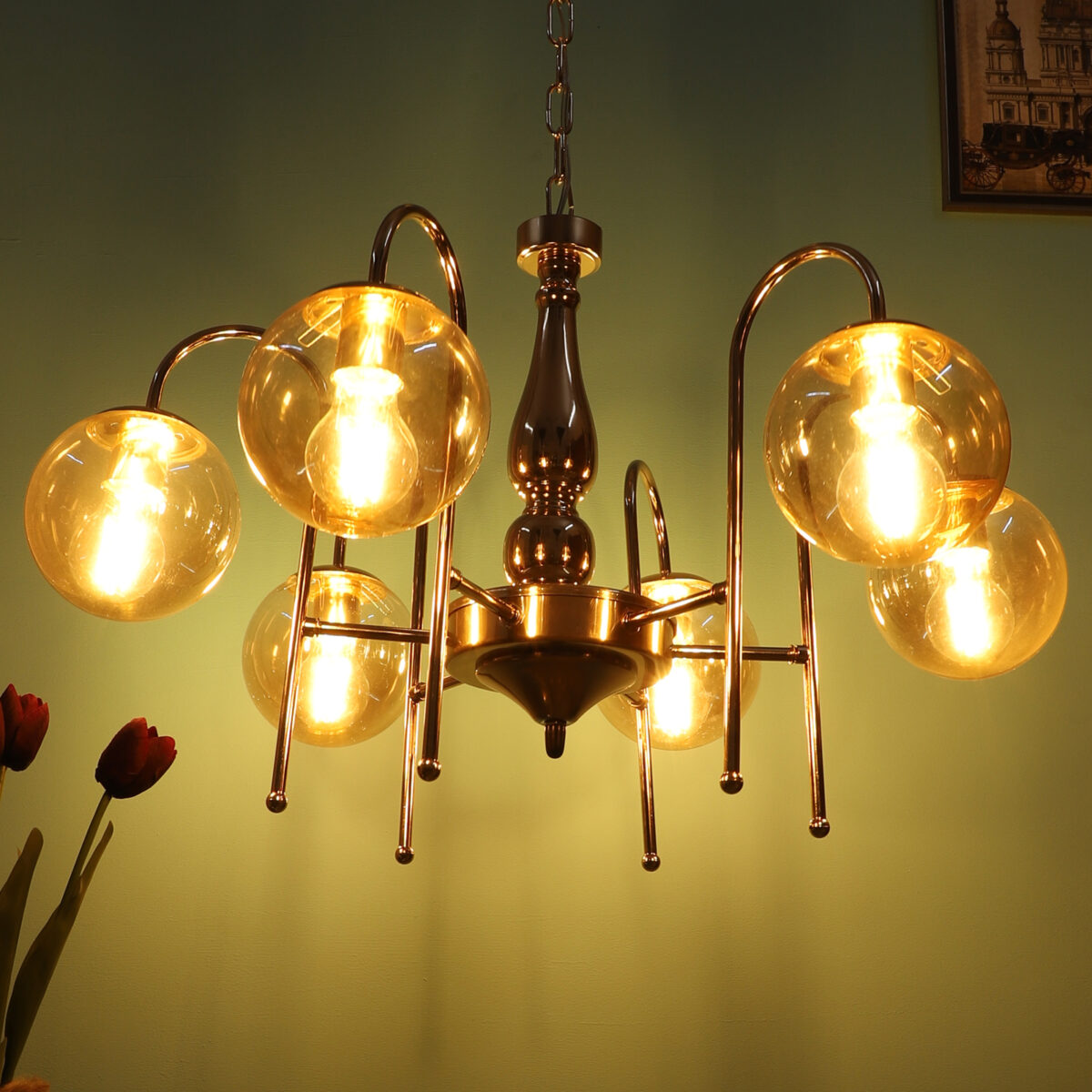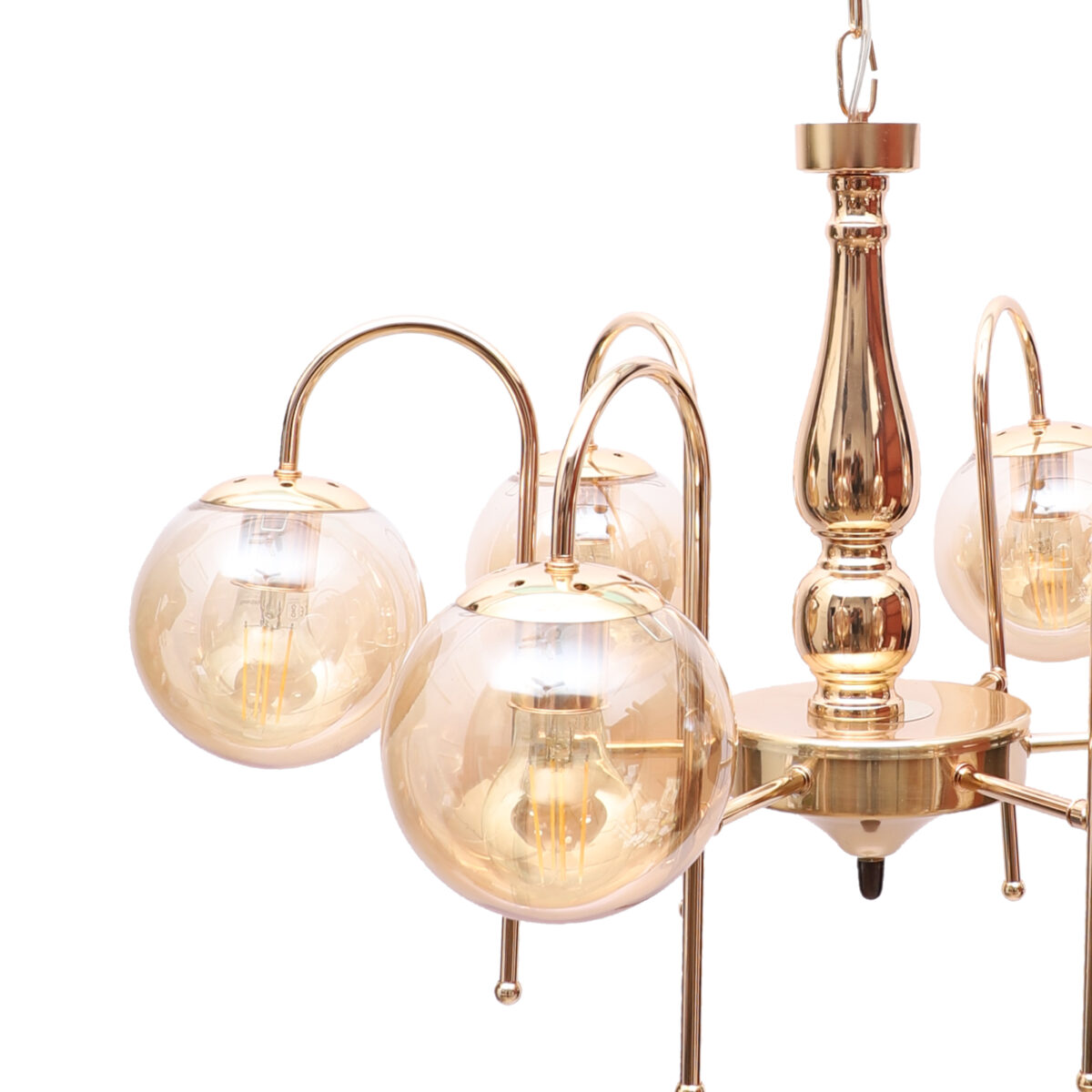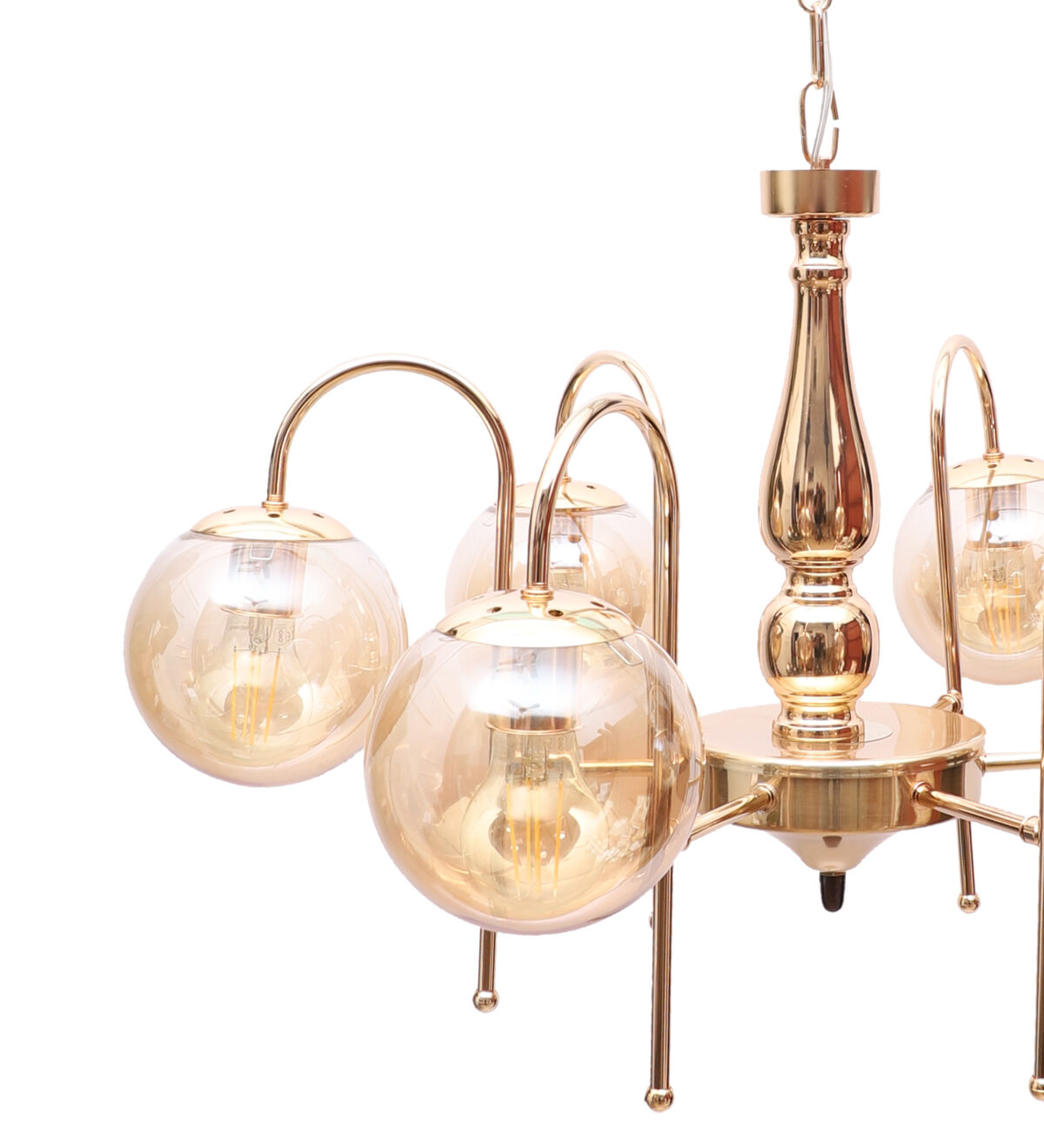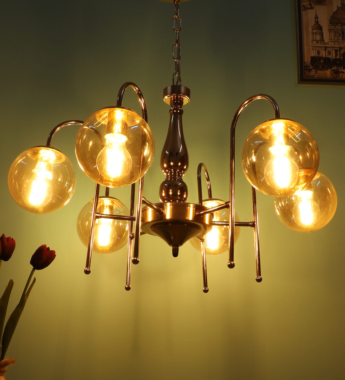 Gold finish chandellier having six lights.The suspension can be adjusted at time of installation to the desired height. It is maintenance free, it is easy to remove glasses and wash them. Comes with an E27 holder.Can be customized as per requirement even for small quantities. Other sizes can be made as per reruirement. LAMP NOT INCLUDED.