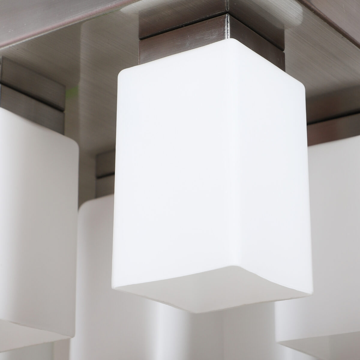 Silver (satin nickel) finish, modern square long glass mounted on a mild steel plate having nine lamps made of mild steel and glass. It is one of the regular design which is never out of trend and is among one of the best sellers. The suspension can be adjusted at time of installation to the desired height. It is maintenance free, easy to remove glass and wash them, comes with an E27 holder, only the change of lamp is required, which is available locally everywhere. Application includes both residential and commercial premises wherever it matches with your interiors. Other variations (color and size) in hanging light – HL3678, HL3651, HL3652. Related chandeliers – CH188, CH189, CH172, CH173. Matching wall light code – Wl1894, WL1895, WL1896, WL1897, WL1898, WL1899. Lamp not included.