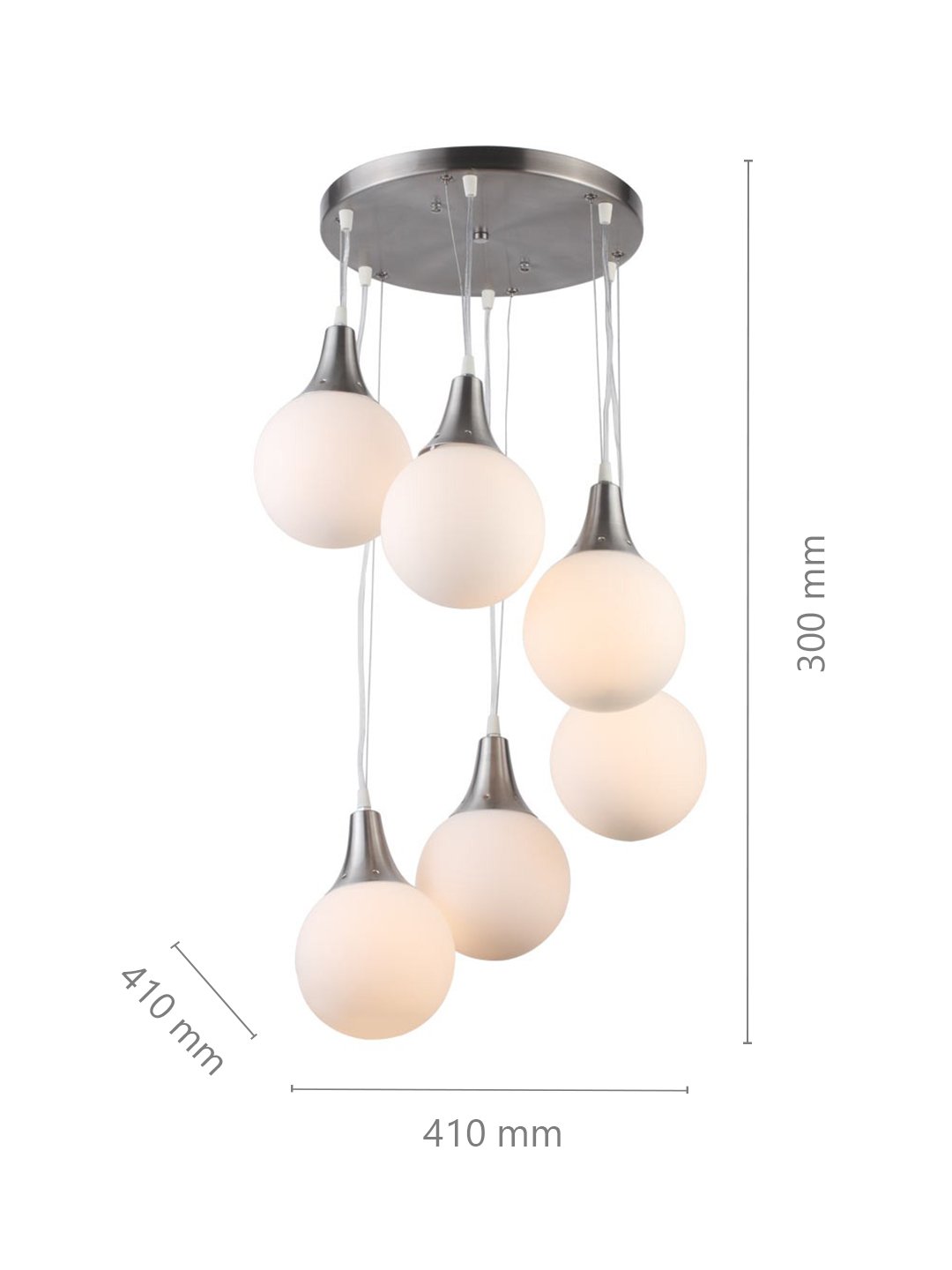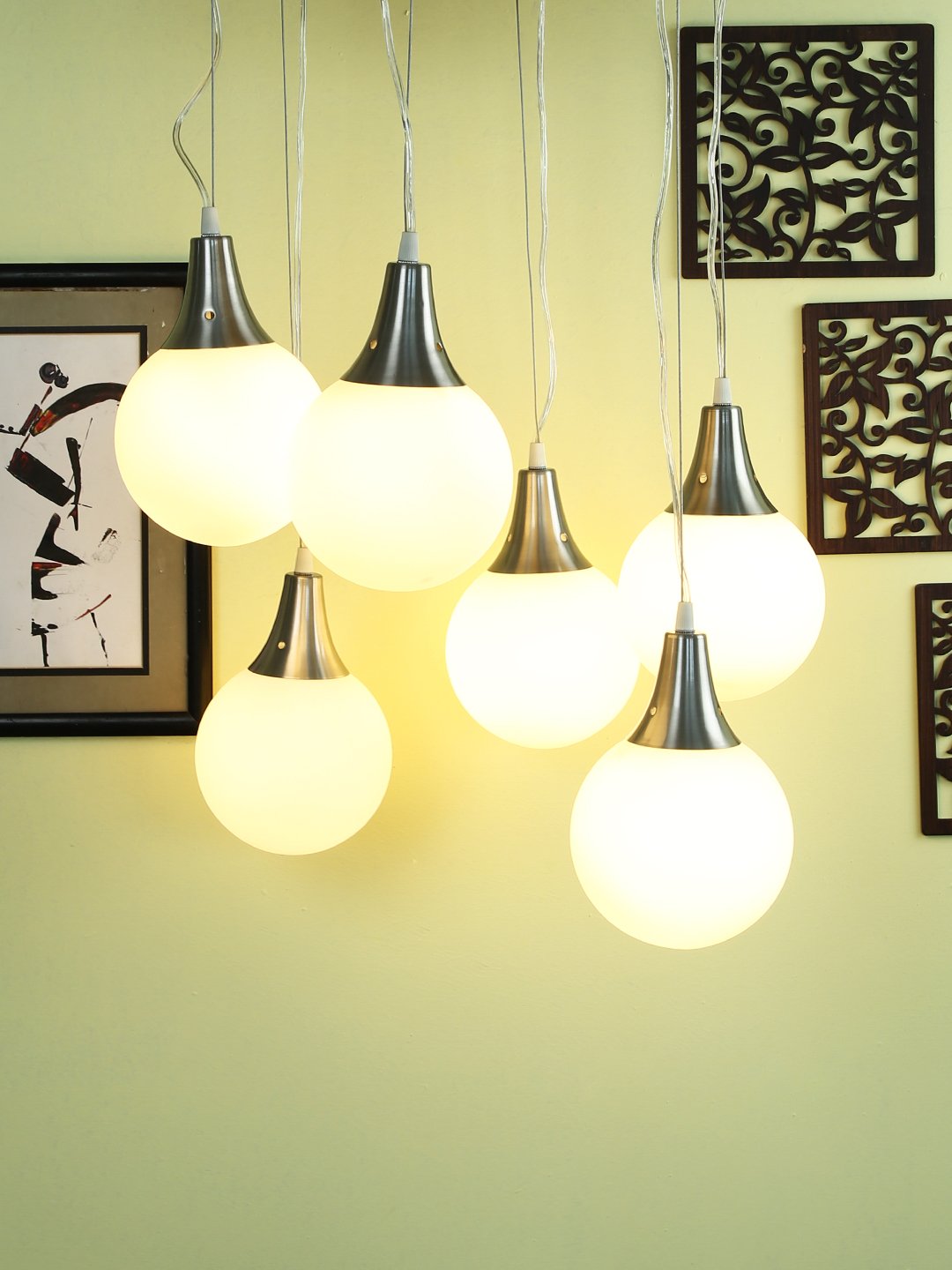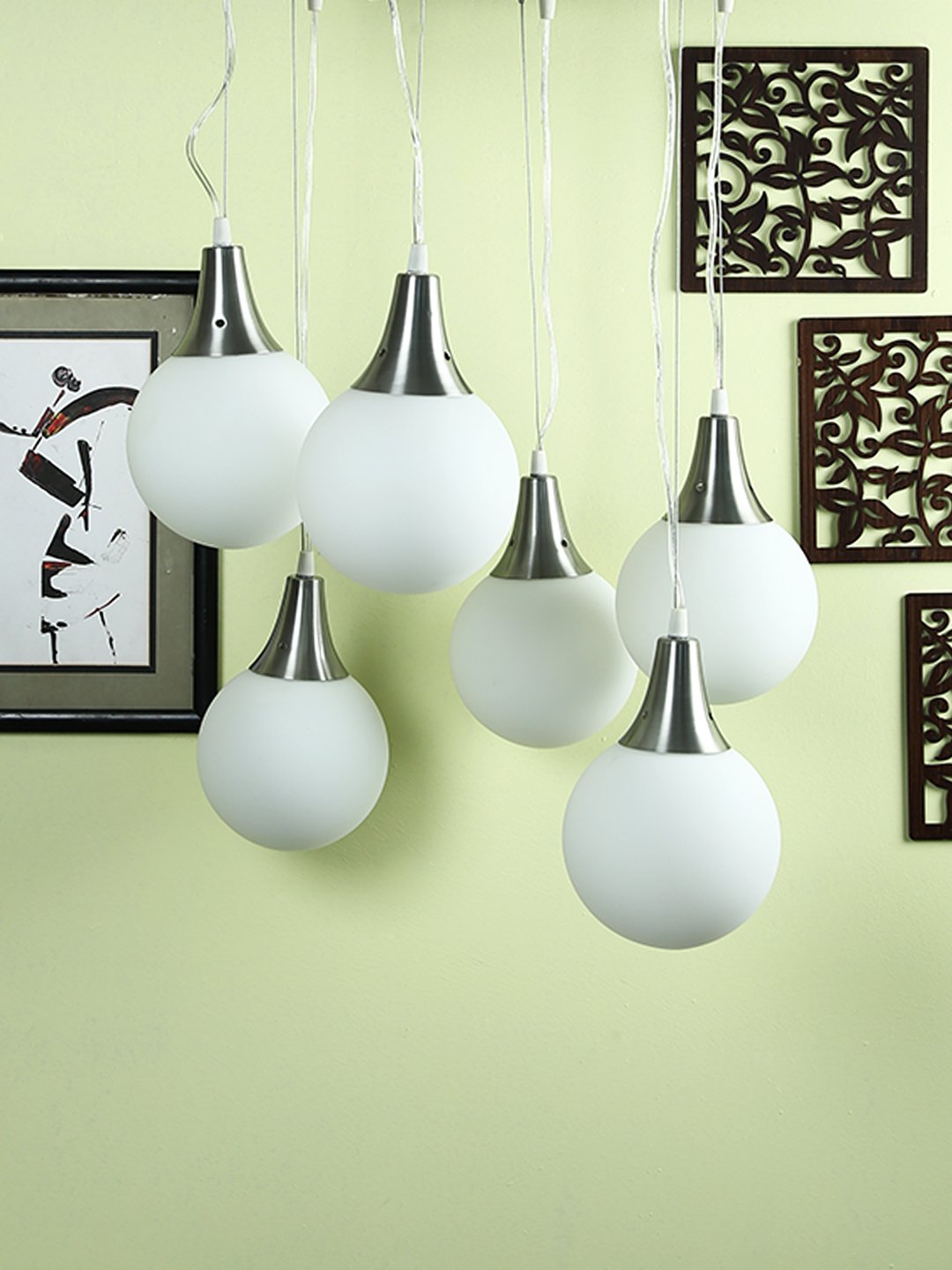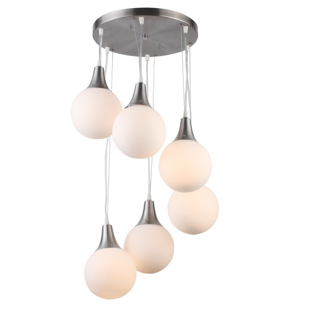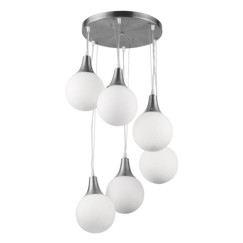 Silver (satin nickel) finish, modern doom (globe) glass cluster hanging light having six lamps made of mild steel and glass. It is one of the regular design which is never out of trend. The suspension can be adjusted at time of installation to the desired height. It is maintenance free, easy to remove glass and wash them, comes with an E27 holder, only the change of lamp is required, which is available locally everywhere. Application includes both residential and commercial premises wherever it matches with your interiors. Matching wall light code – Wl1262, WL1272. Can be customized as per requirement in case of bulk quantities. Lamp not included.