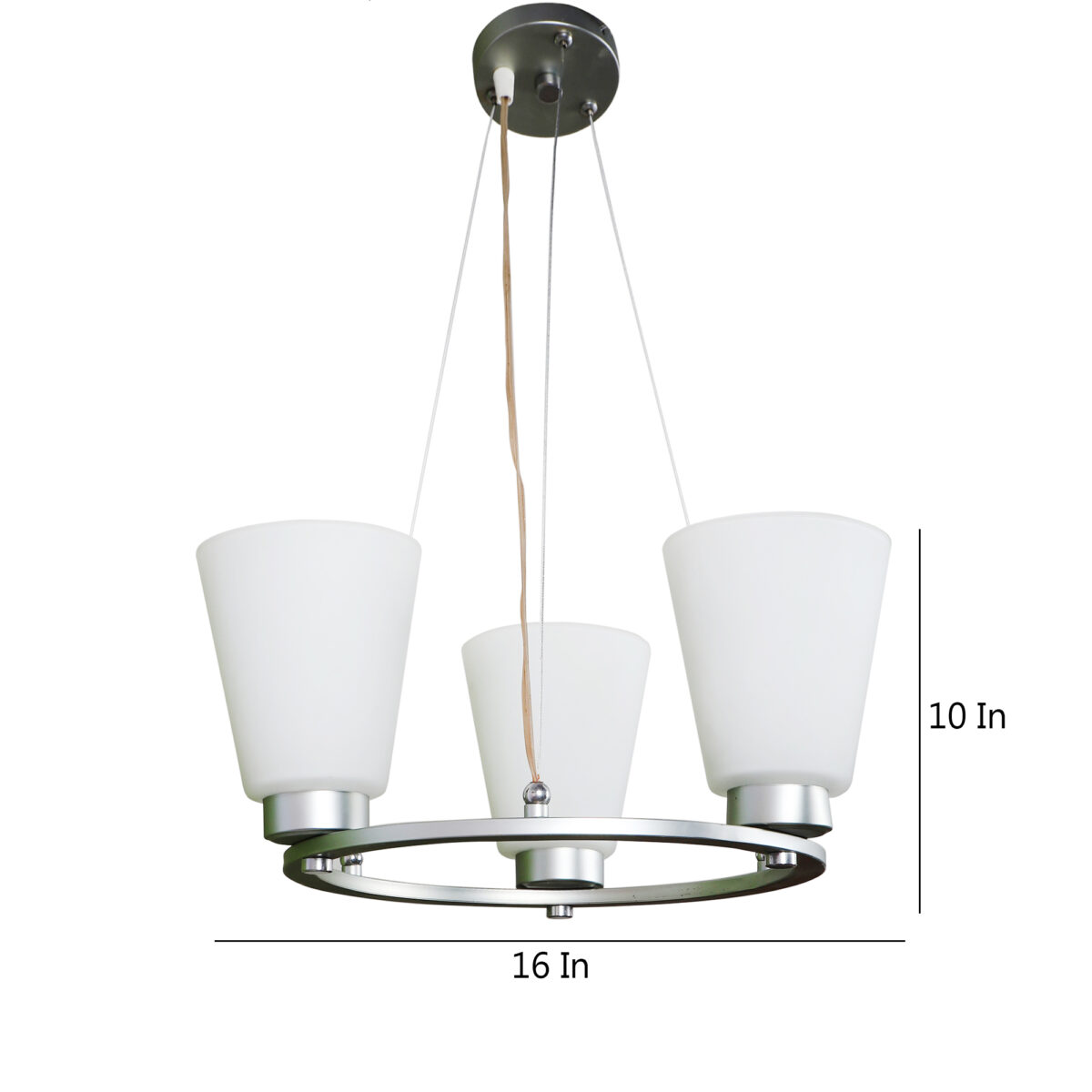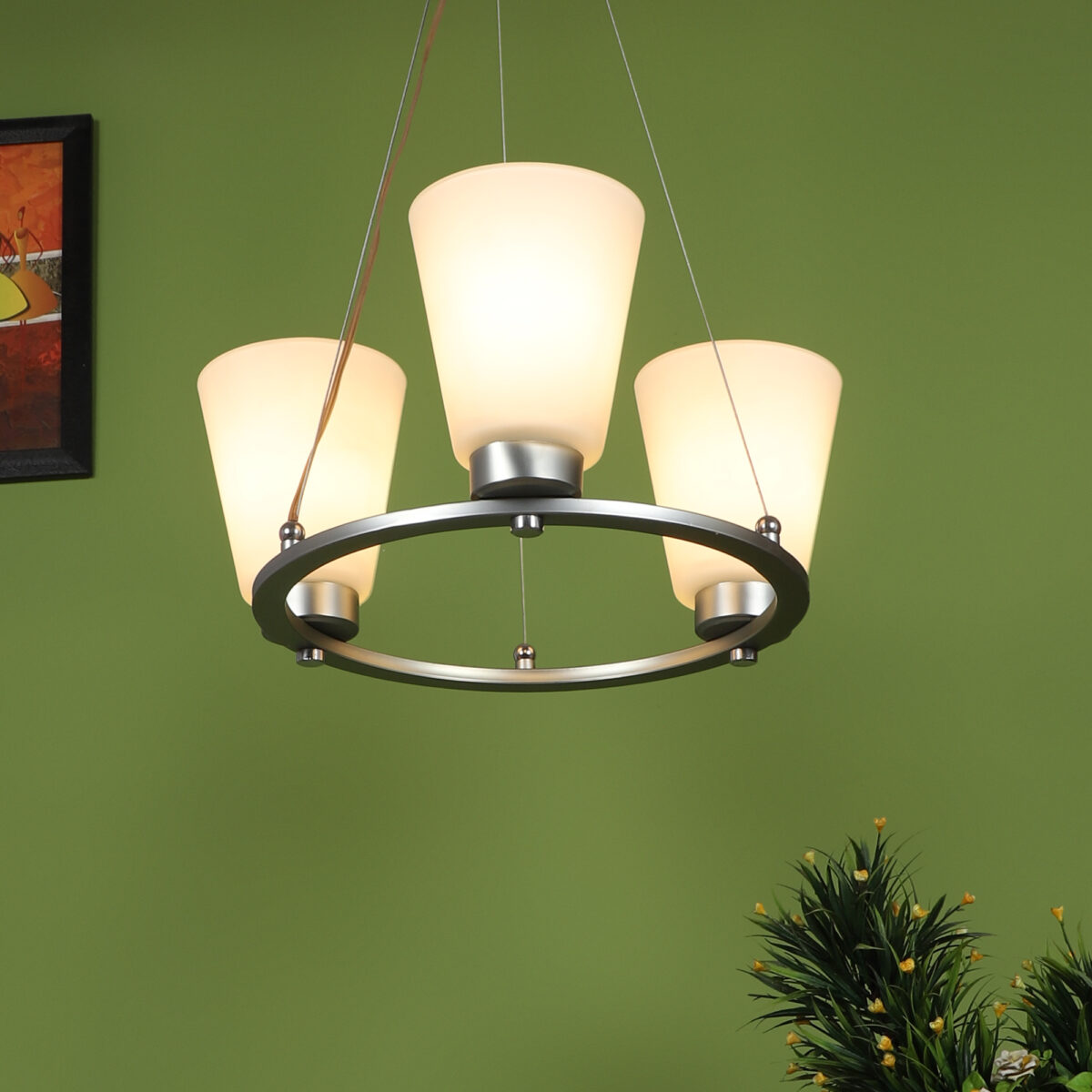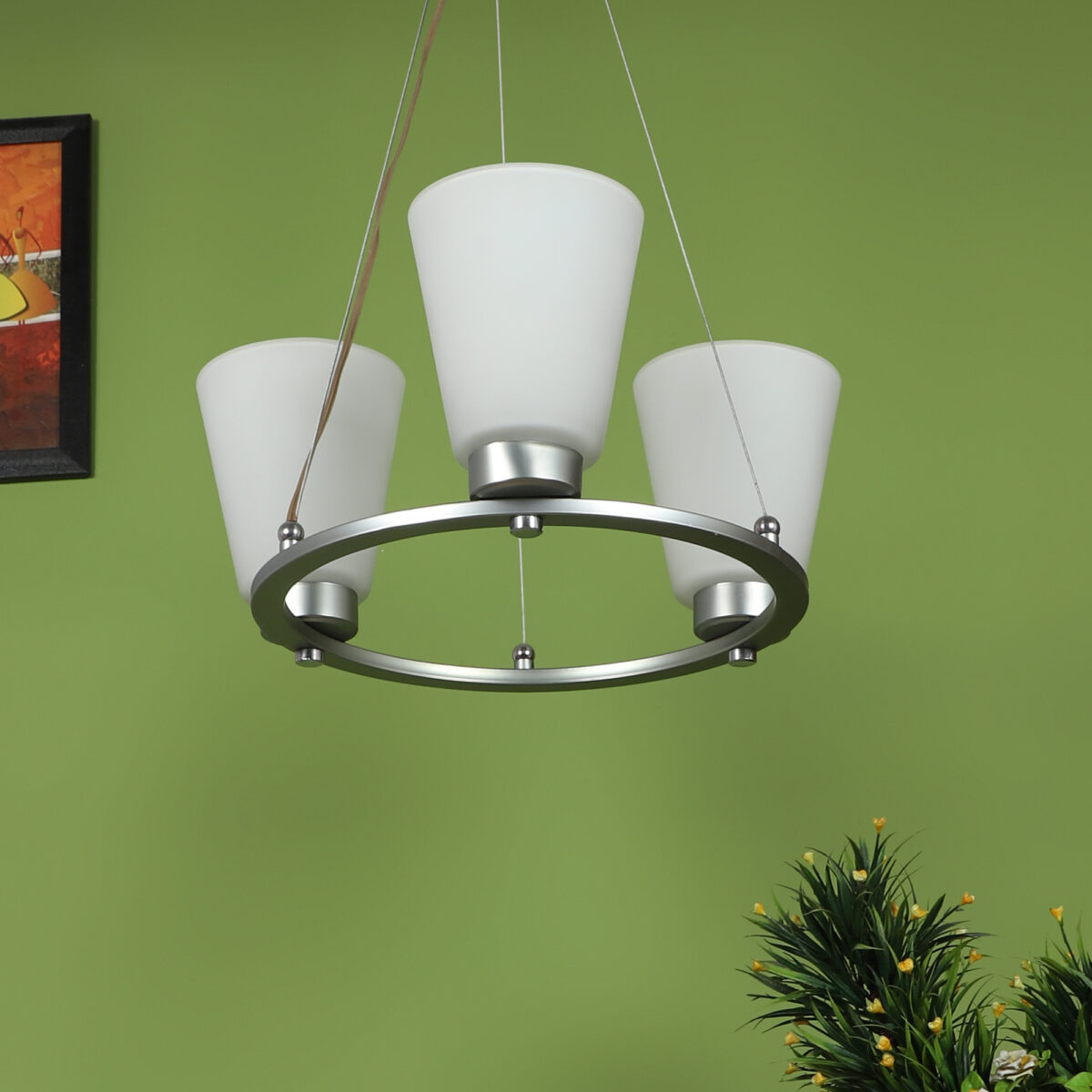 Silver (satin nickel) finish, modern taper long glass mounted on a mild steel ring having three lamps made of mild steel and glass. It is one of the regular design which is never out of trend. The suspension can be adjusted at time of installation to the desired height. It is maintenance free, easy to remove glass and wash them, comes with an E27 holder, only the change of lamp is required, which is available locally everywhere. Application includes both residential and commercial premises wherever it matches with your interiors. Lamp not included.