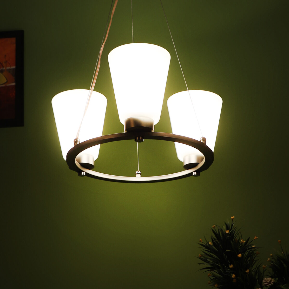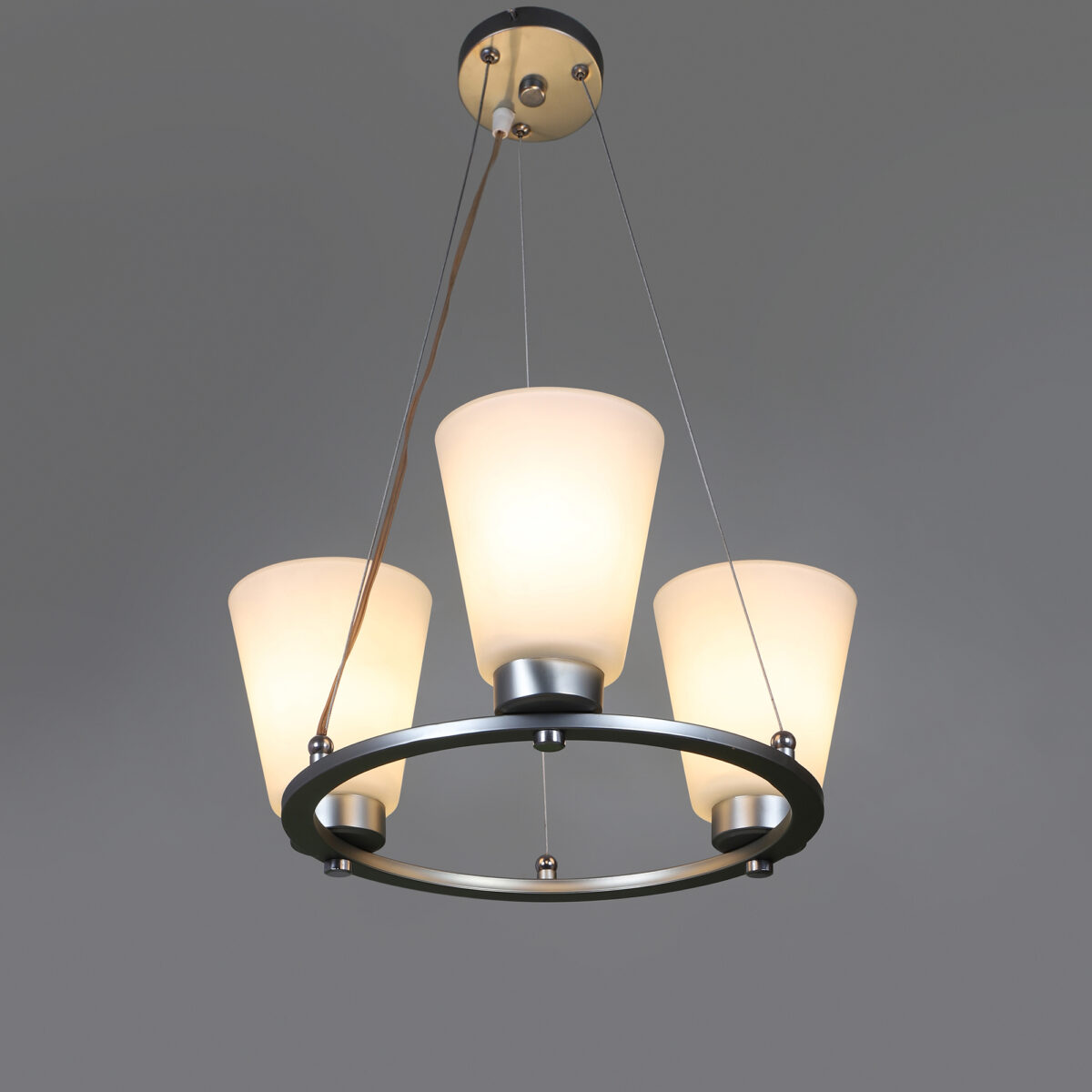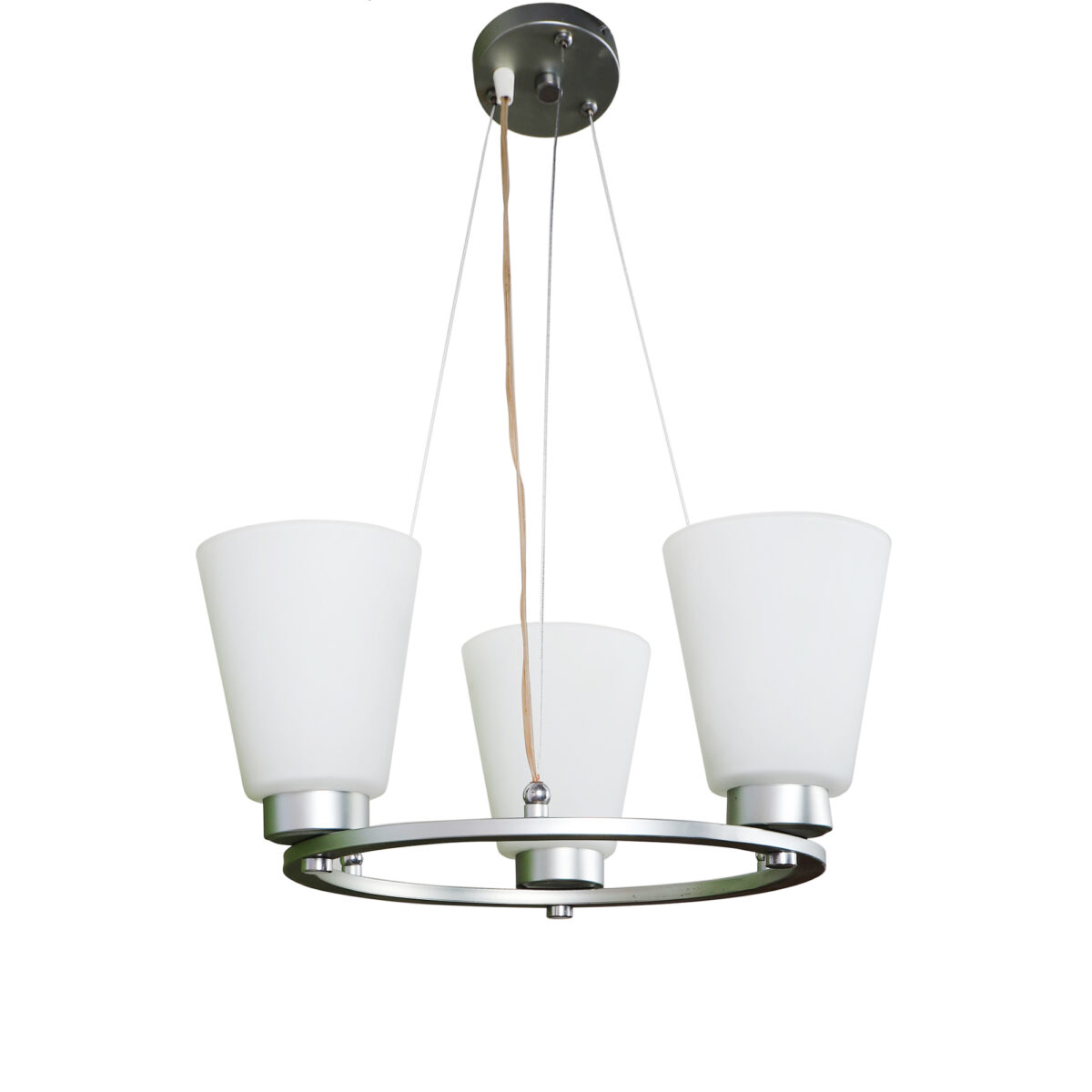 Silver (satin nickel) finish, modern taper long glass mounted on a mild steel ring having three lamps made of mild steel and glass. It is one of the regular design which is never out of trend. The suspension can be adjusted at time of installation to the desired height. It is maintenance free, easy to remove glass and wash them, comes with an E27 holder, only the change of lamp is required, which is available locally everywhere. Application includes both residential and commercial premises wherever it matches with your interiors. Lamp not included.