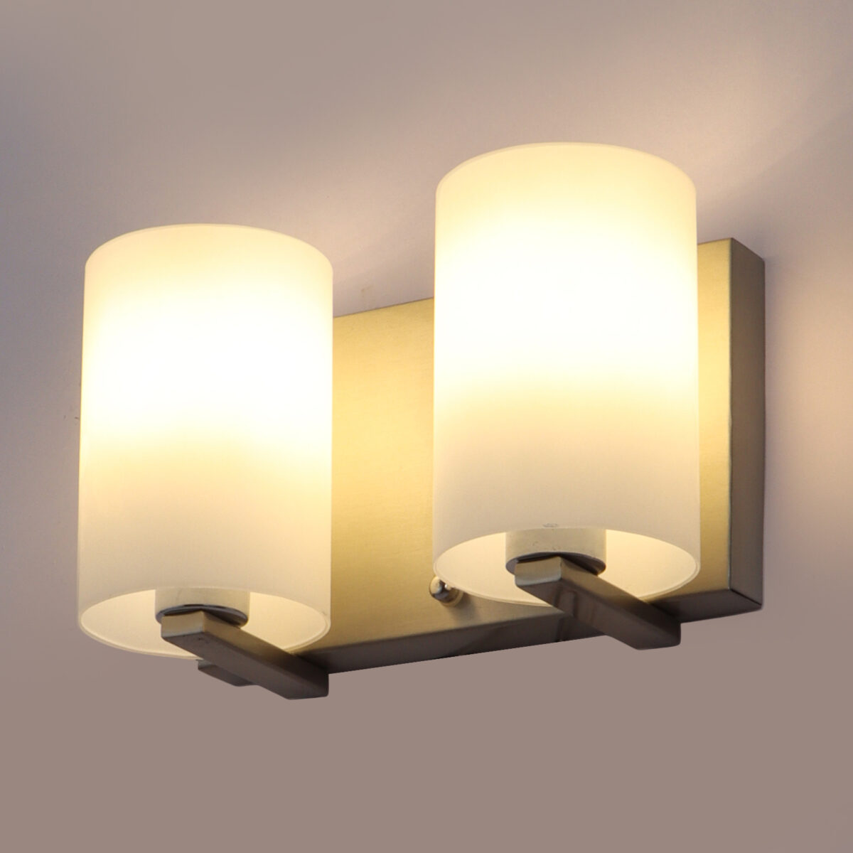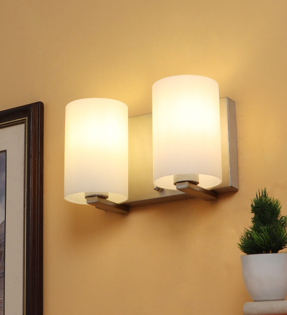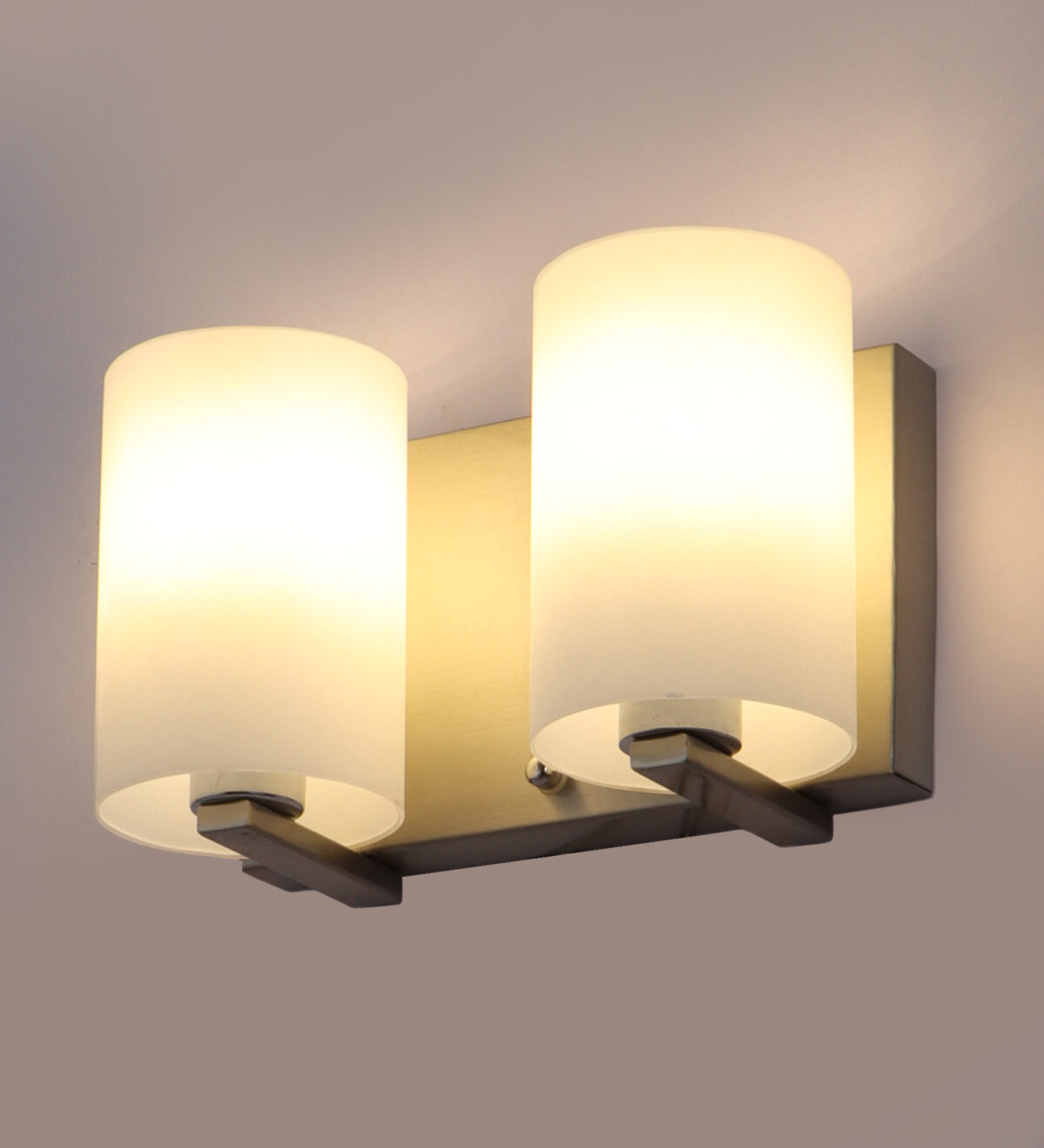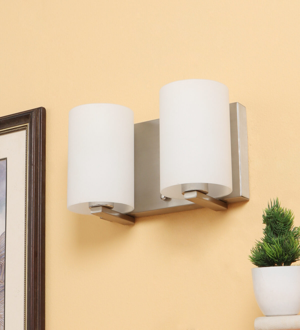 Modern silver (satin nickel) double wall light made of mild steel, with two big round cylindrical white glasses. It is maintenance free, glass is open from both the sides that prevents any dust collection, easy to remove glass and wash it, comes with an E27 holder, only the change of lamp is required, which is available locally everywhere. You can of course swap out the bulb for one that is dimmable, has a higher light output or a different color temperature. Application includes both residential and commercial premises wherever it matches with your interiors. Matching single wall light code – WL1660. Matching hanging light – HL3857-1, HL3857-3. It is one of the top selling product in our catalogue. Can be customized as per requirement in case of bulk quantities. Lamp not included.