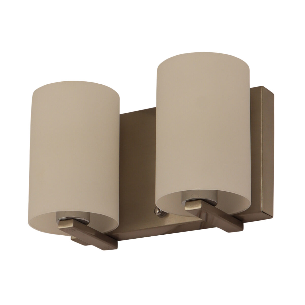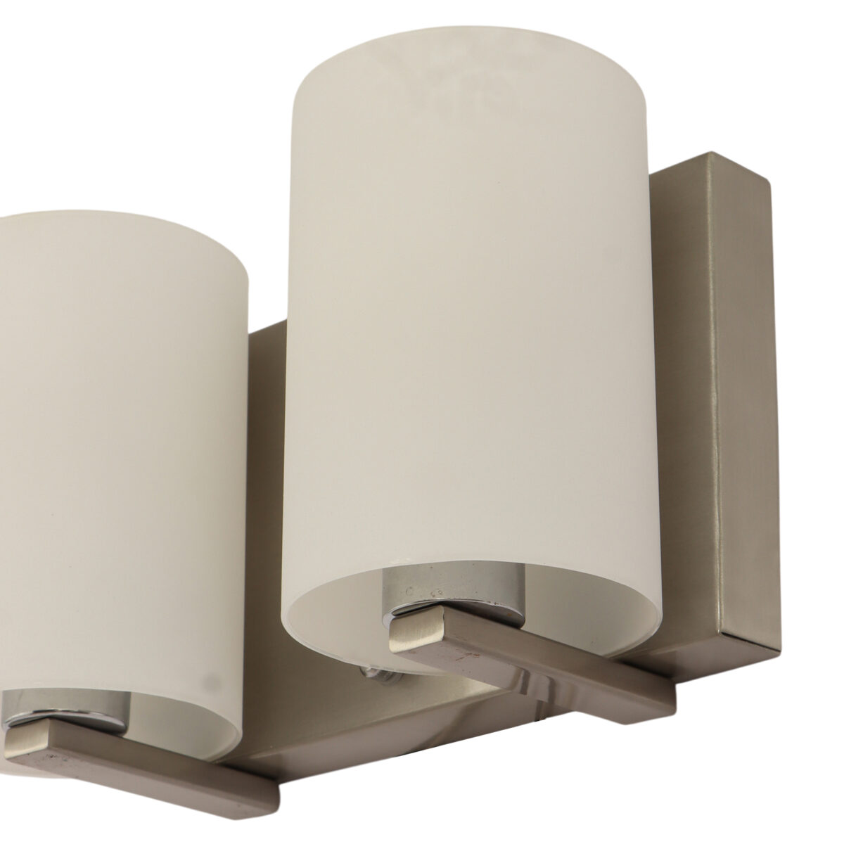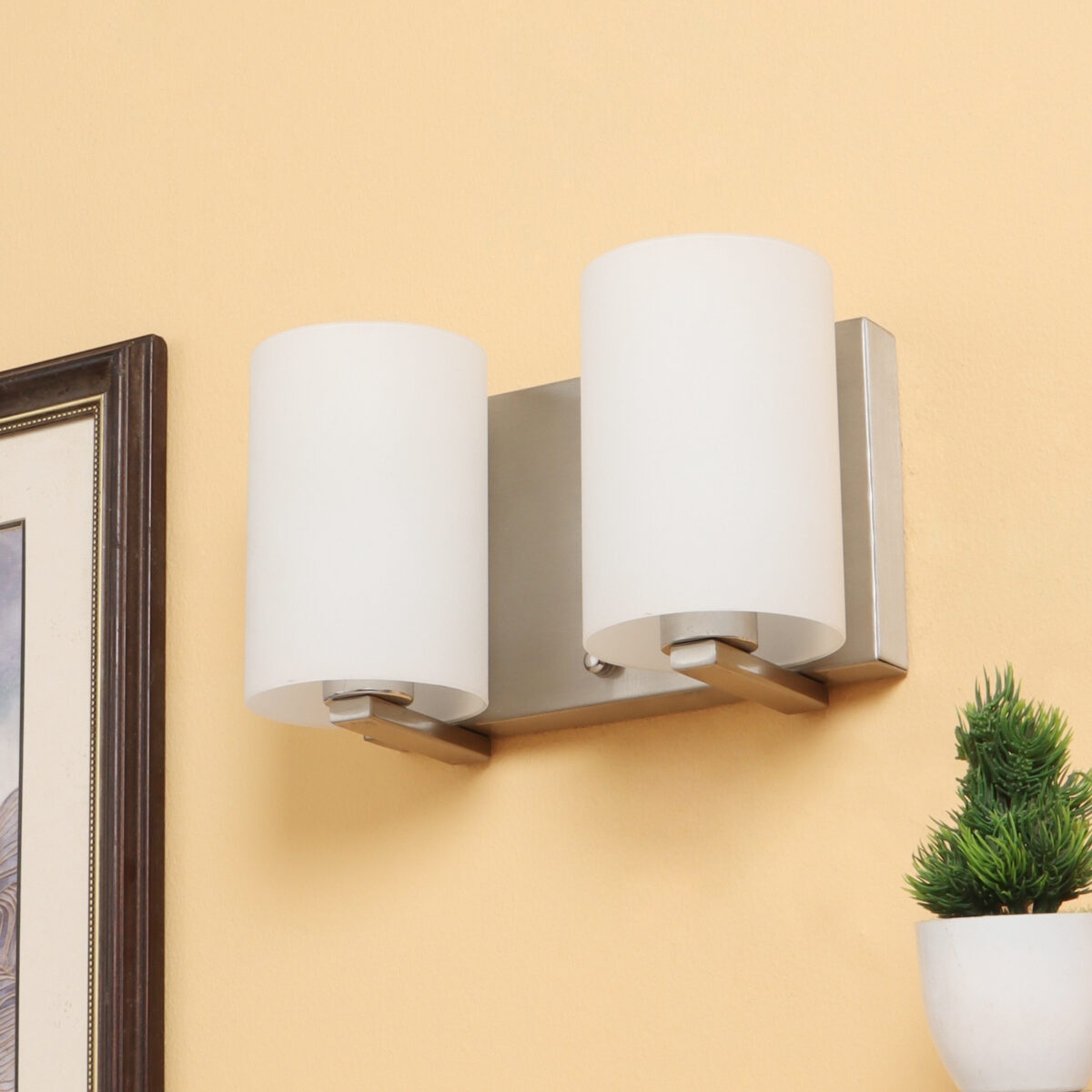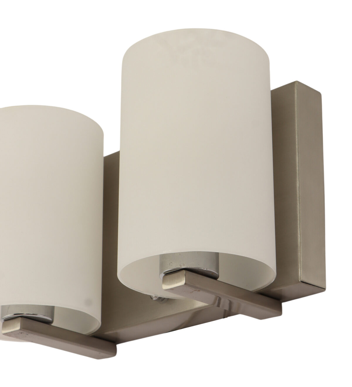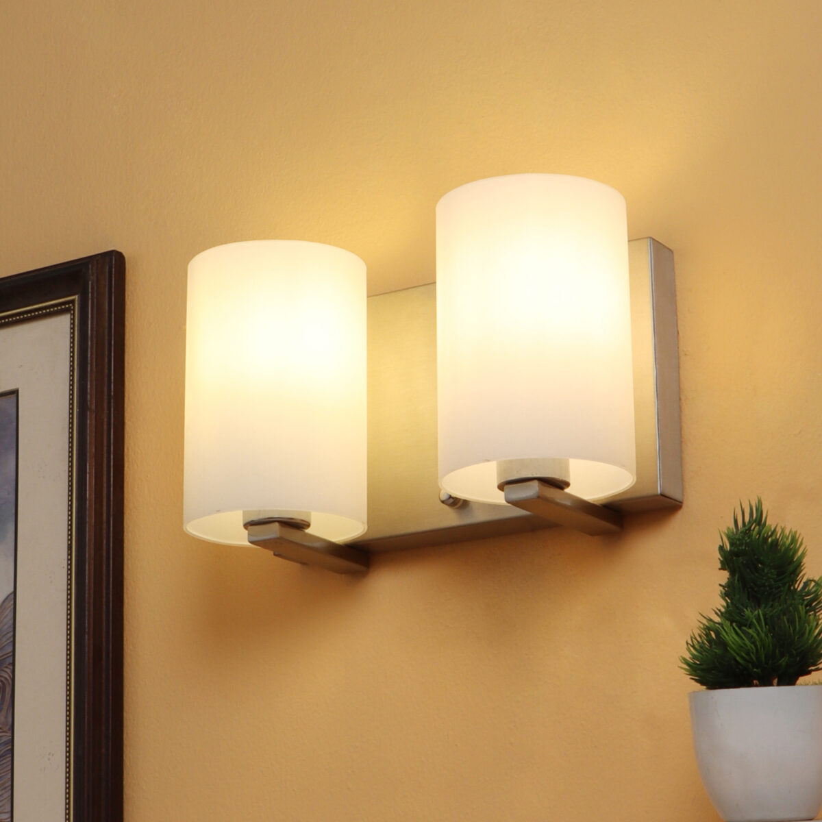Modern silver (satin nickel) double wall light made of mild steel, with two big round cylindrical white glasses. It is maintenance free, glass is open from both the sides that prevents any dust collection, easy to remove glass and wash it, comes with an E27 holder, only the change of lamp is required, which is available locally everywhere. You can of course swap out the bulb for one that is dimmable, has a higher light output or a different color temperature. Application includes both residential and commercial premises wherever it matches with your interiors. Matching single wall light code – WL1660. Matching hanging light – HL3857-1, HL3857-3. It is one of the top selling product in our catalogue. Can be customized as per requirement in case of bulk quantities. Lamp not included.