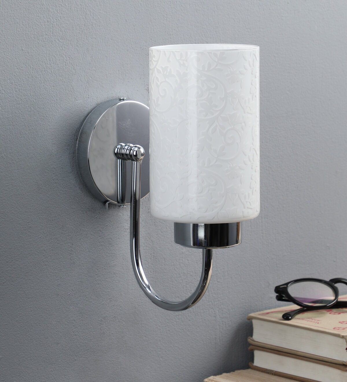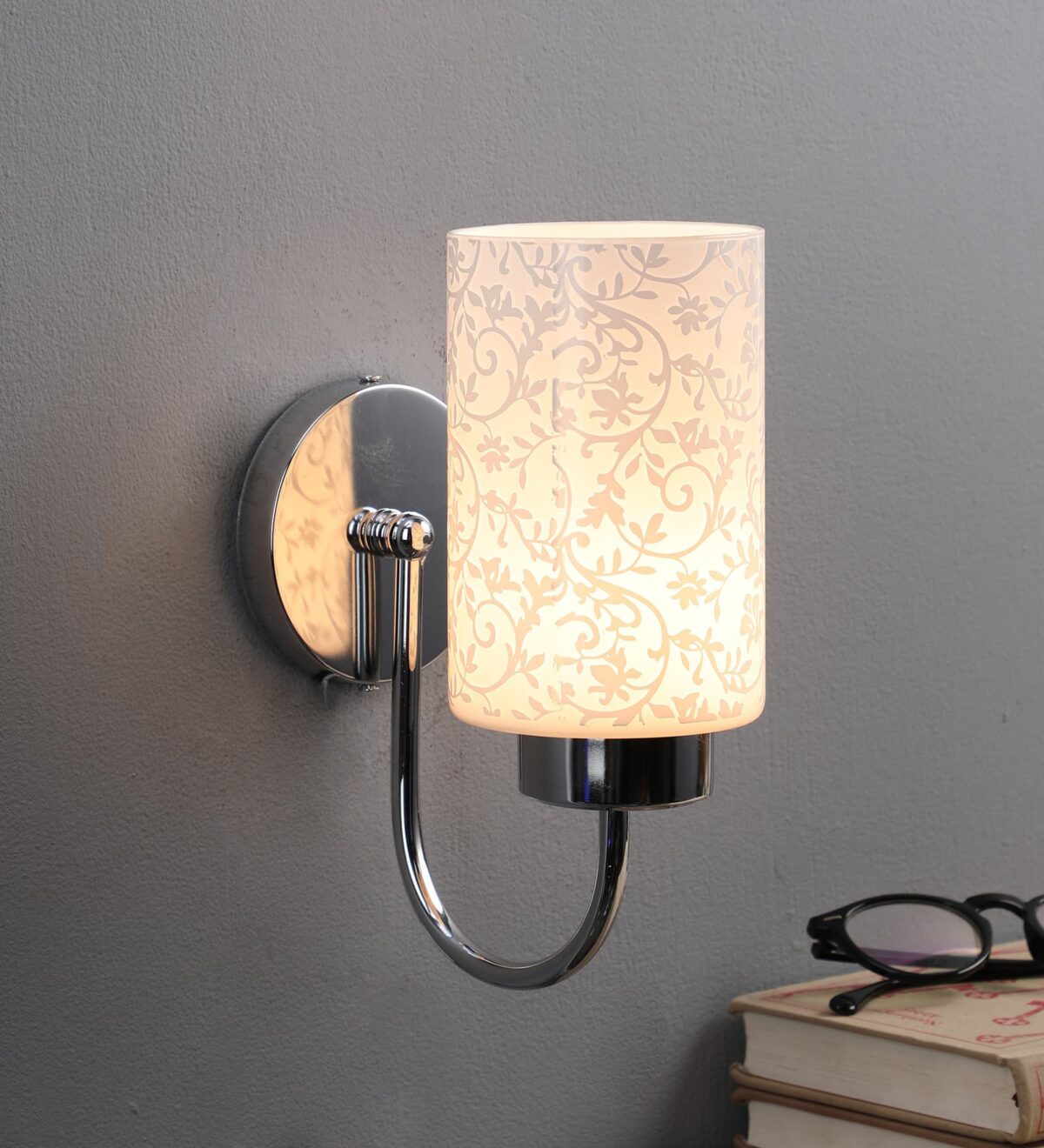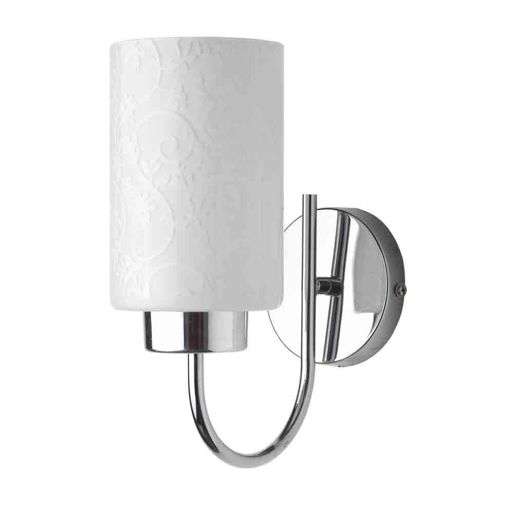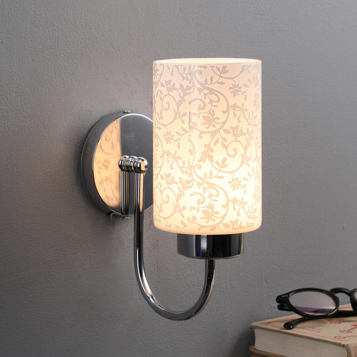 Modern silver (chrome) single wall light made of mild steel with a round cylindrical glass with floral design, which looks amazing when lit. It is maintenance free, easy to remove glass and wash it, comes with an E27 holder, only the change of lamp is required, which is available locally everywhere. You can of course swap out the bulb for one that is dimmable, has a higher light output or a different color temperature. Application includes both residential and commercial premises wherever it matches with your interiors. Matching double wall light code – WL1794. Looks good in down facing direction also. Can be customized as per requirement in case of bulk quantities. Lamp not included.