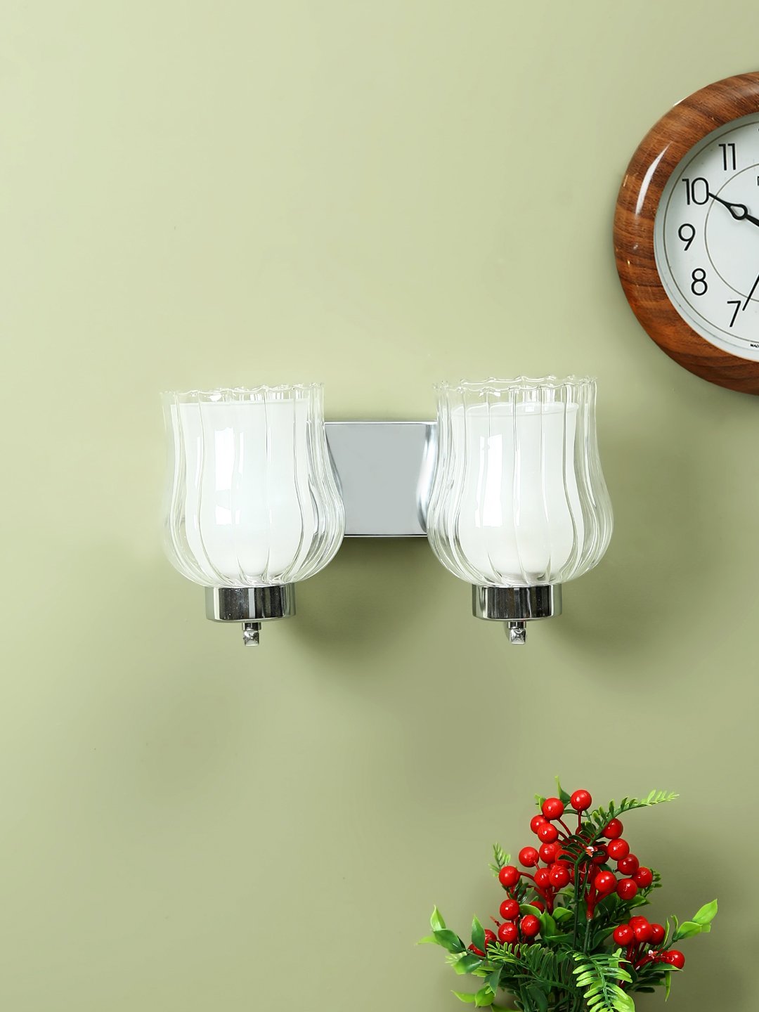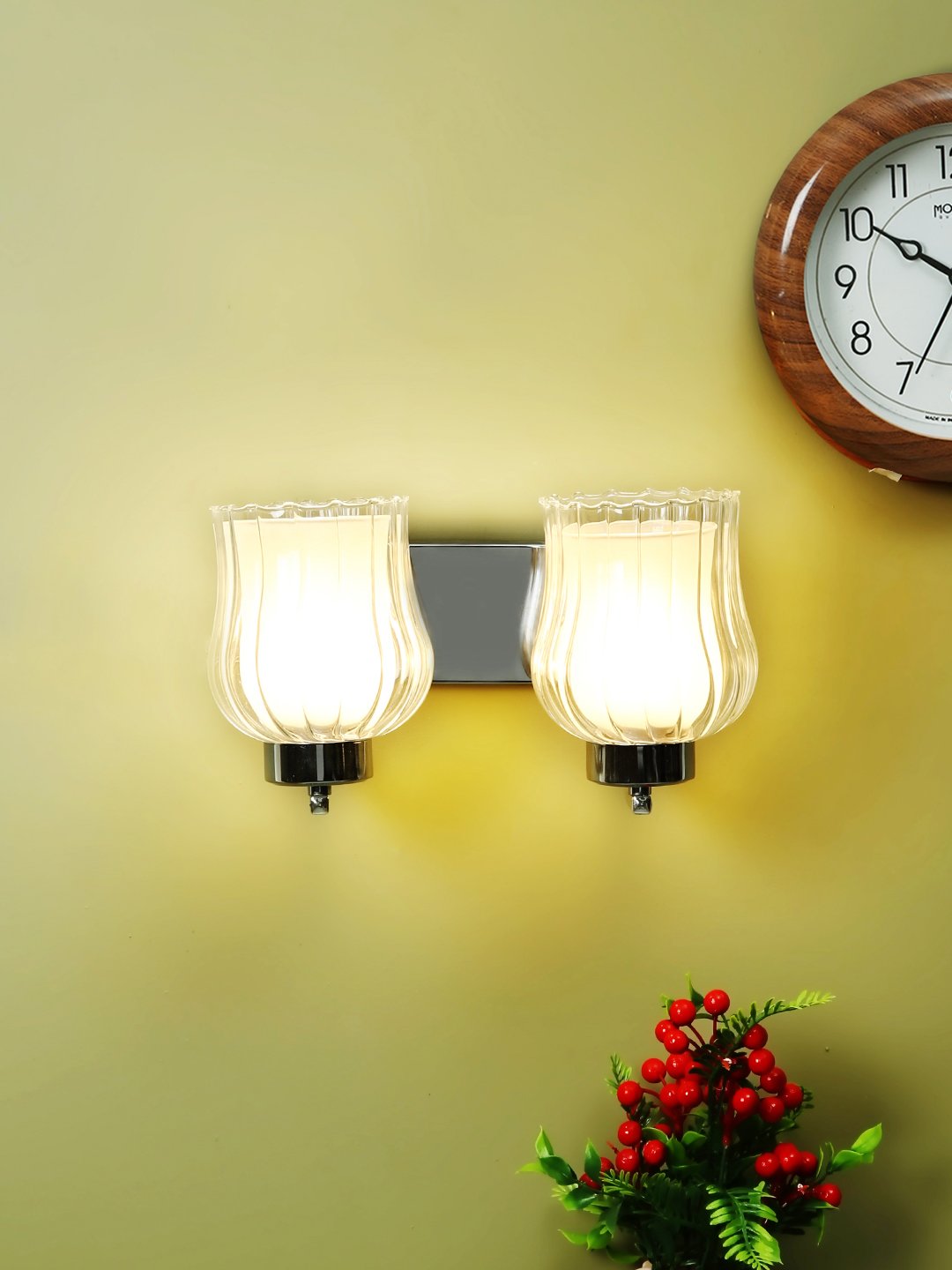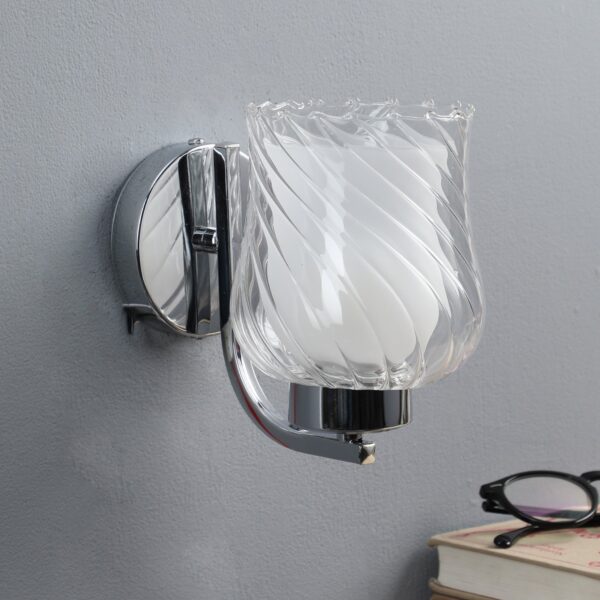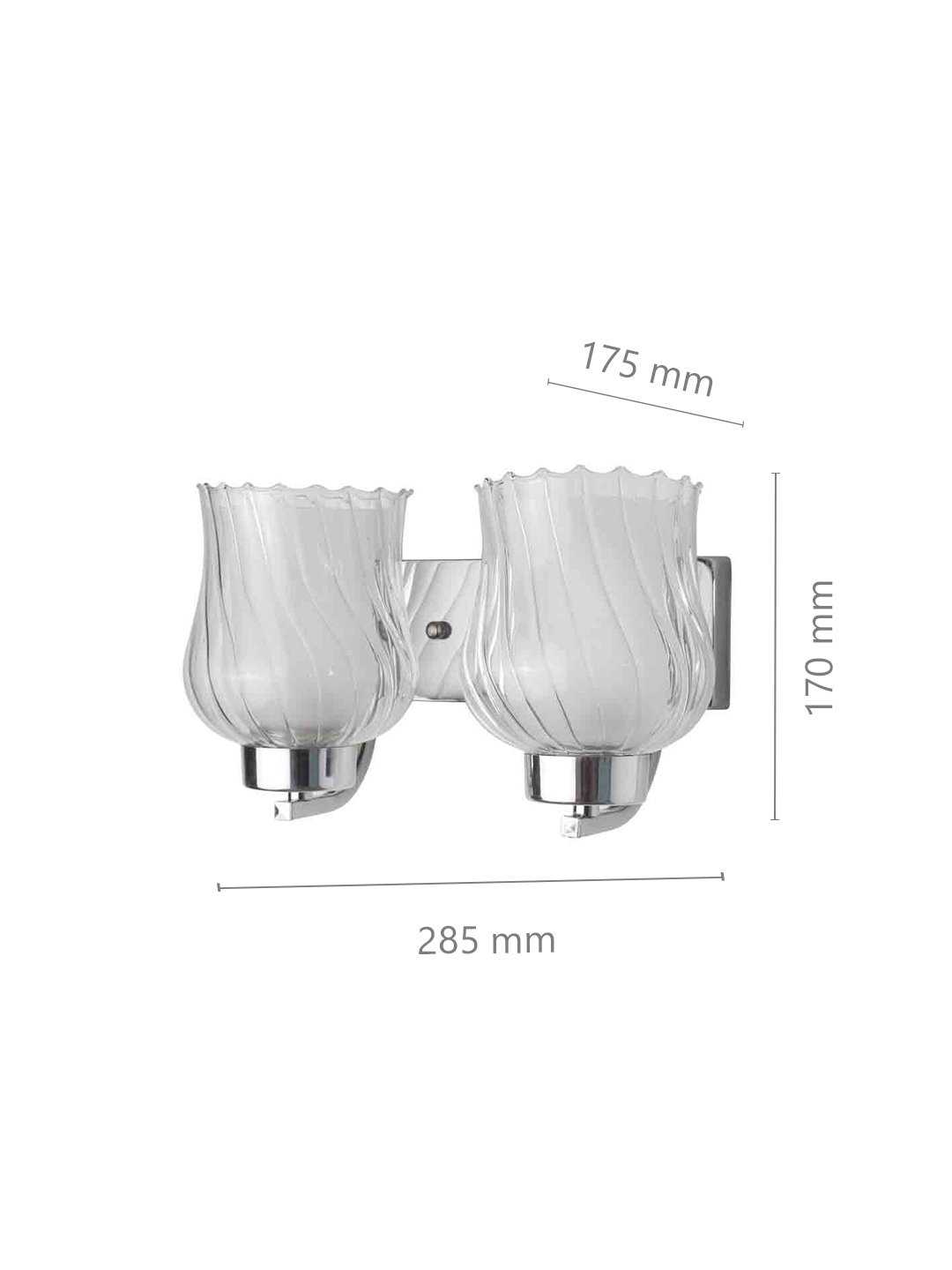 Modern silver (chrome) double wall light made of mild steel with bell shaped double layered glasses. It is maintenance free, easy to remove glass and wash it, comes with an E27 holder, only the change of lamp is required, which is available locally everywhere. You can of course swap out the bulb for one that is dimmable, has a higher light output or a different color temperature. Application includes both residential and commercial premises wherever it matches with your interiors. Matching single wall light code – WL1801. Can be customized as per requirement in case of bulk quantities. Lamp not included.