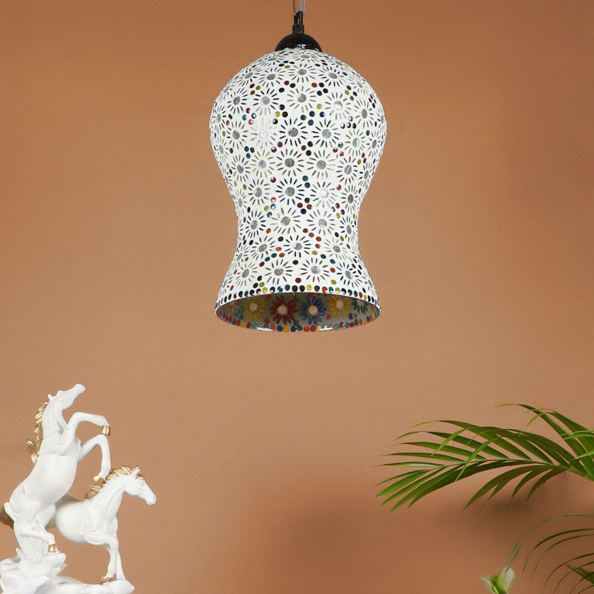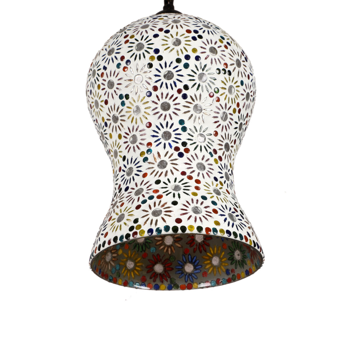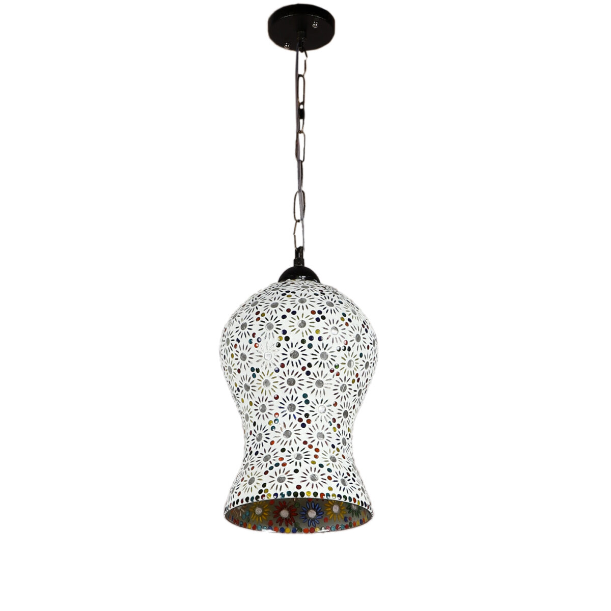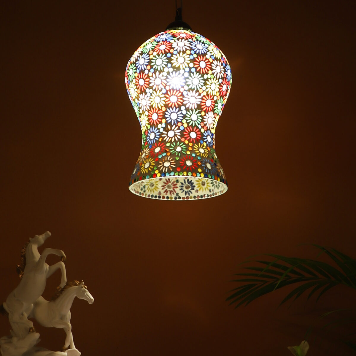 Dark brown (wood) finish, multi colored bell shaped glass, single hanging light made of mild steel and glass. When lit it highlights a colorful floral design. The suspension can be adjusted at time of installation to the desired height. It is maintenance free, easy to remove glass and wash them, comes with an E27 holder, only the change of lamp is required, which is available locally everywhere. Application includes both residential and commercial premises wherever it matches with your interiors. Also available in small size with code HL3843. Can be customized as per requirement in case of bulk quantities. Lamp not included.