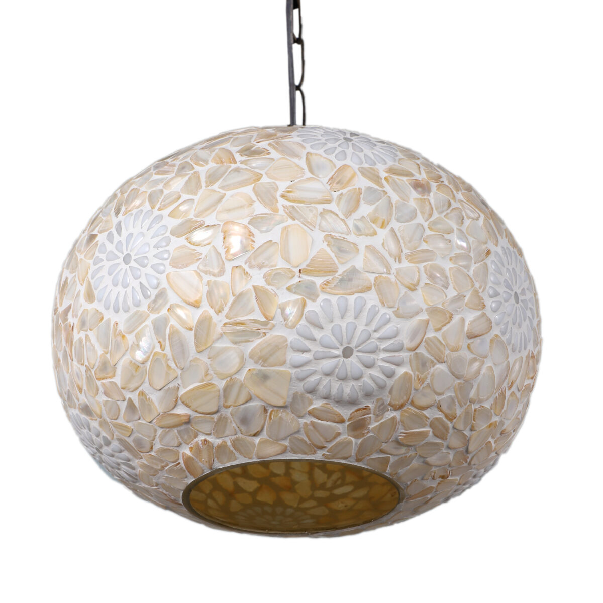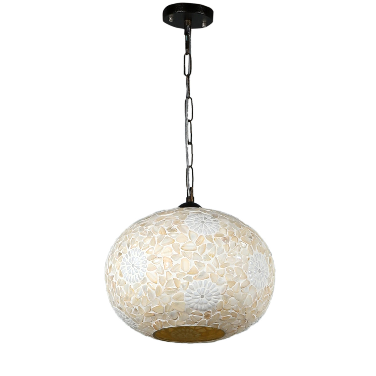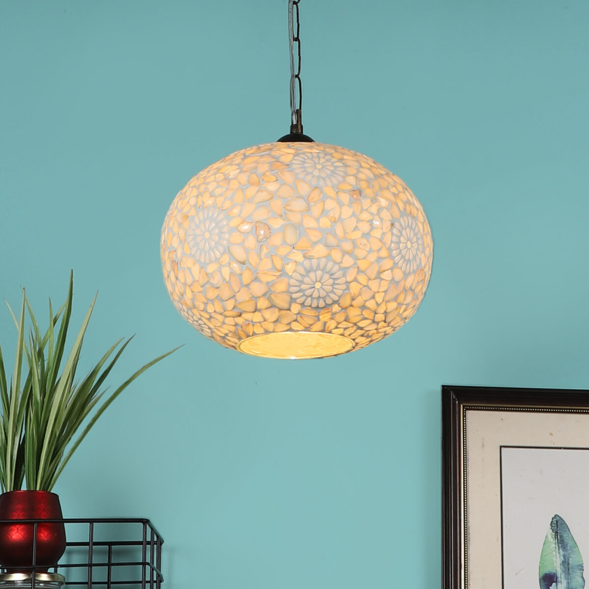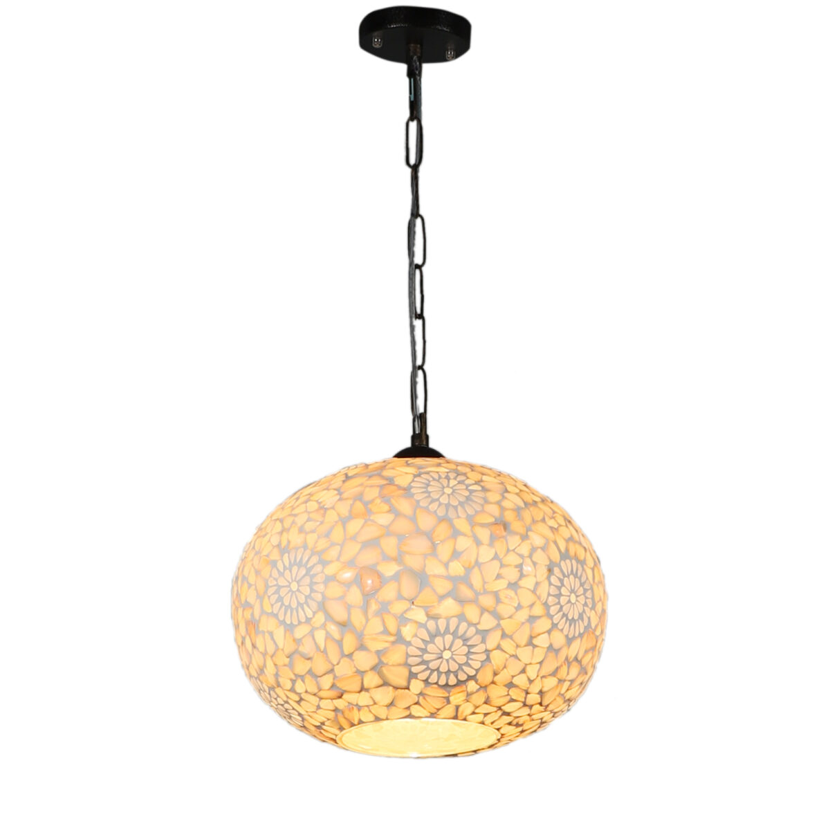 Dark brown (wood) finish, multi colored big doom shaped glass, single hanging light made of mild steel and glass. When lit it highlights a colorful geometric / floral design. The suspension can be adjusted at time of installation to the desired height. It is maintenance free, easy to remove glass and wash them, comes with an E27 holder, only the change of lamp is required, which is available locally everywhere. Application includes both residential and commercial premises wherever it matches with your interiors. Can be customized as per requirement in case of bulk quantities. Lamp not included.