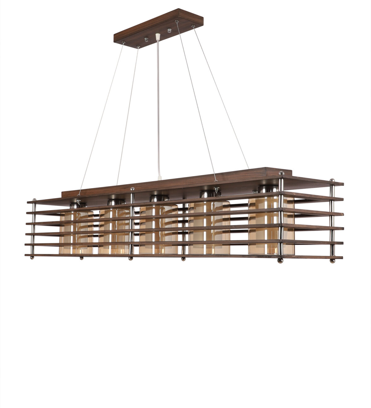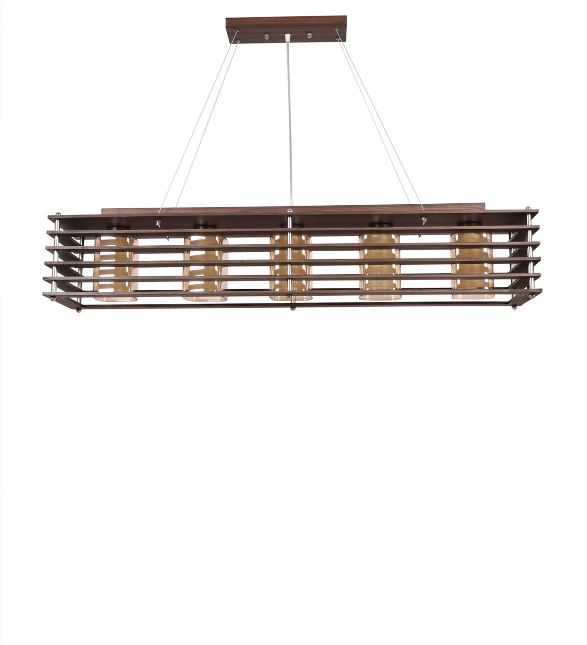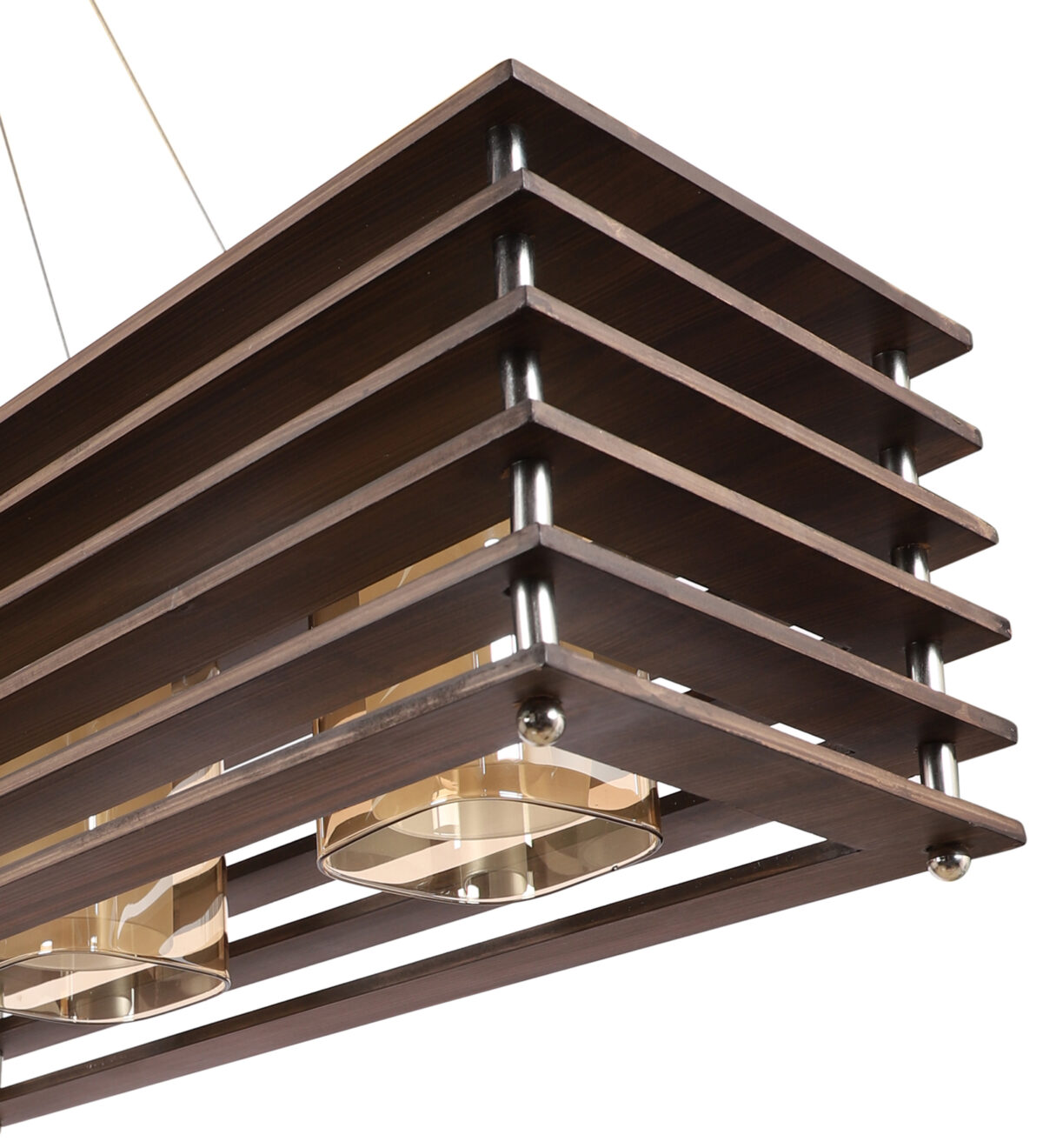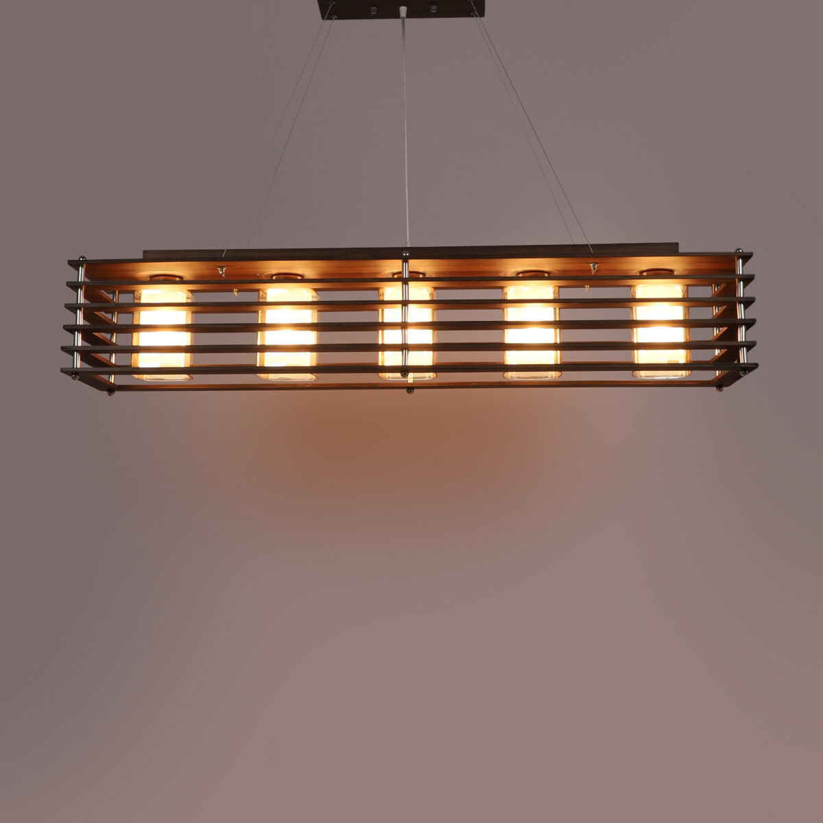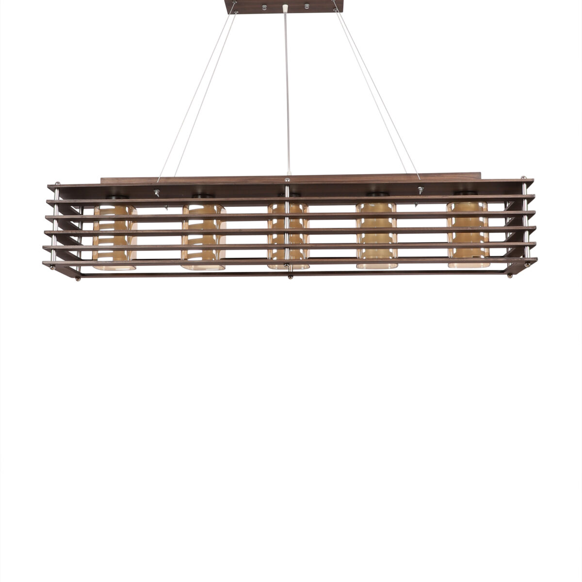 Dark brown (wood) finish, rectangular hanging light with five lamps, made of wood, mild steel having long square two layered champaign coloured glass. It is one of the highest selling design which is never out of trend. The suspension can be adjusted at time of installation to the desired height. It is maintenance free, easy to remove glass and wash them, comes with an E27 holder, only the change of lamp is required, which is available locally everywhere. Application includes both residential and commercial premises wherever it matches with your interiors. Can be customized as per requirement in case of bulk quantities. Matching wall light code – WL2357, WL2358. LAMPS NOT INCLUDED.