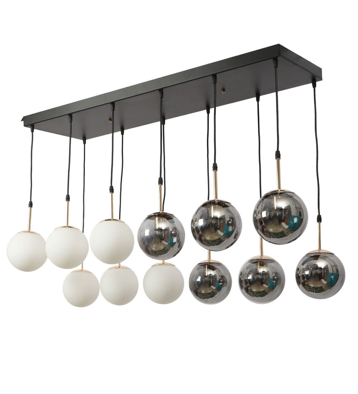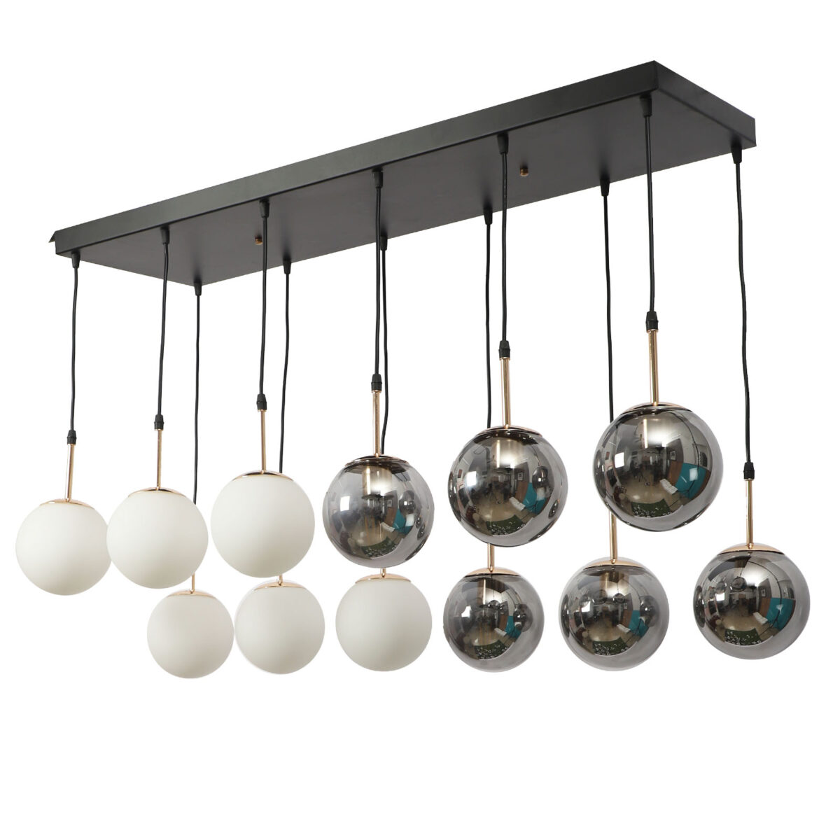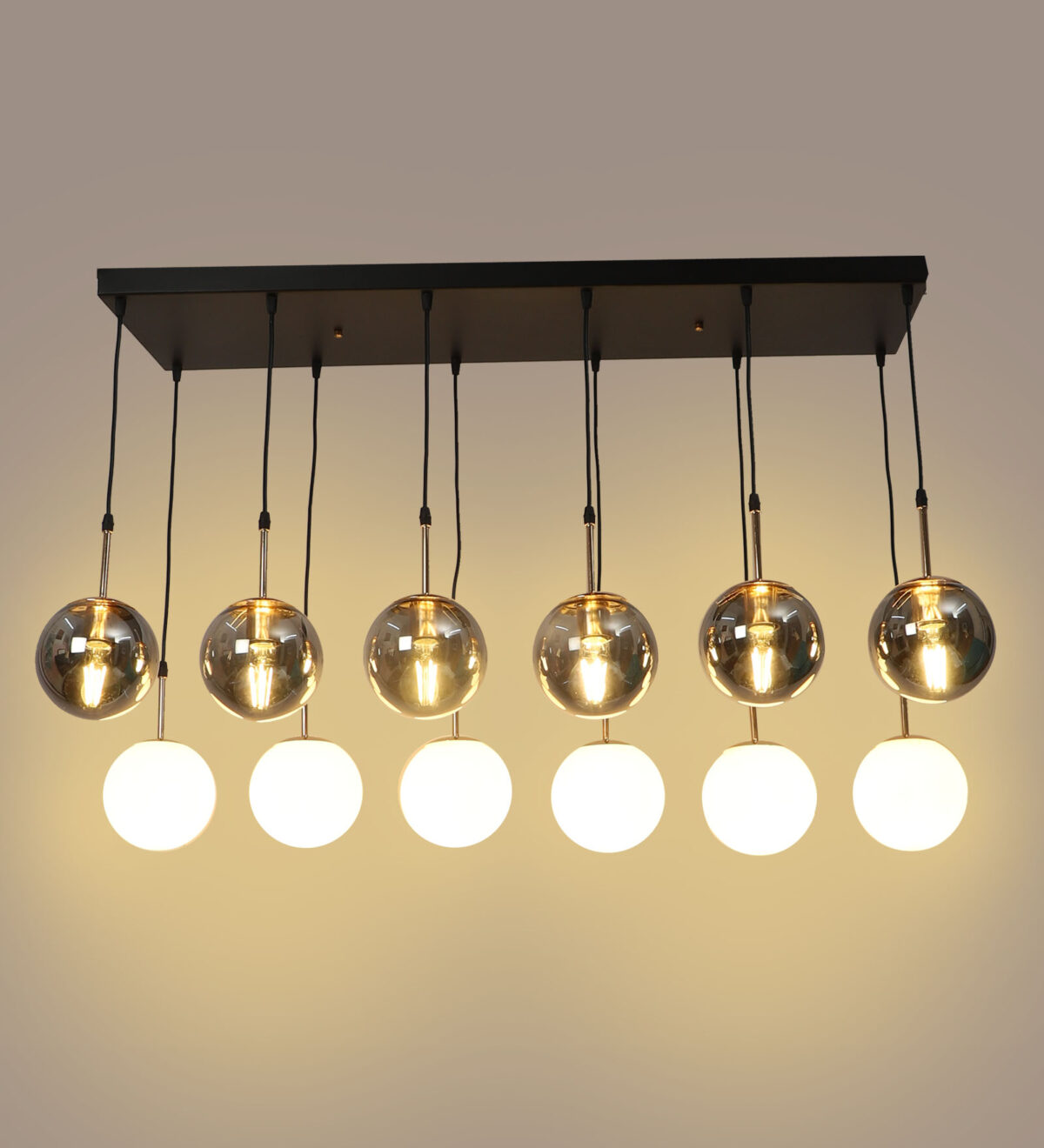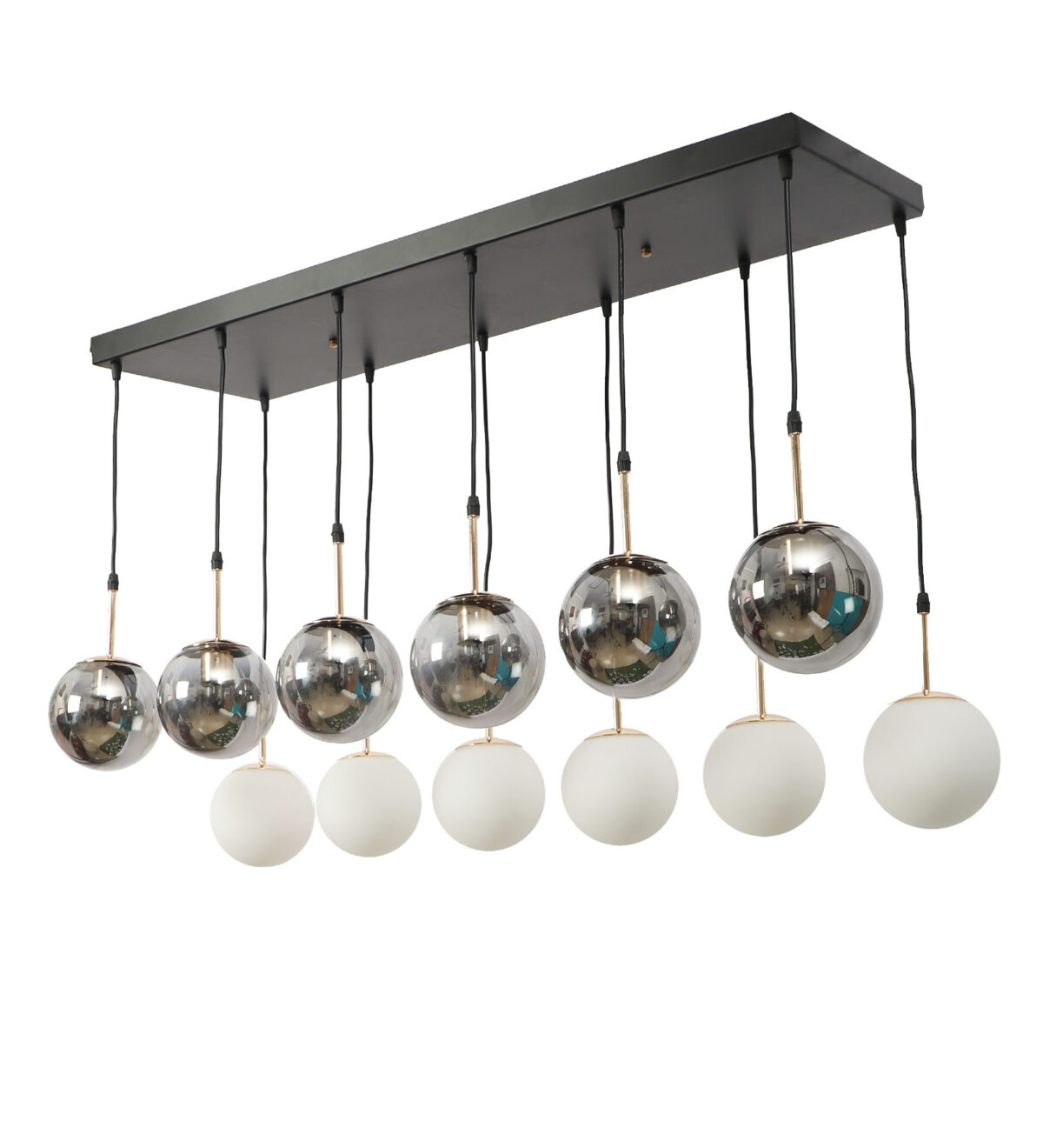 Rectangular hanging light having twelve lamps. Can be customised as per requirement in terms height, number of lamps, finish, shade colour. LAMPS NOT INCLUDED.