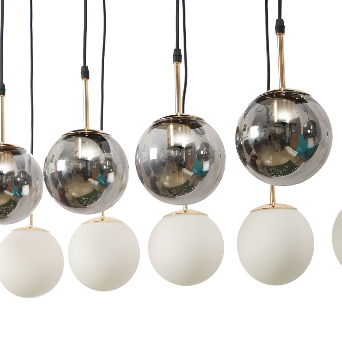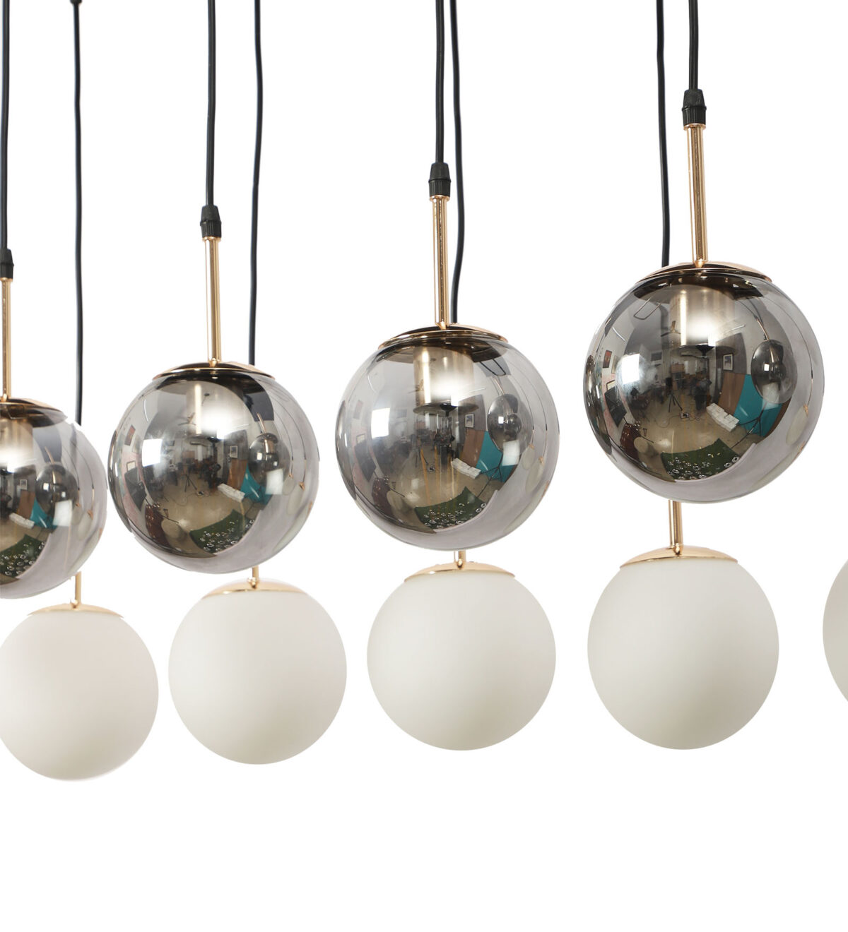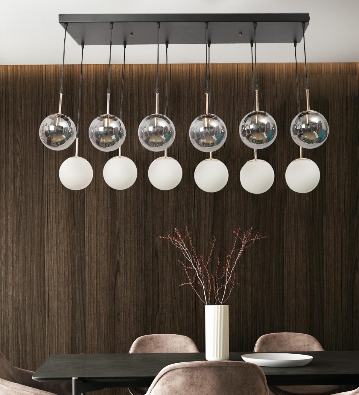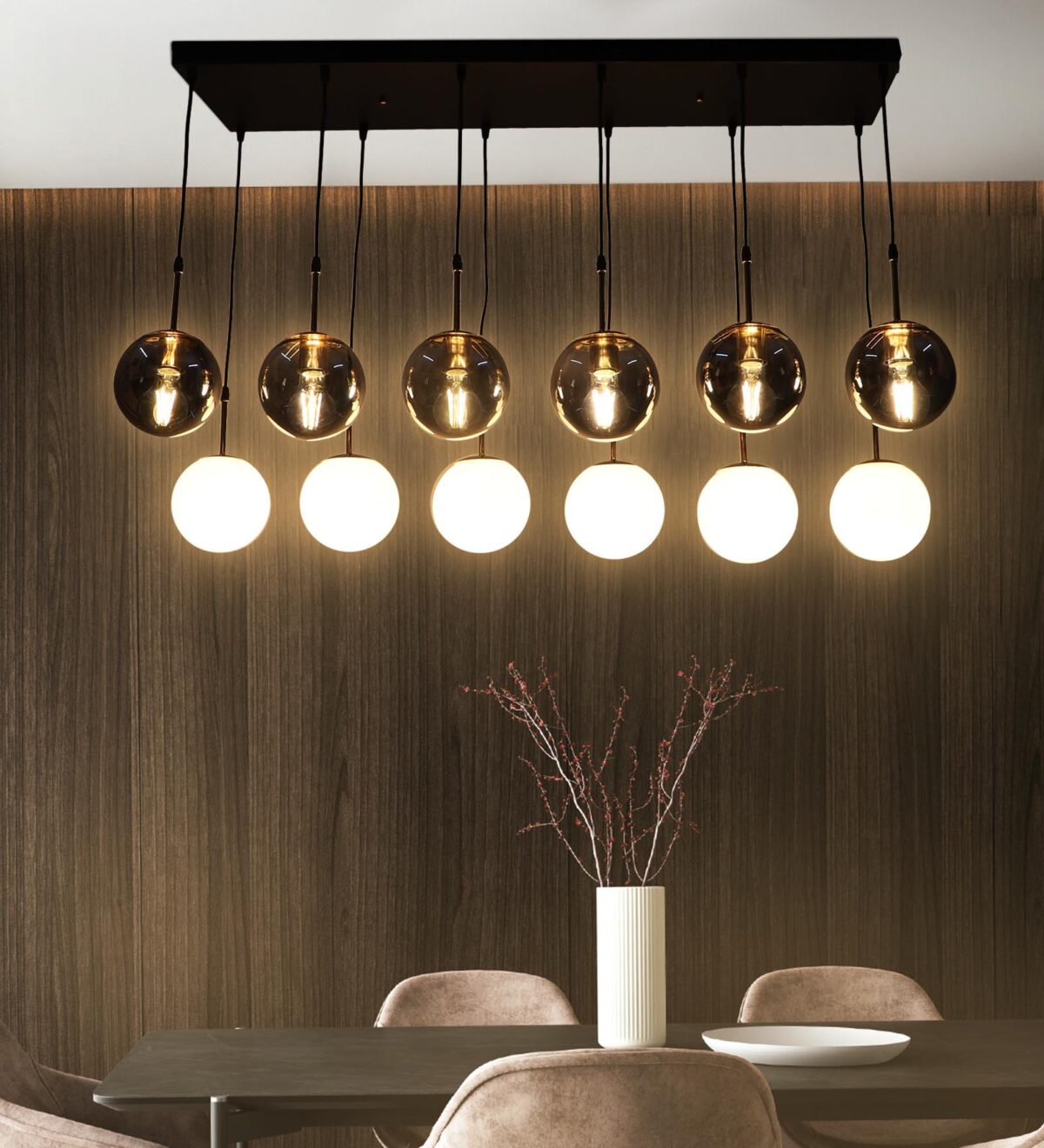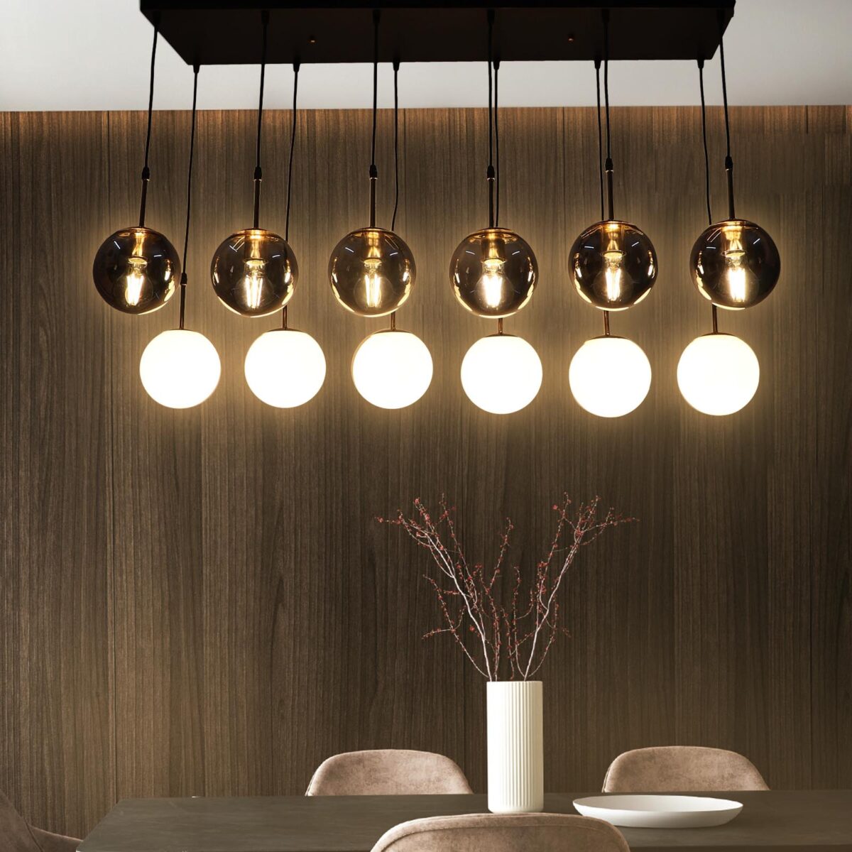 Rectangular hanging light having twelve lamps. Can be customised as per requirement in terms height, number of lamps, finish, shade colour. LAMPS NOT INCLUDED.