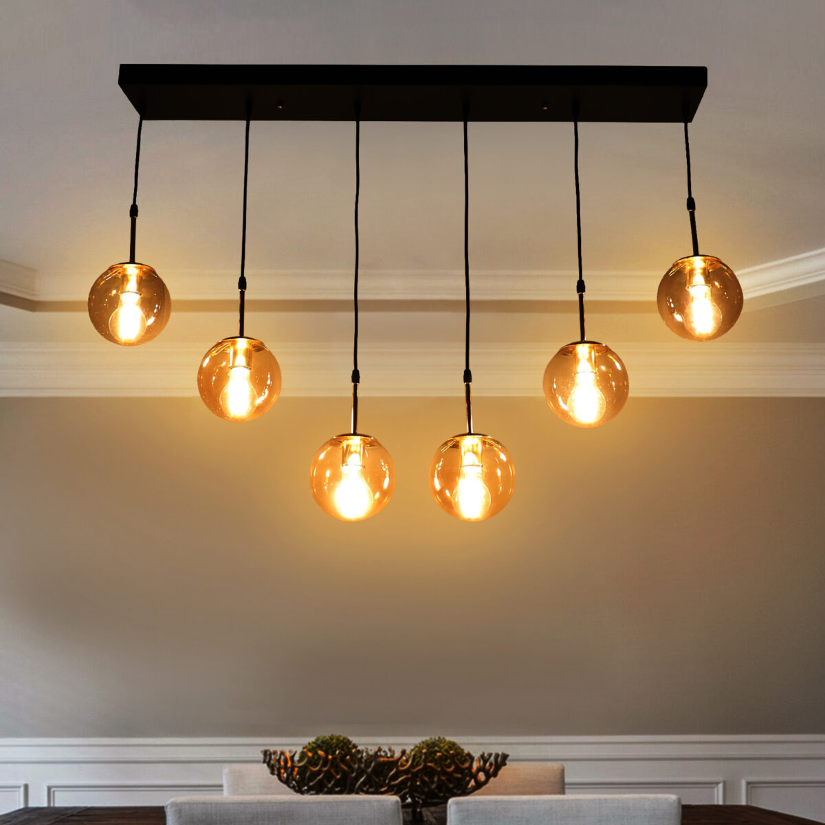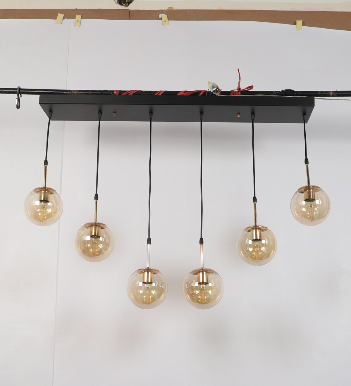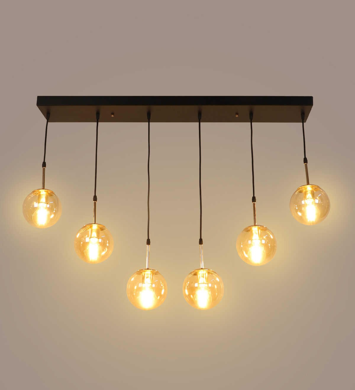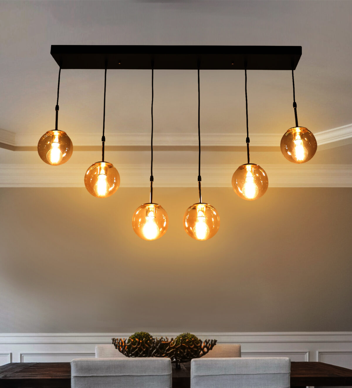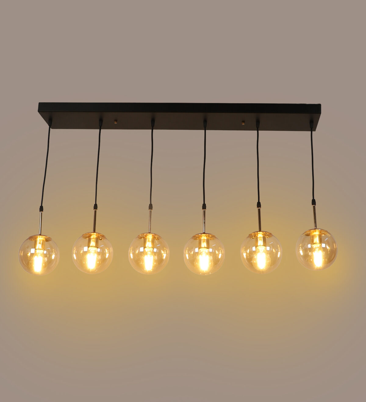 Rectangular hanging light having six lamps. Can be customised as per requirement in terms height, number of lamps, finish, shade colour. LAMPS NOT INCLUDED.