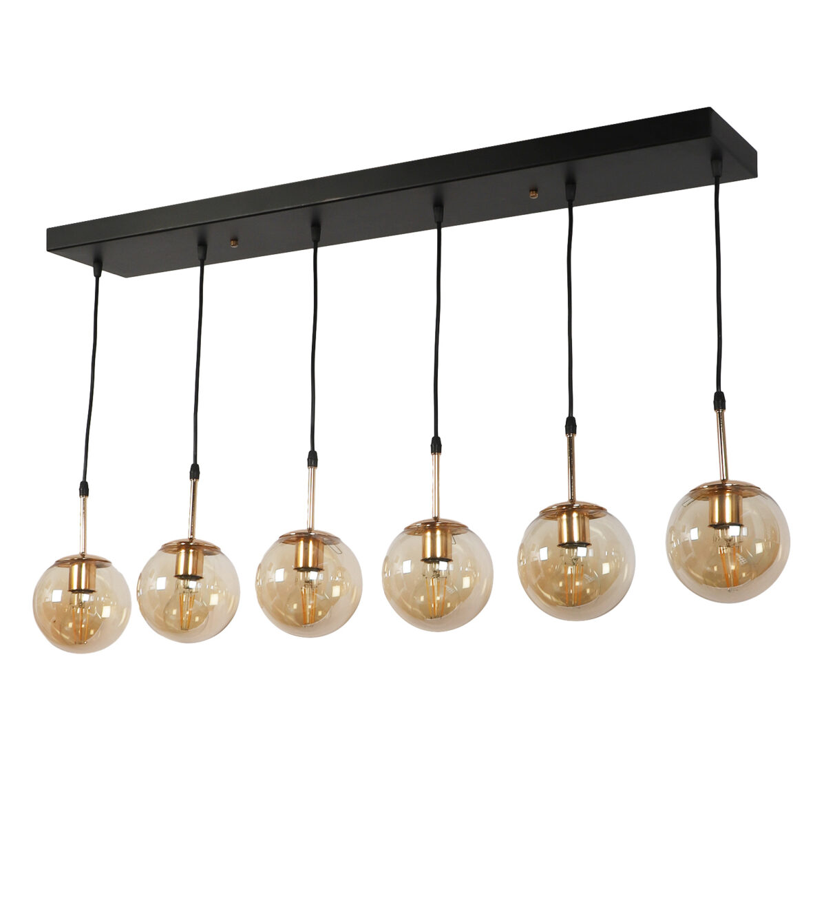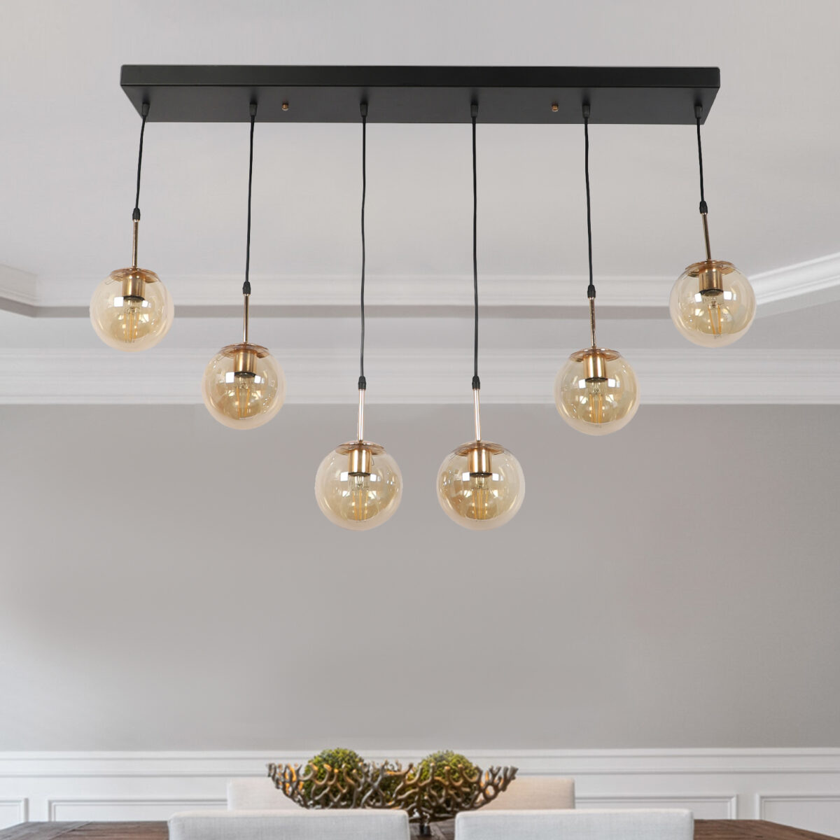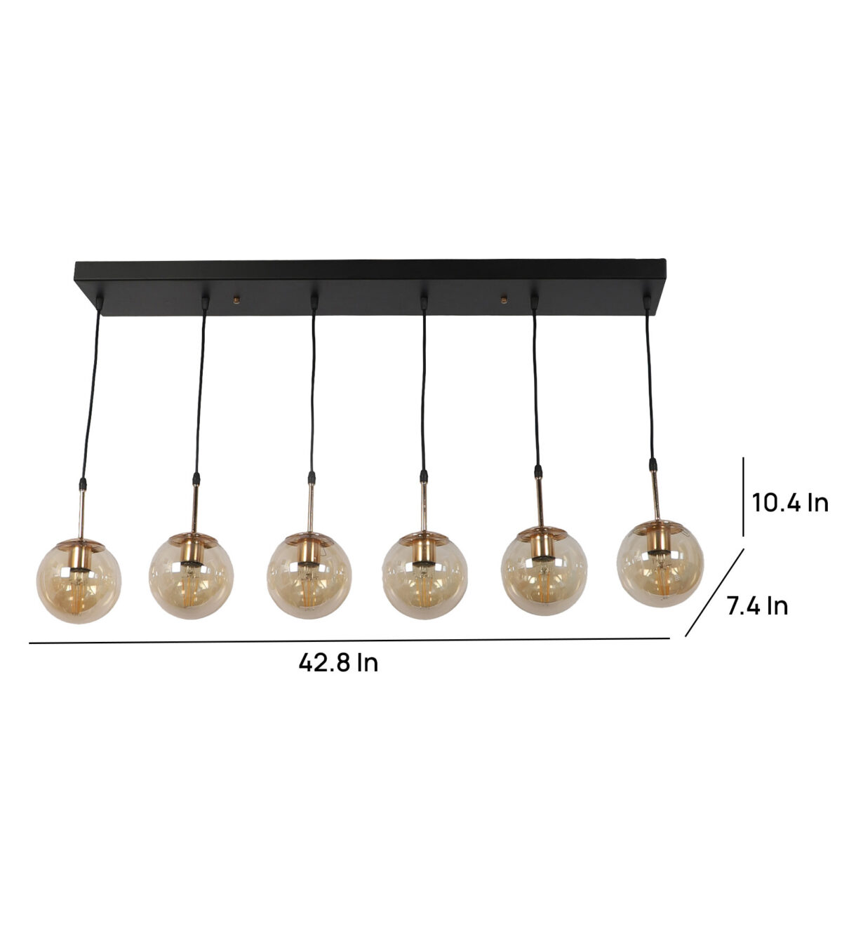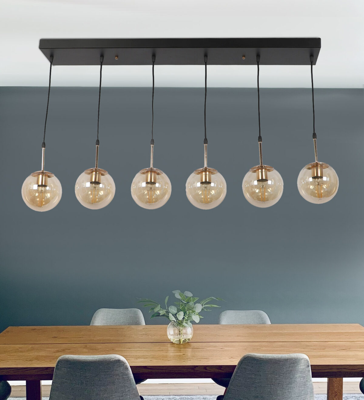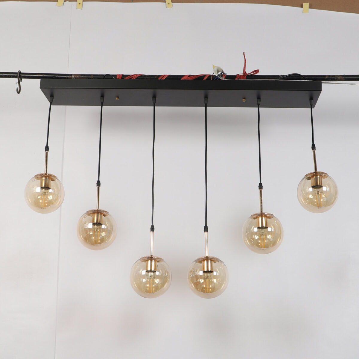 Rectangular hanging light having six lamps. Can be customised as per requirement in terms height, number of lamps, finish, shade colour. LAMPS NOT INCLUDED.