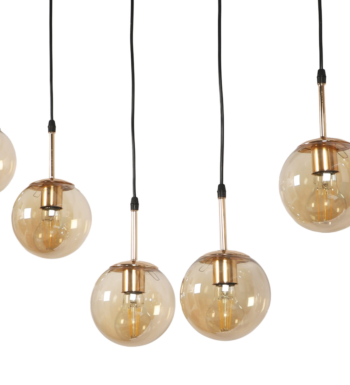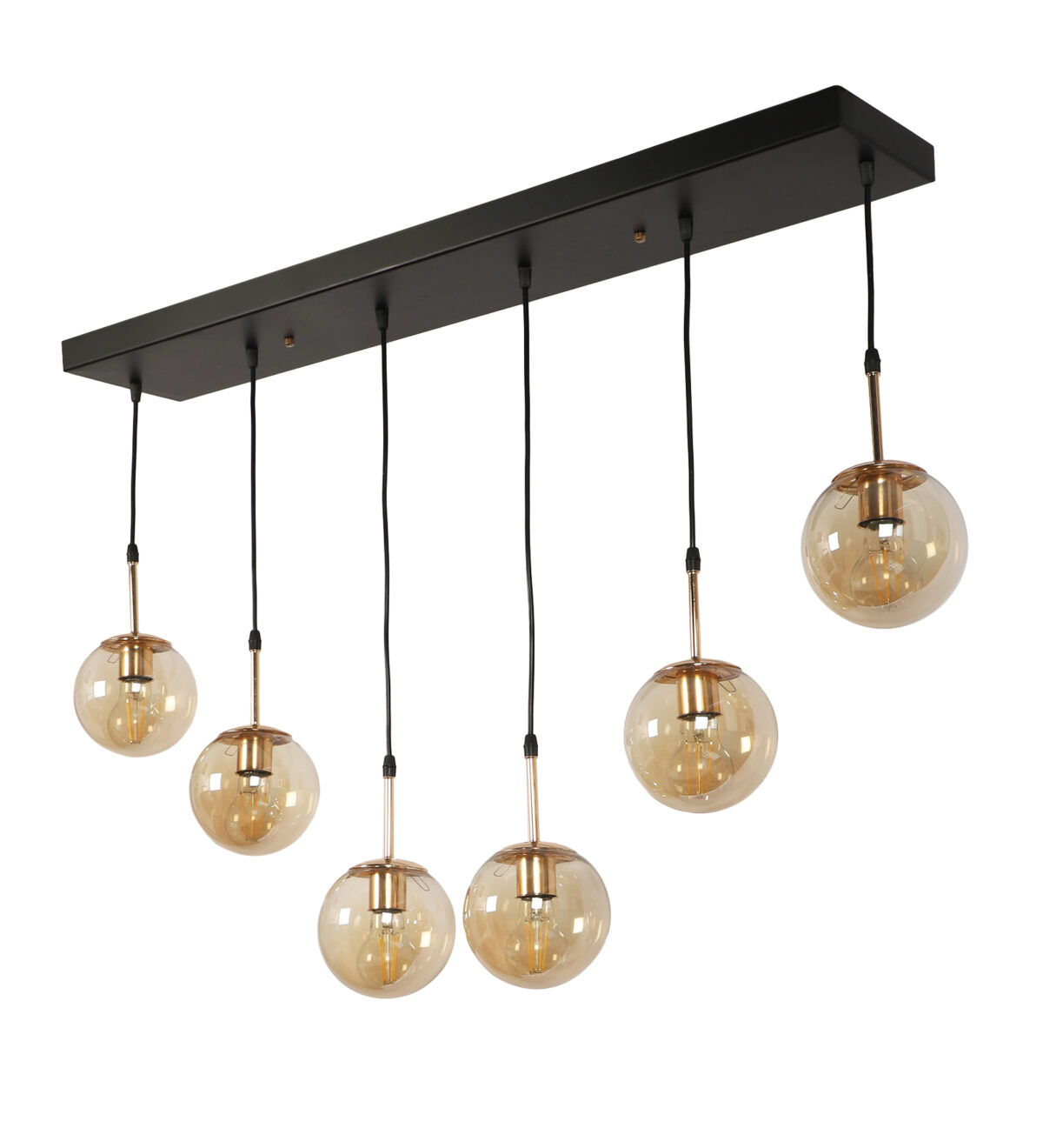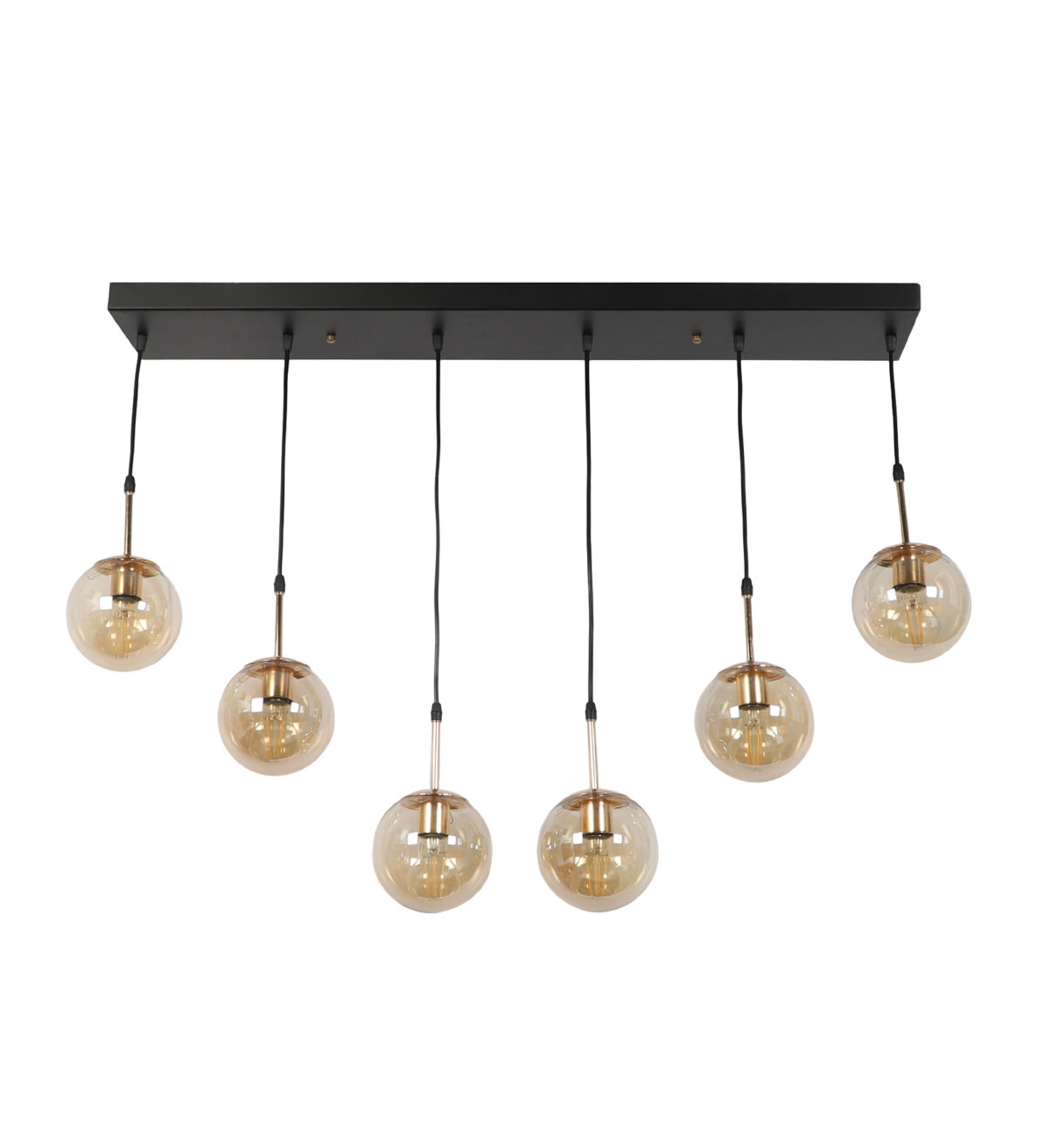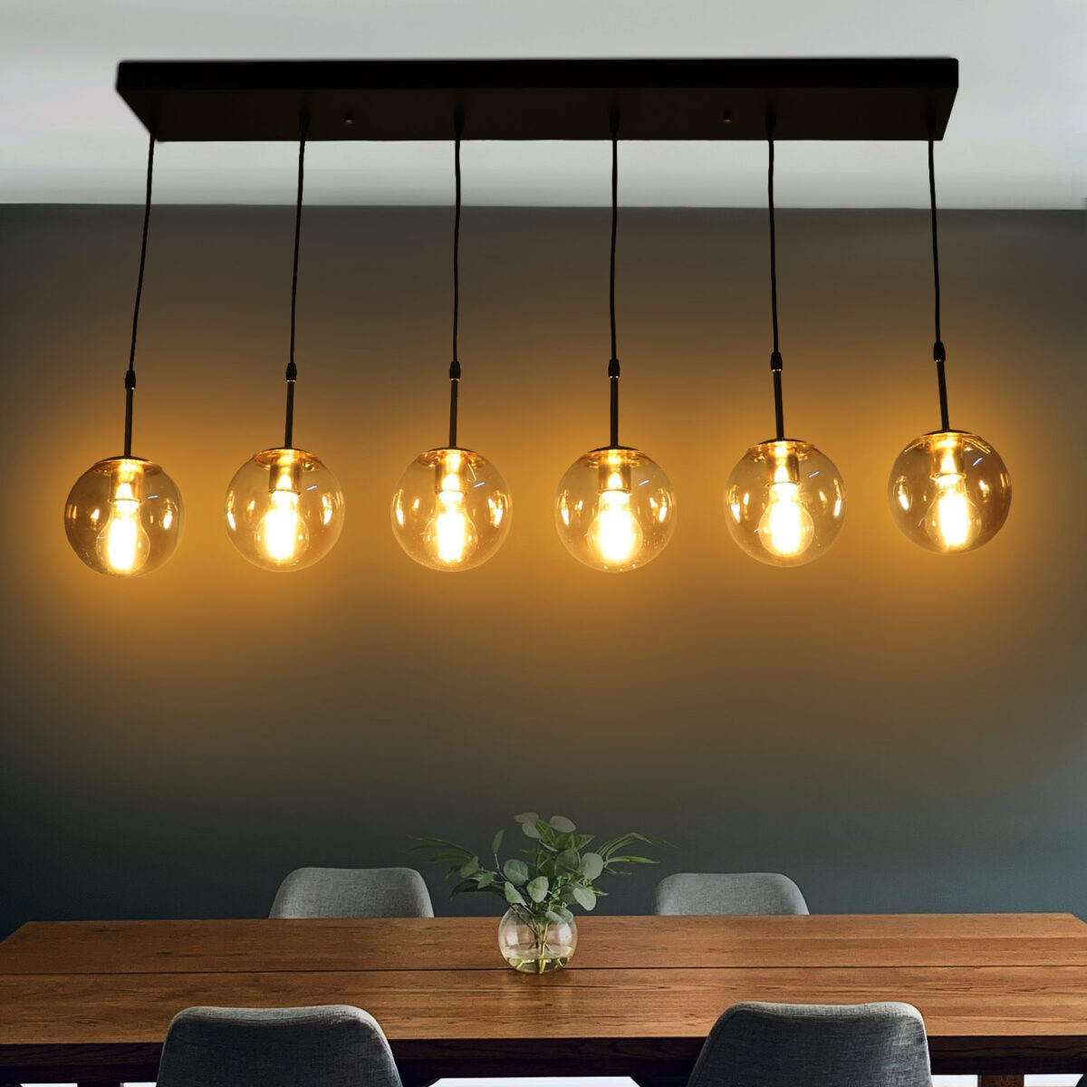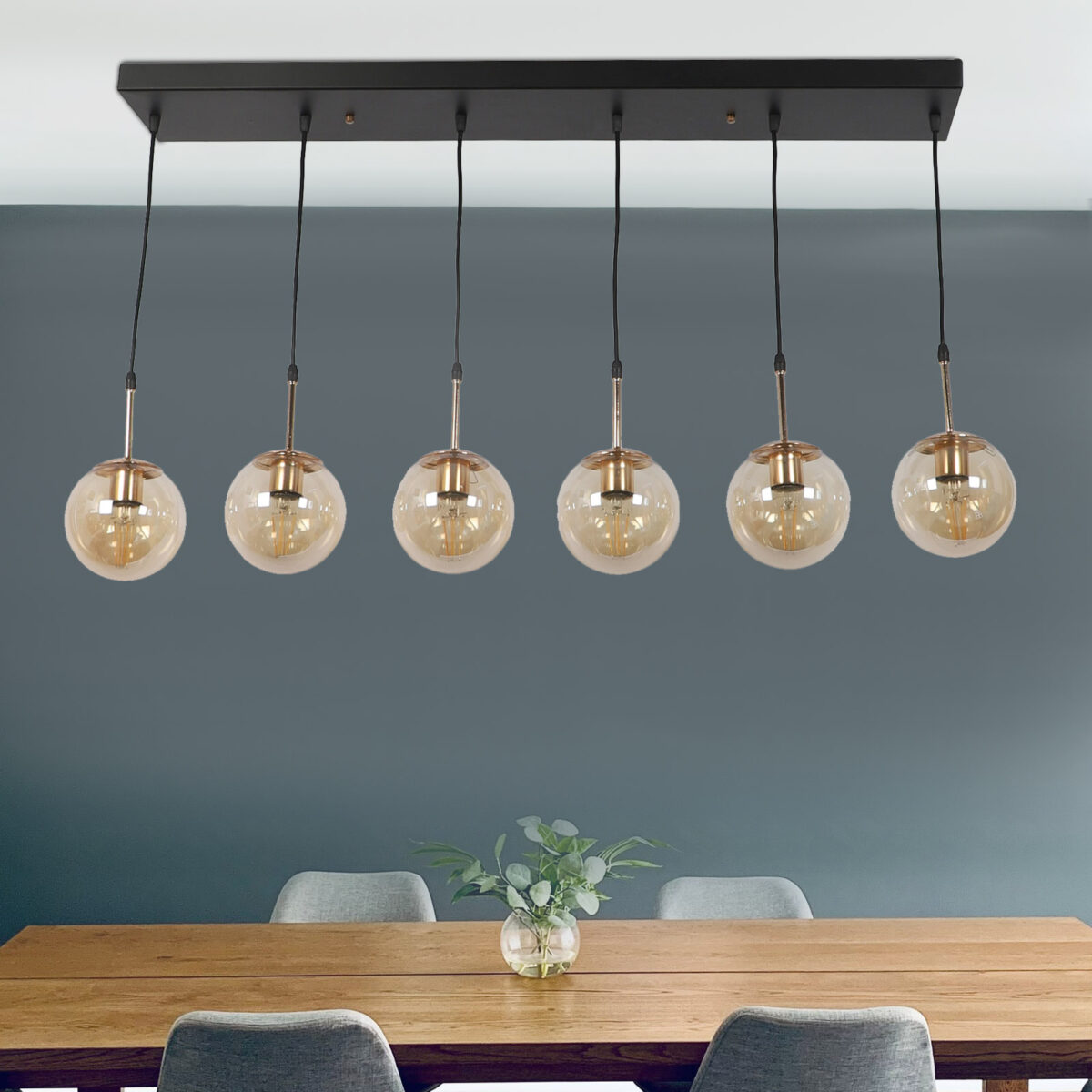 Rectangular hanging light having six lamps. Can be customised as per requirement in terms height, number of lamps, finish, shade colour. LAMPS NOT INCLUDED.