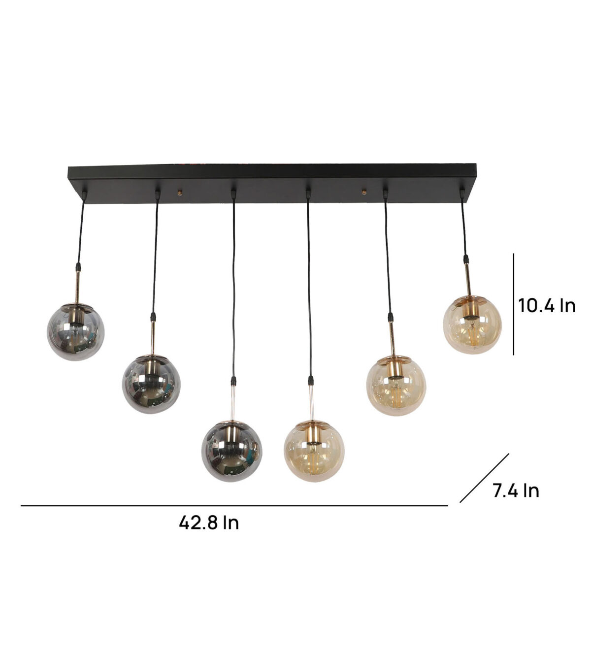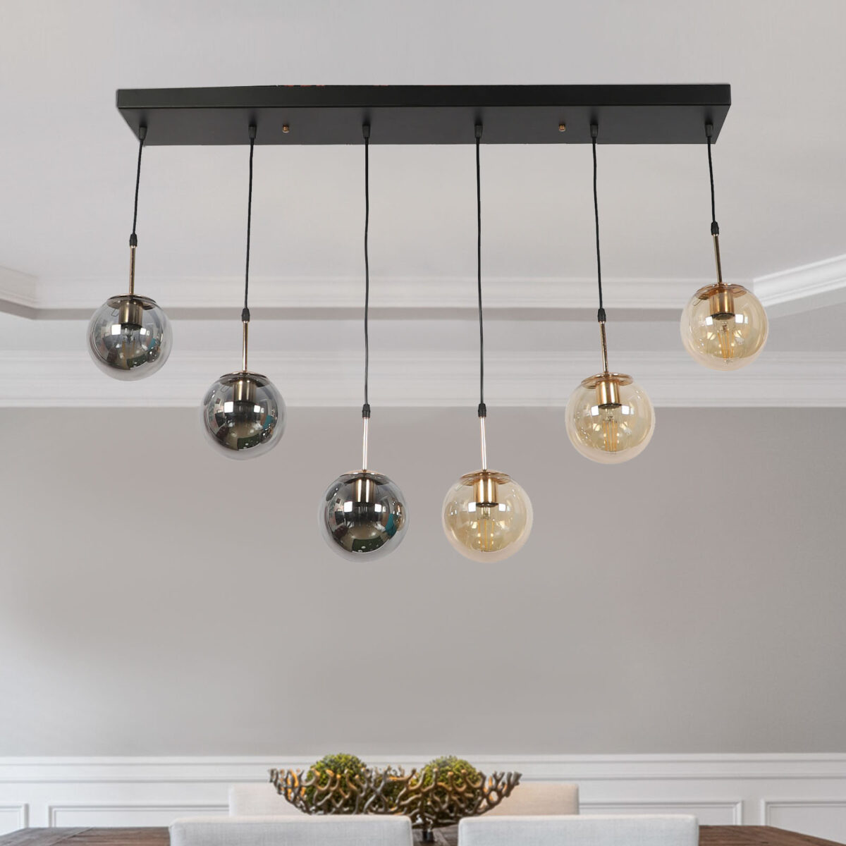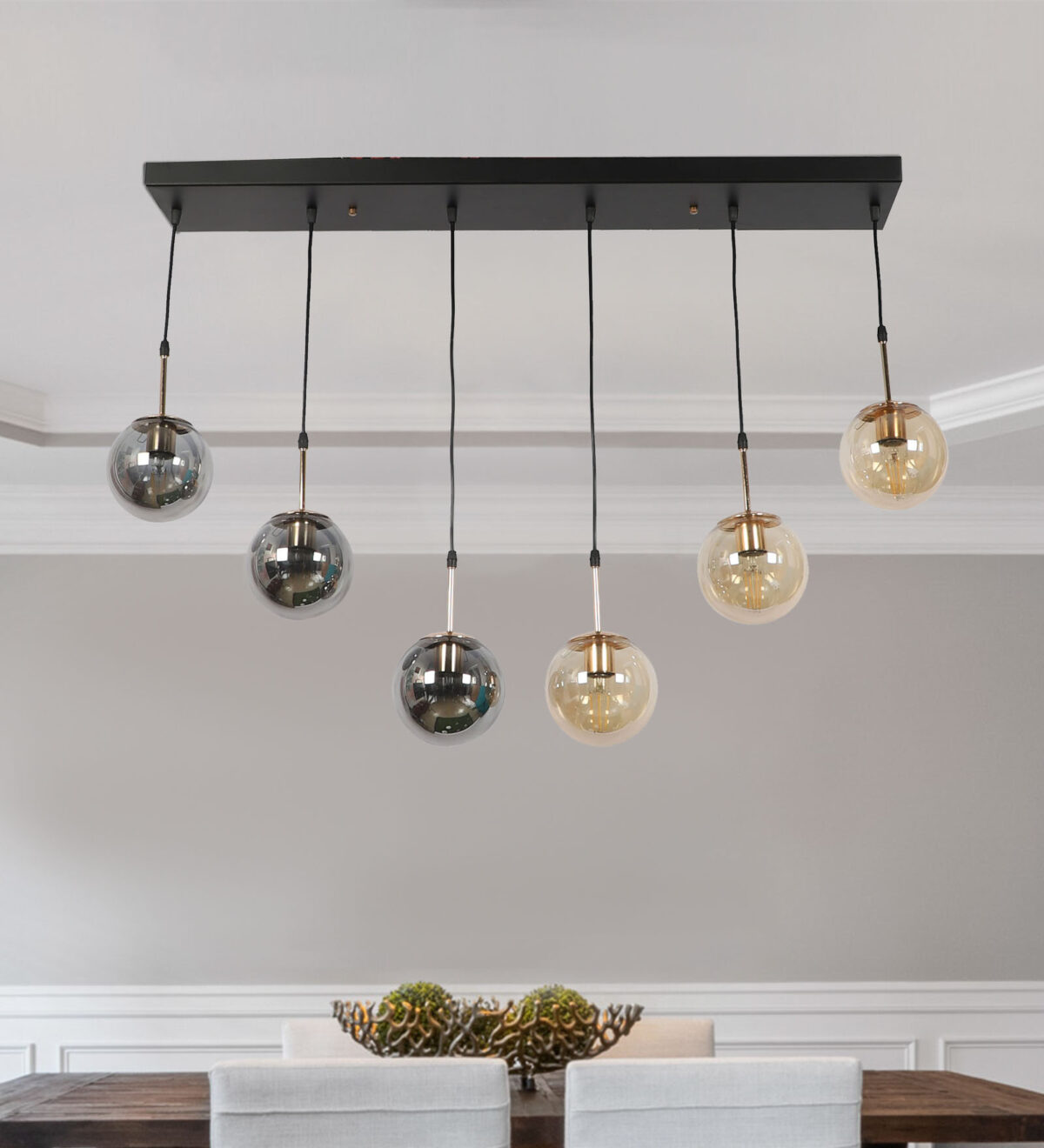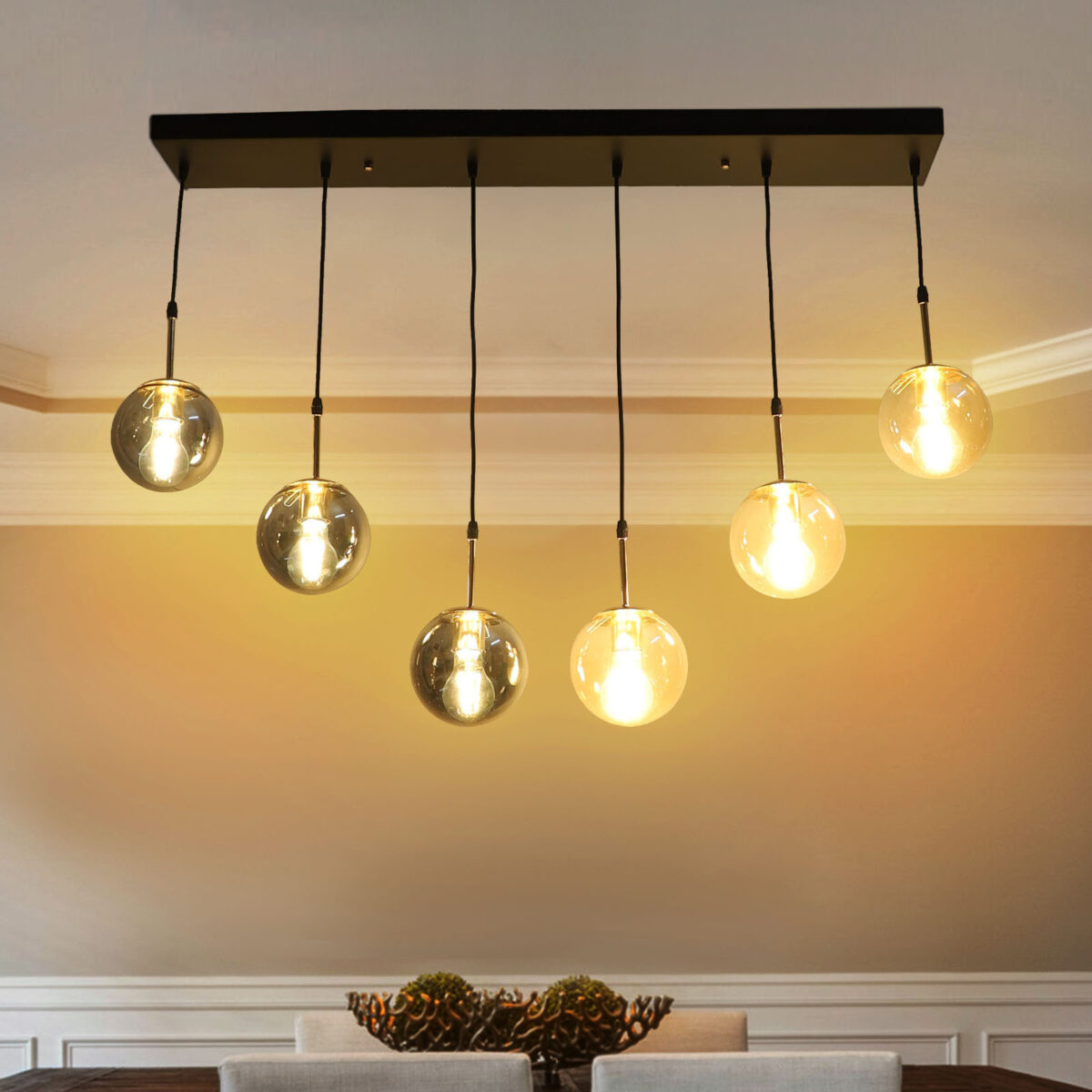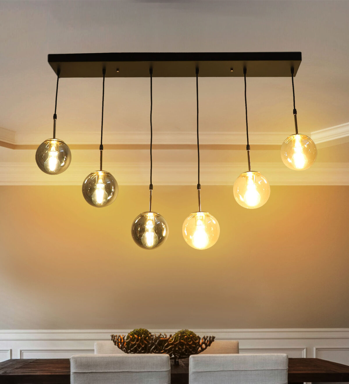 Rectangular hanging light having six lamps. Can be customised as per requirement in terms height, number of lamps, finish, shade colour. LAMPS NOT INCLUDED.