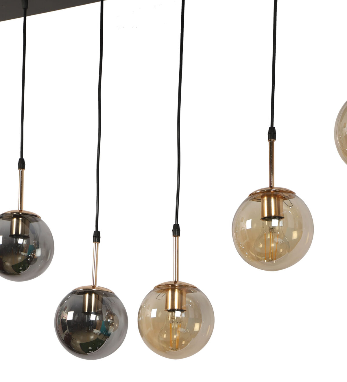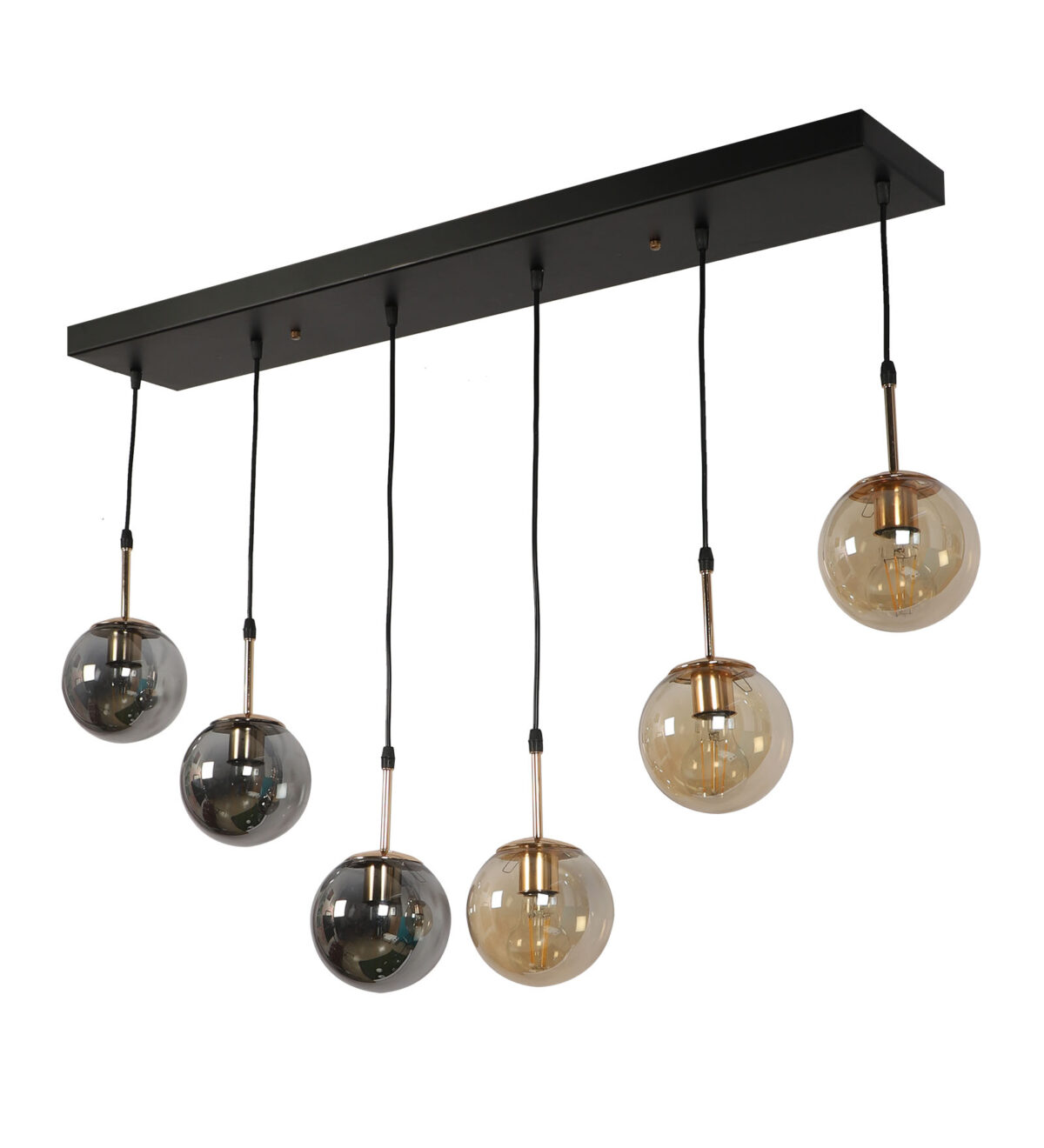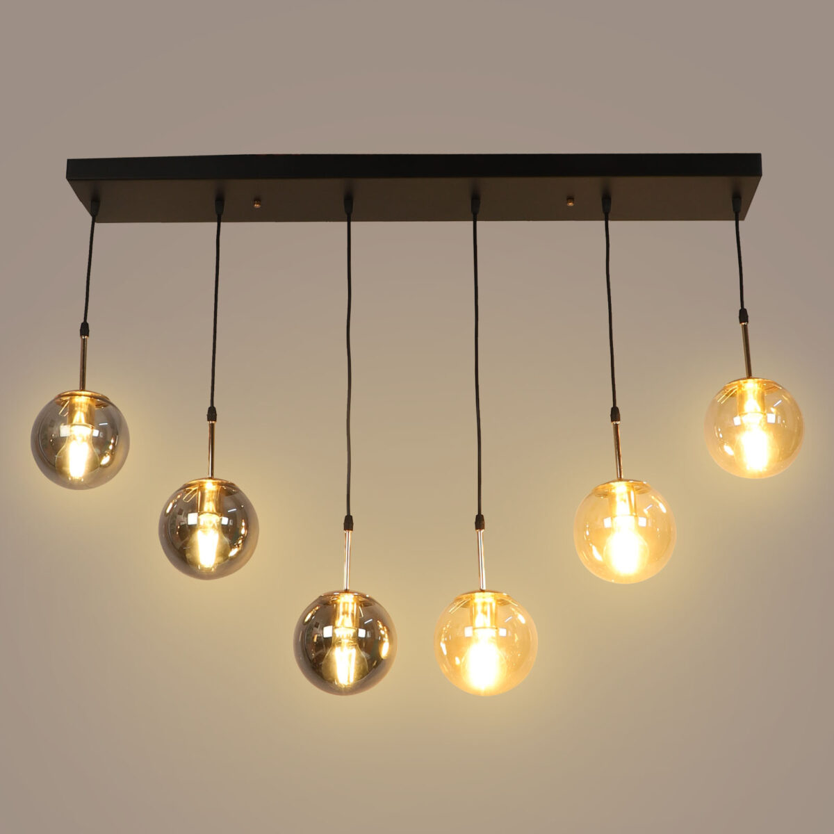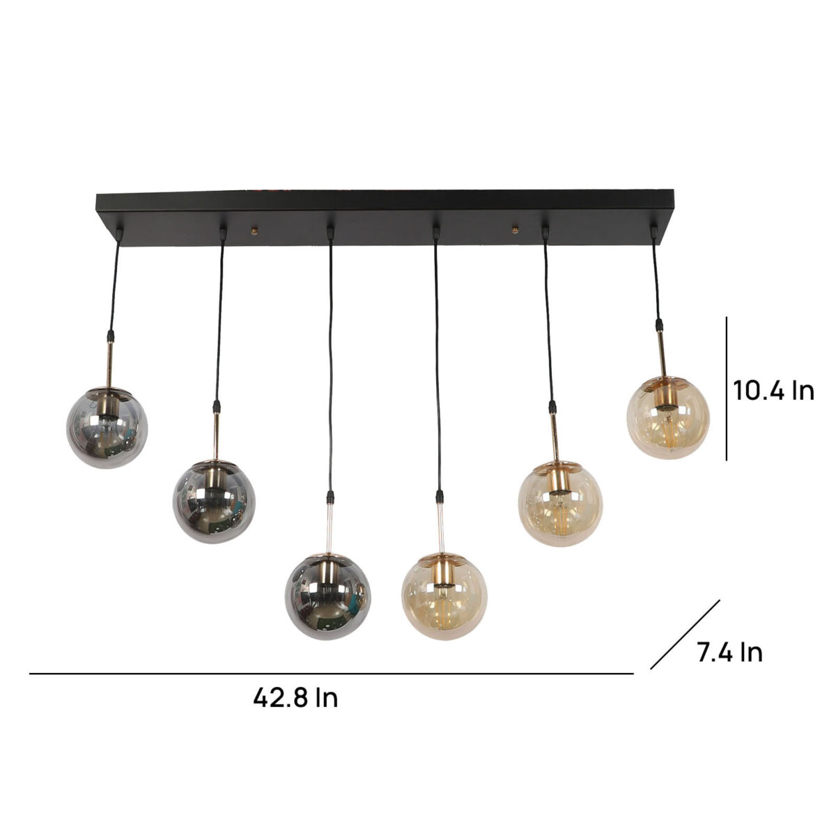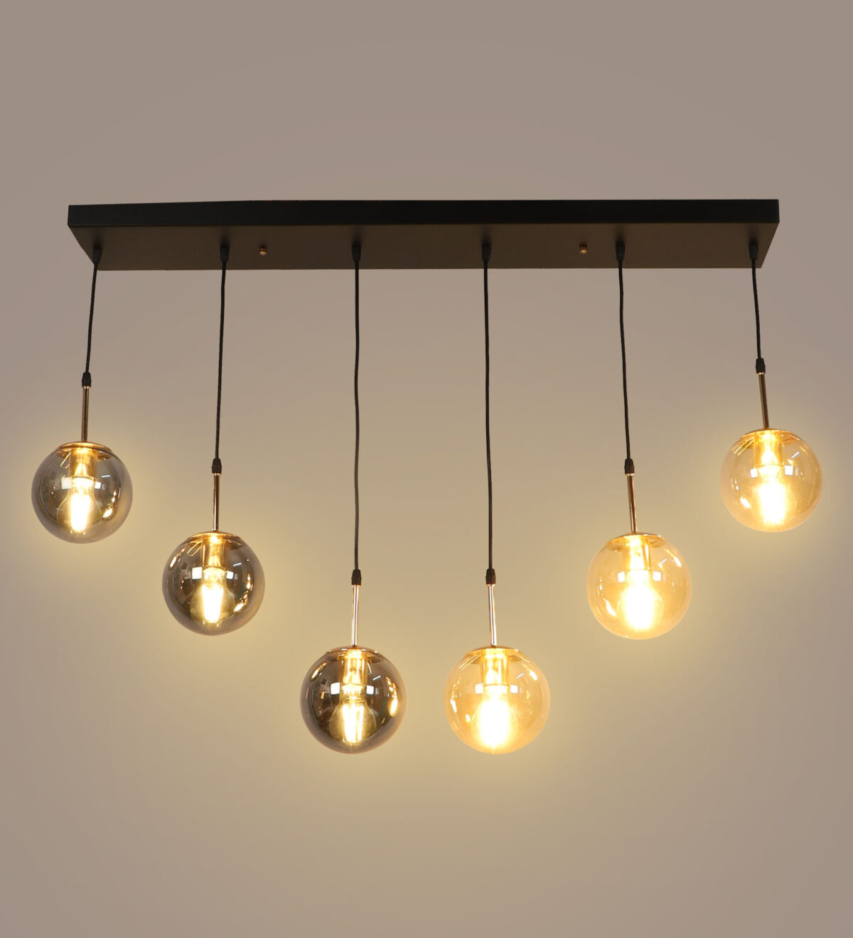 Rectangular hanging light having six lamps. Can be customised as per requirement in terms height, number of lamps, finish, shade colour. LAMPS NOT INCLUDED.