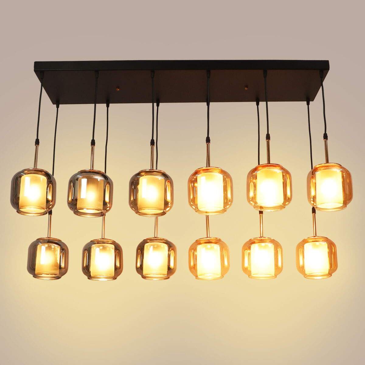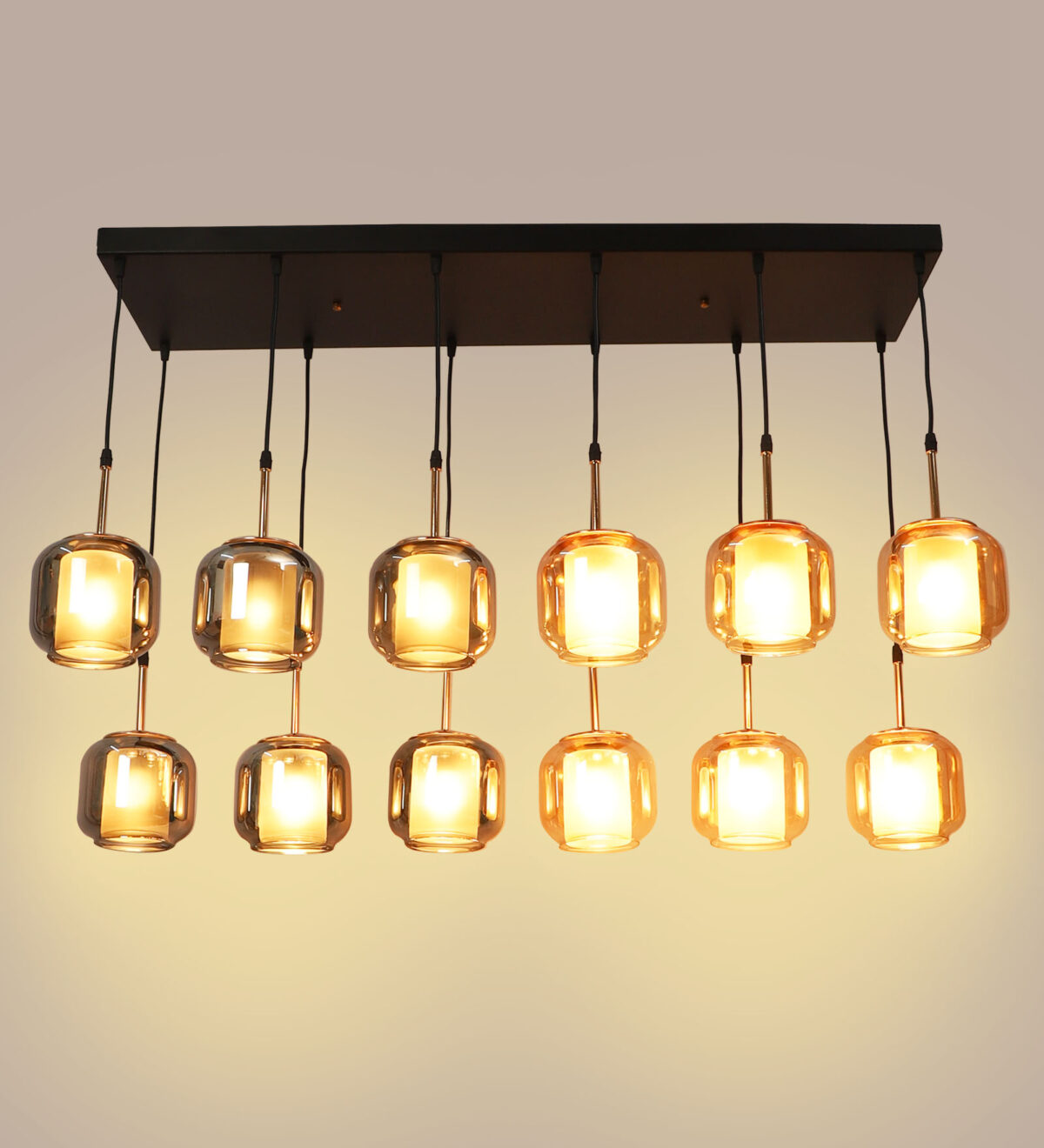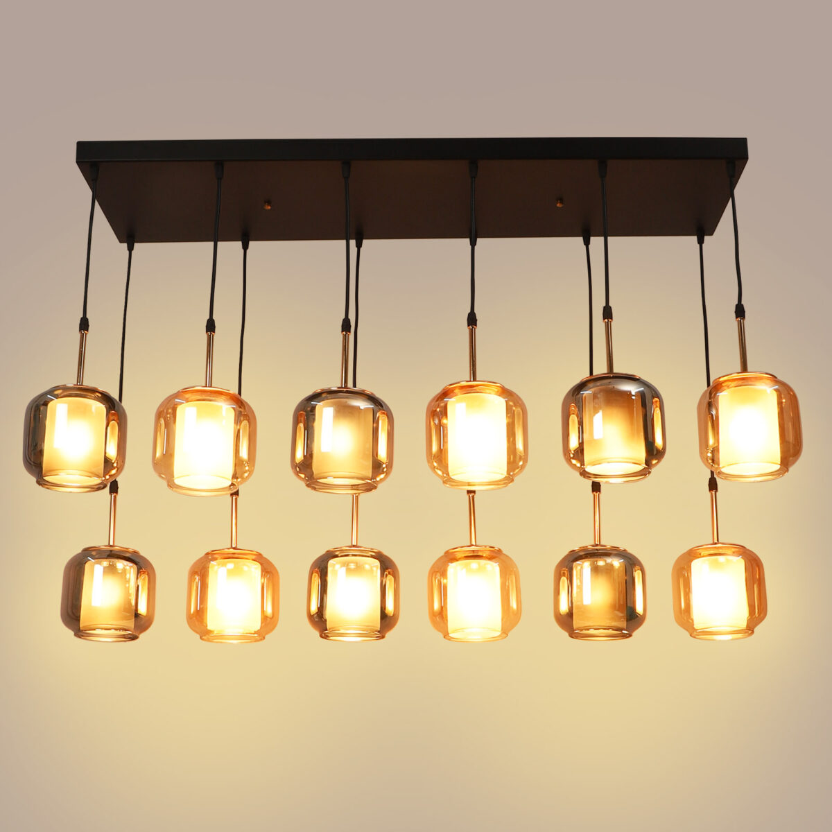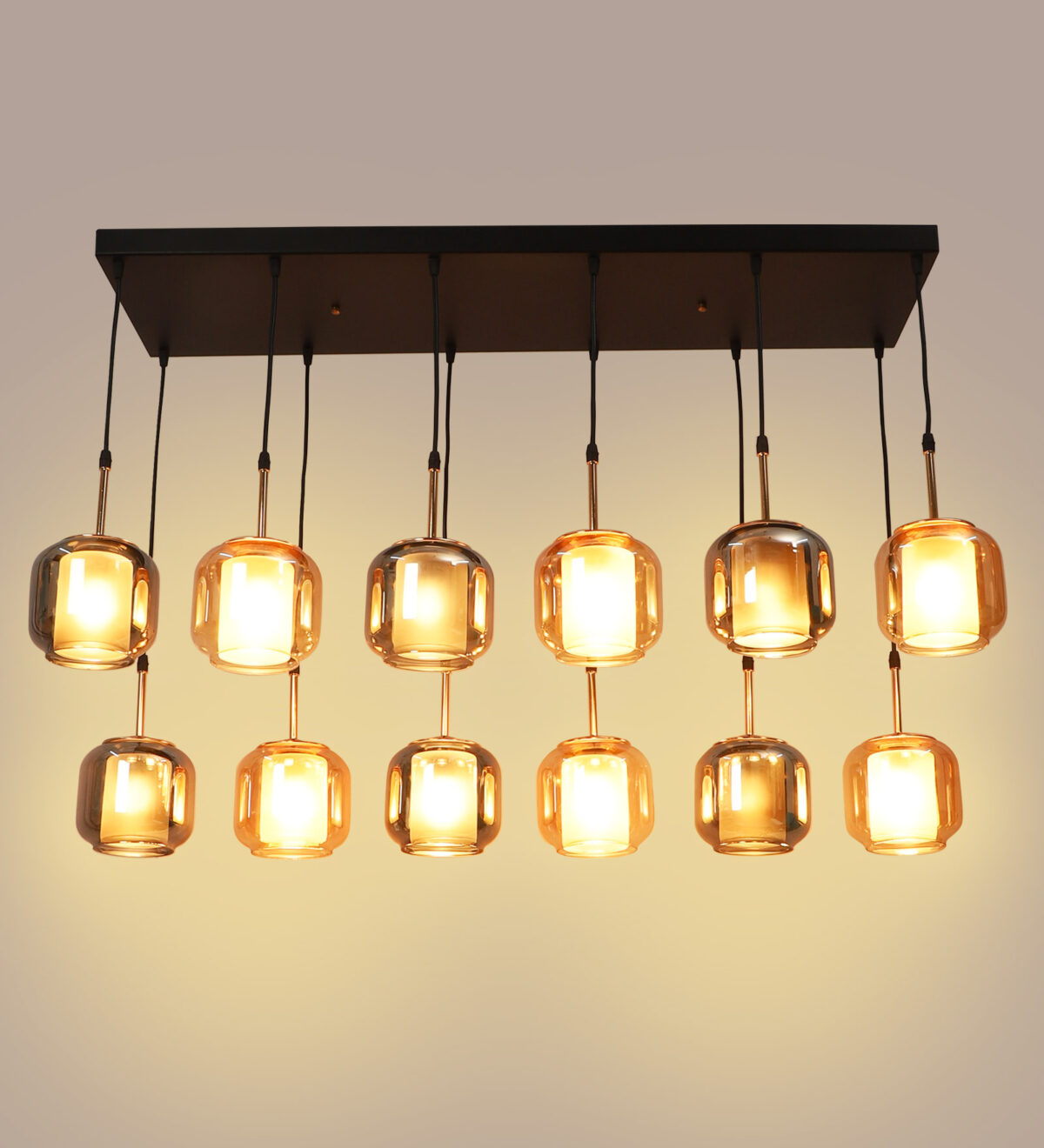 Rectangular hanging light having twelve lamps. Can be customised as per requirement in terms height, number of lamps, finish, shade colour. LAMPS NOT INCLUDED.