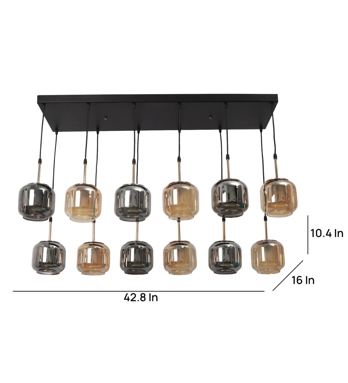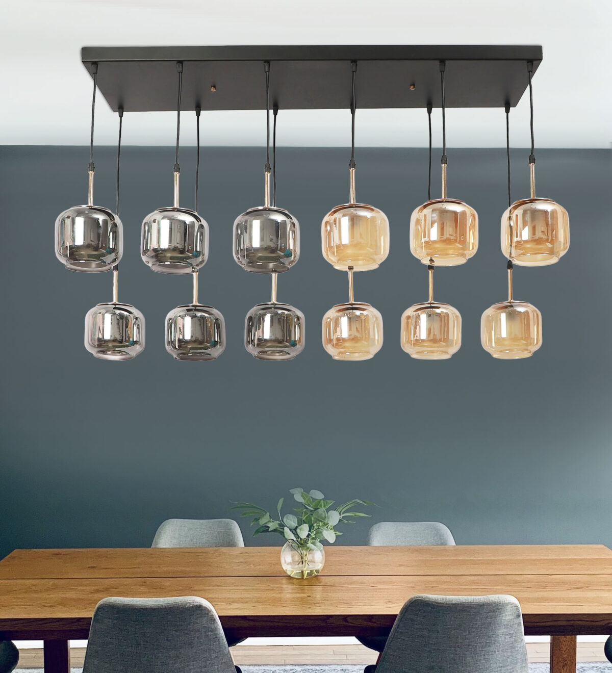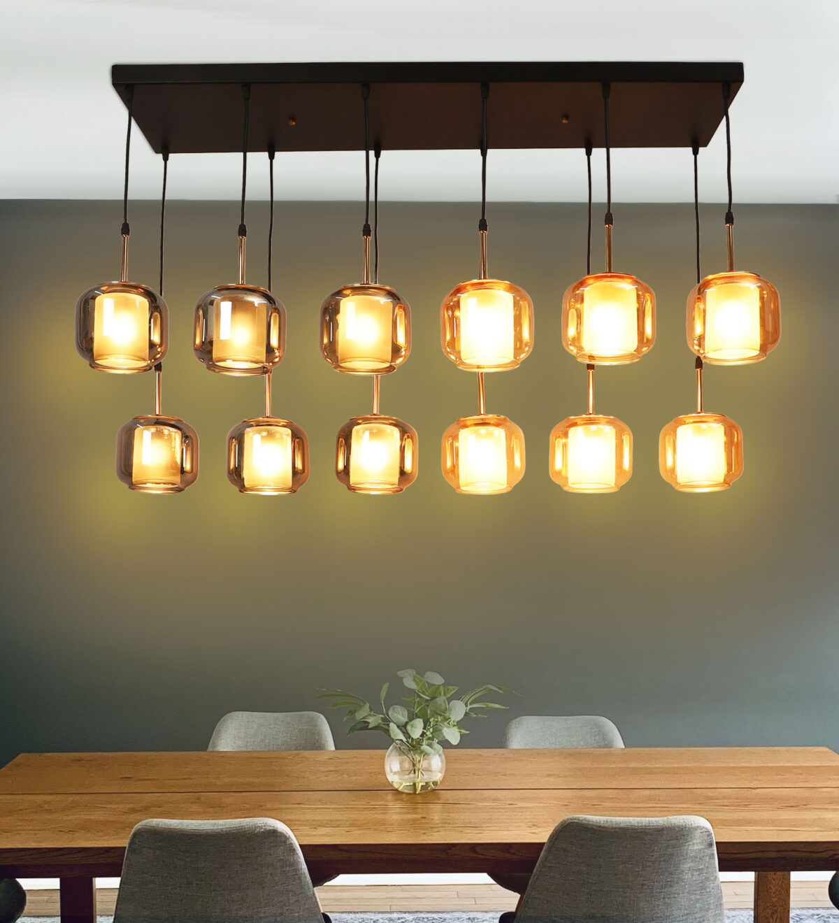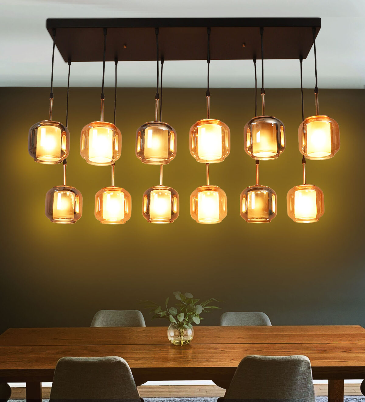 Rectangular hanging light having twelve lamps. Can be customised as per requirement in terms height, number of lamps, finish, shade colour. LAMPS NOT INCLUDED.