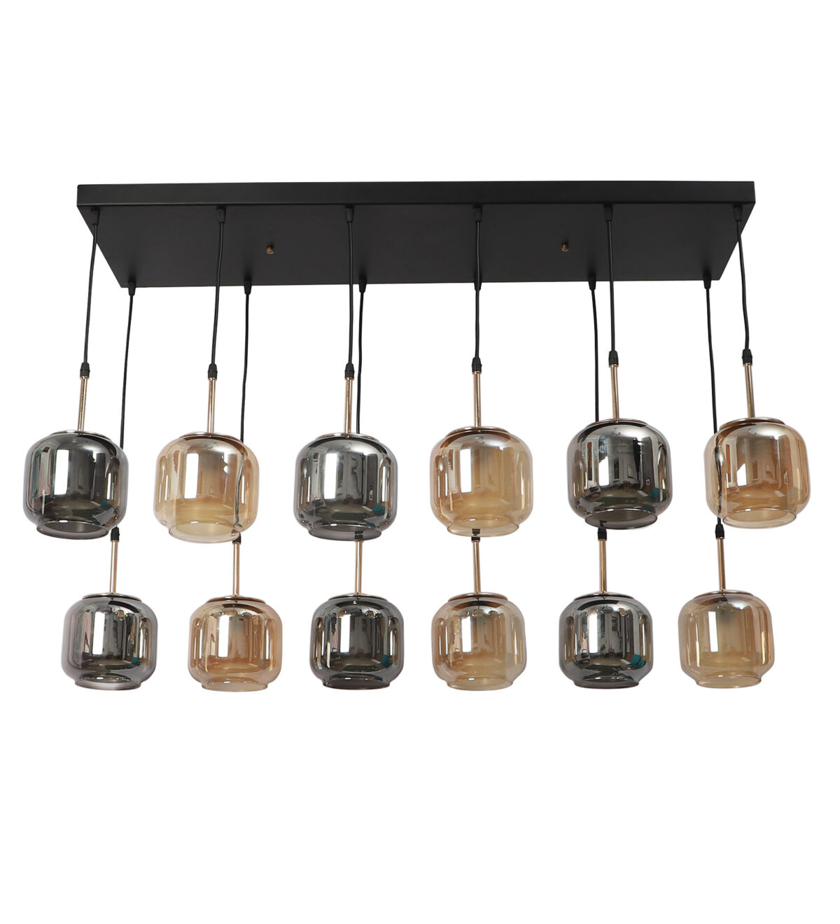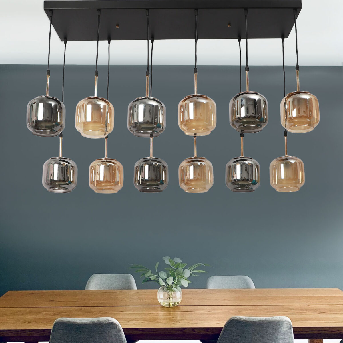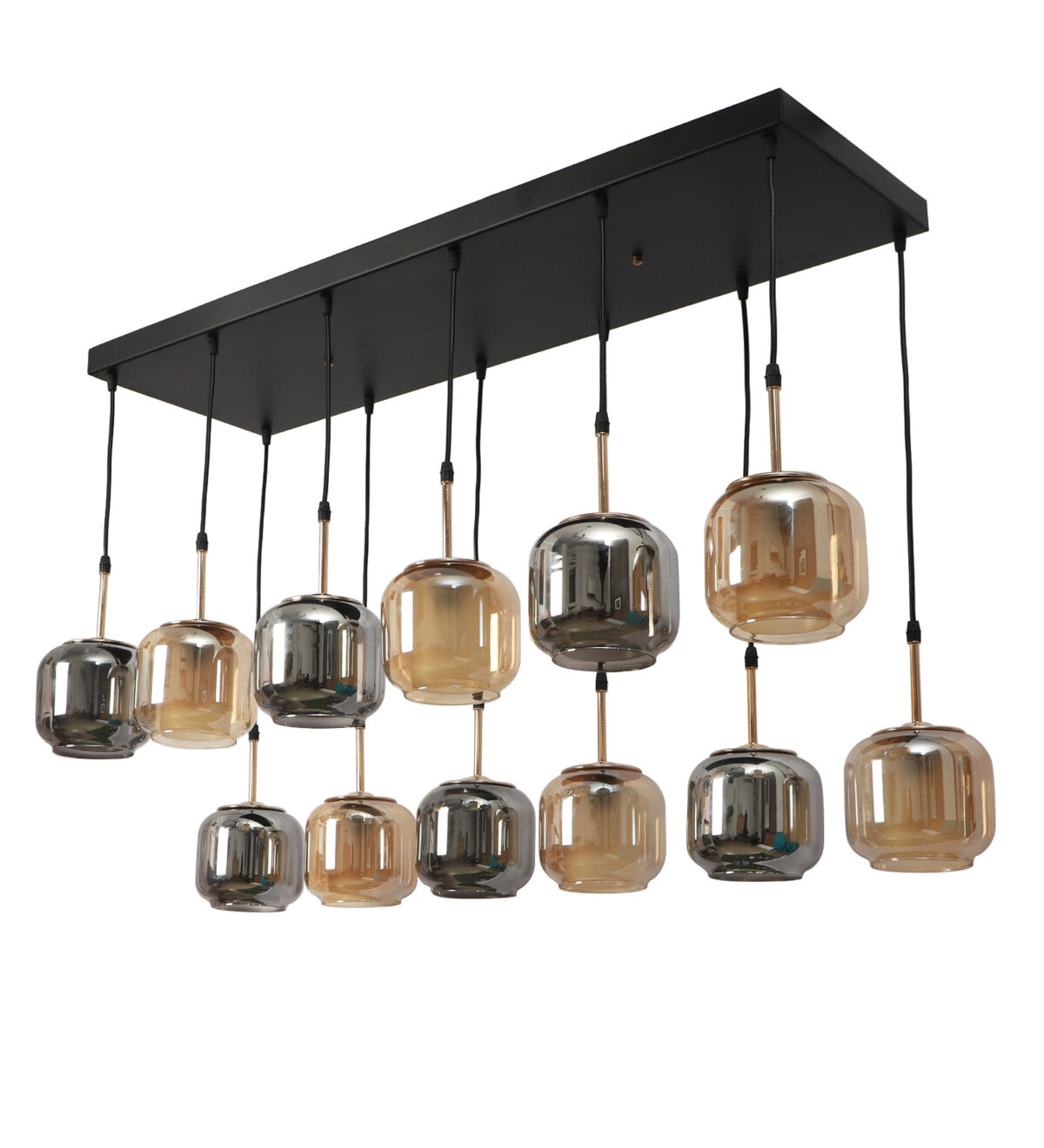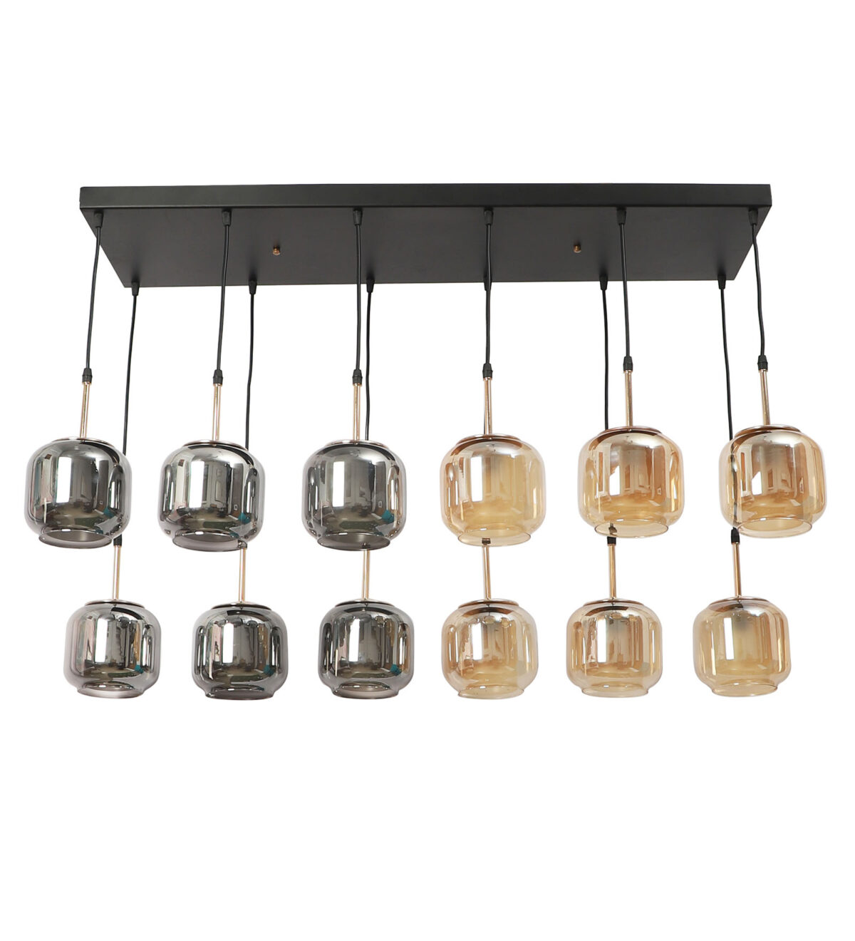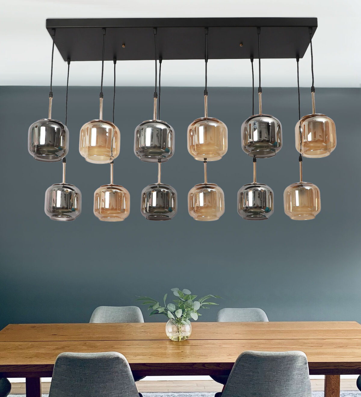 Rectangular hanging light having twelve lamps. Can be customised as per requirement in terms height, number of lamps, finish, shade colour. LAMPS NOT INCLUDED.