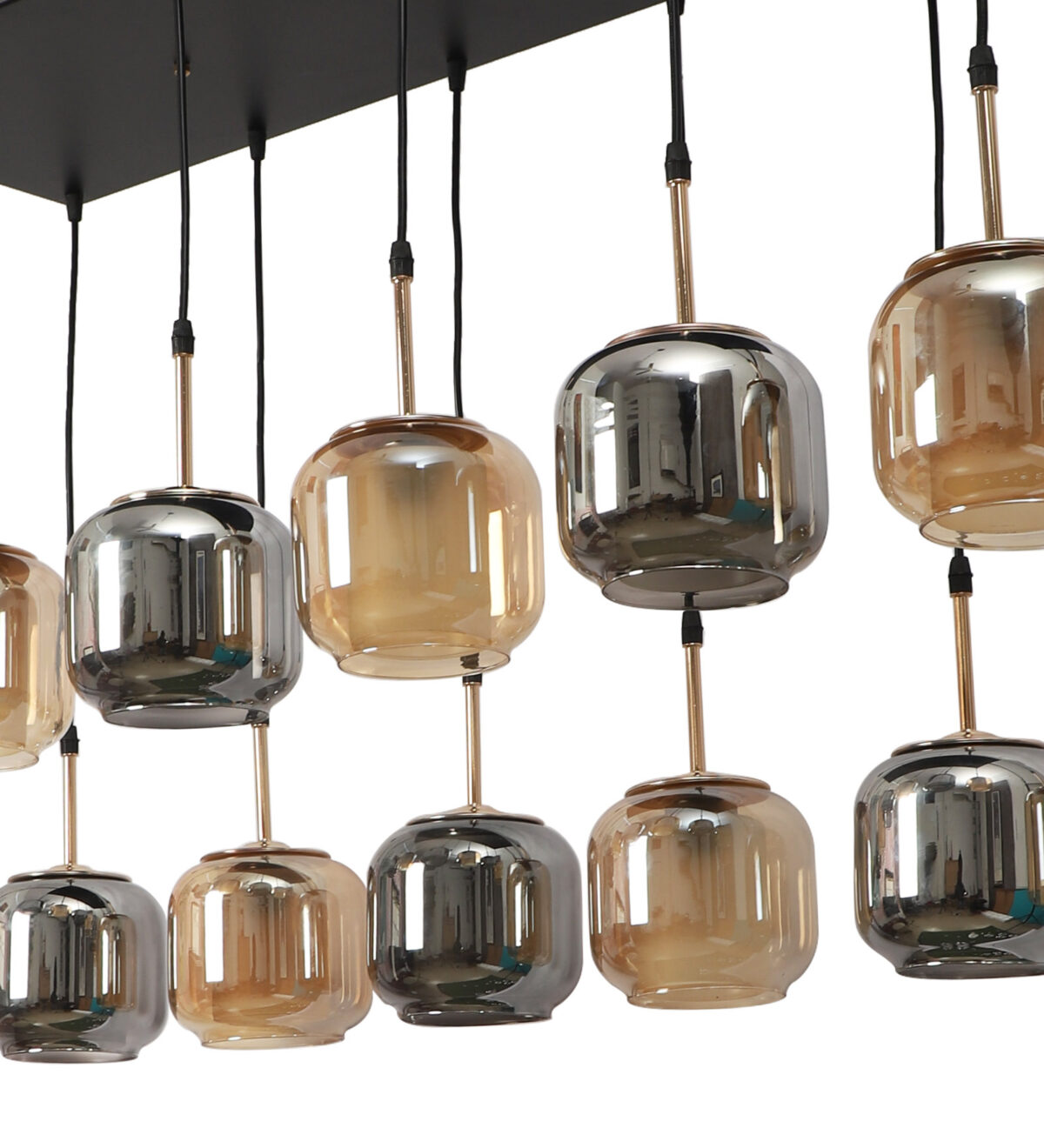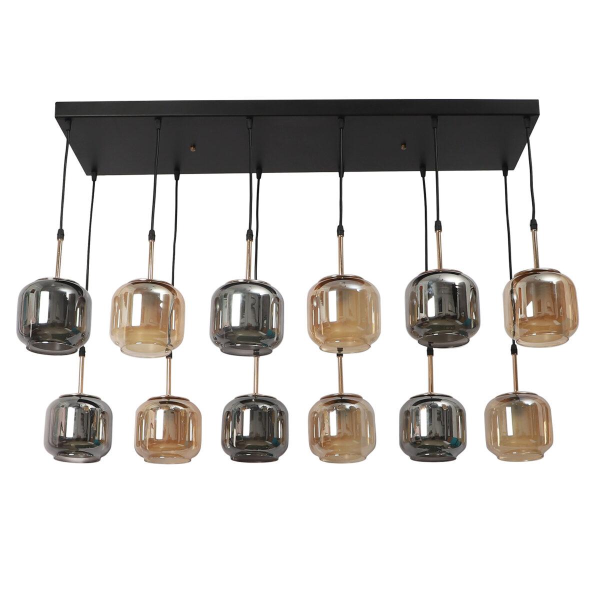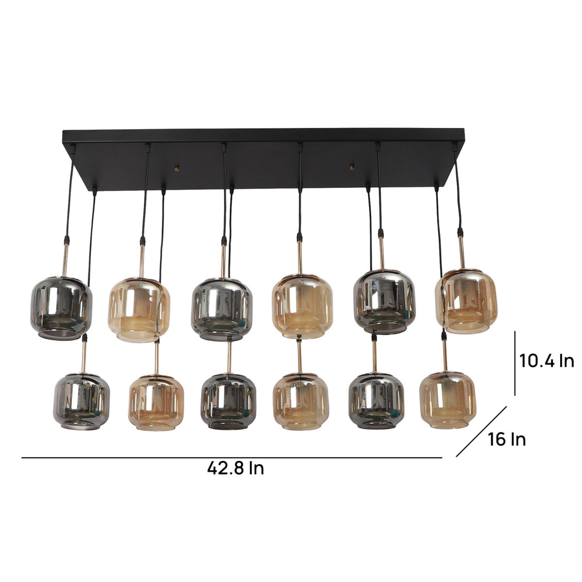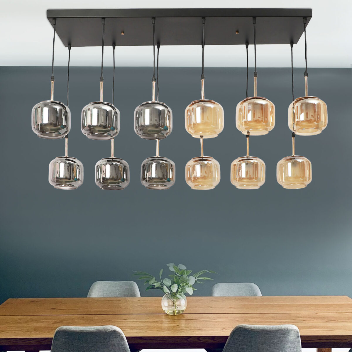 Rectangular hanging light having twelve lamps. Can be customised as per requirement in terms height, number of lamps, finish, shade colour. LAMPS NOT INCLUDED.