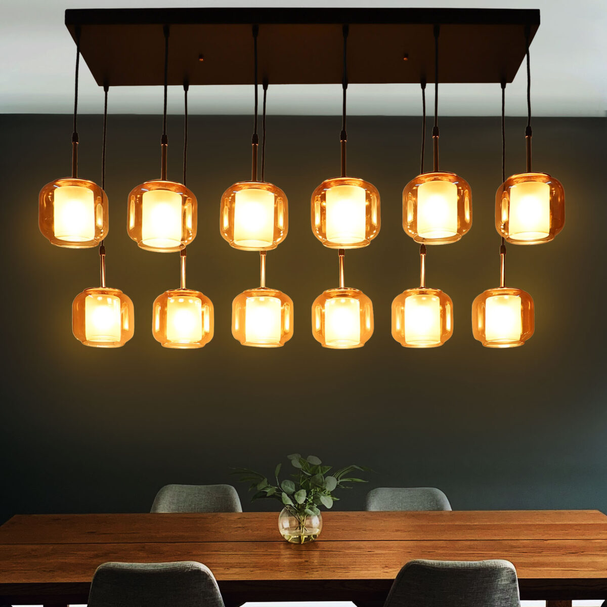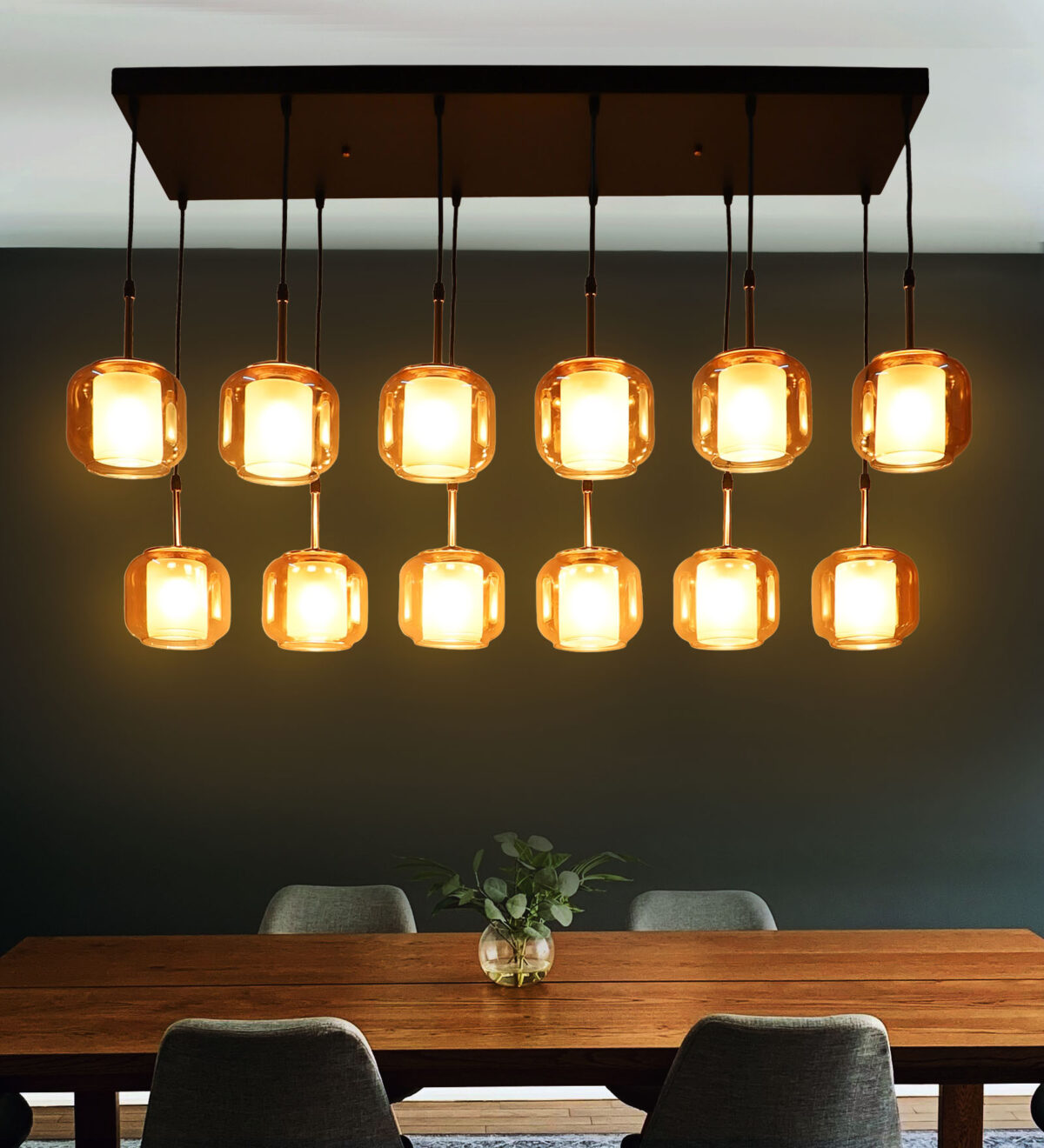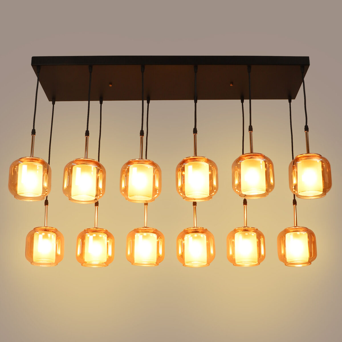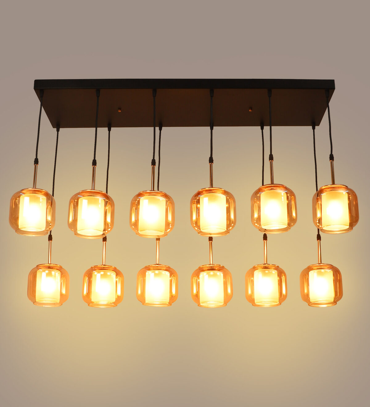 Rectangular hanging light having twelve lamps. Can be customised as per requirement in terms height, number of lamps, finish, shade colour. LAMPS NOT INCLUDED.