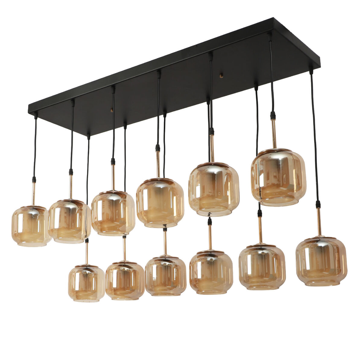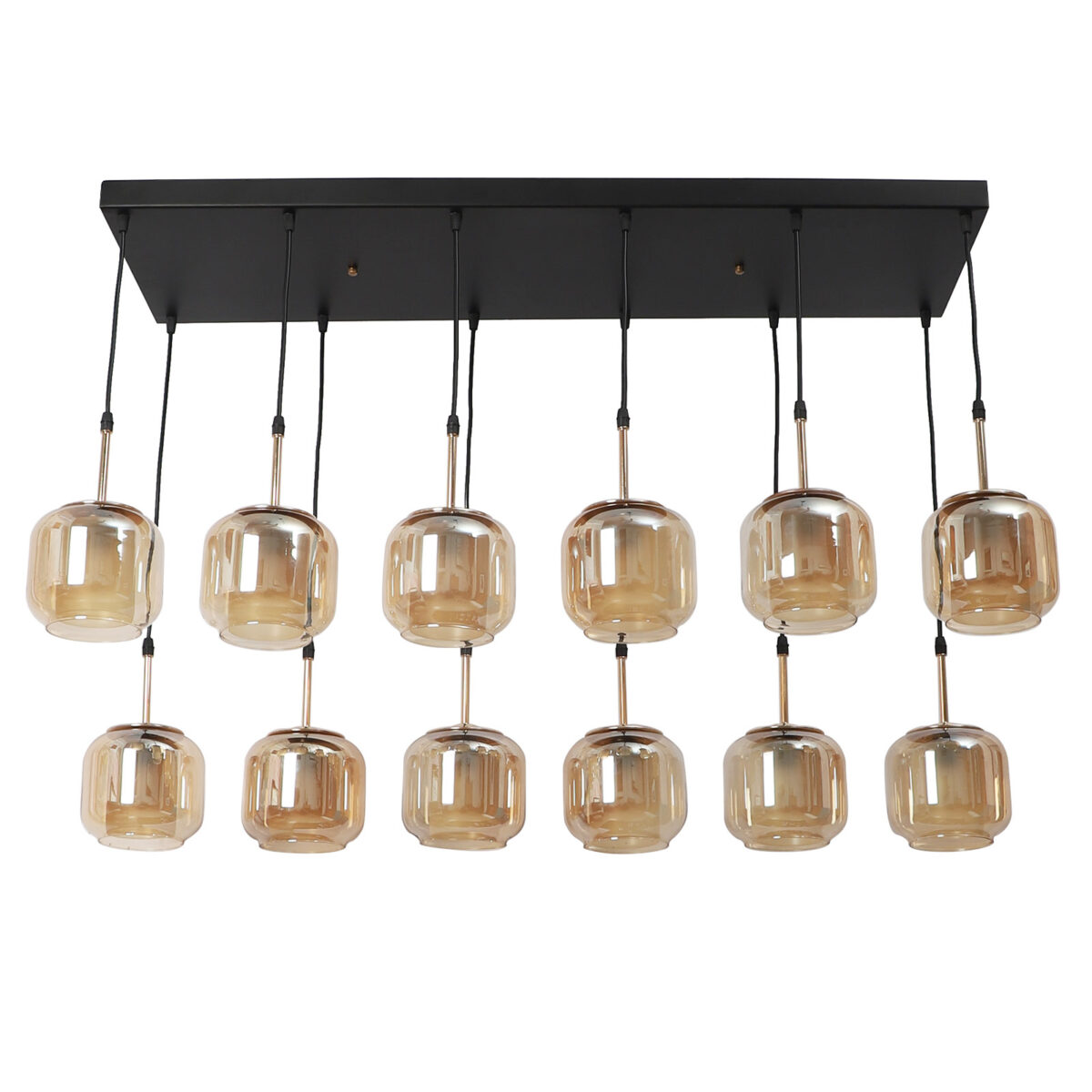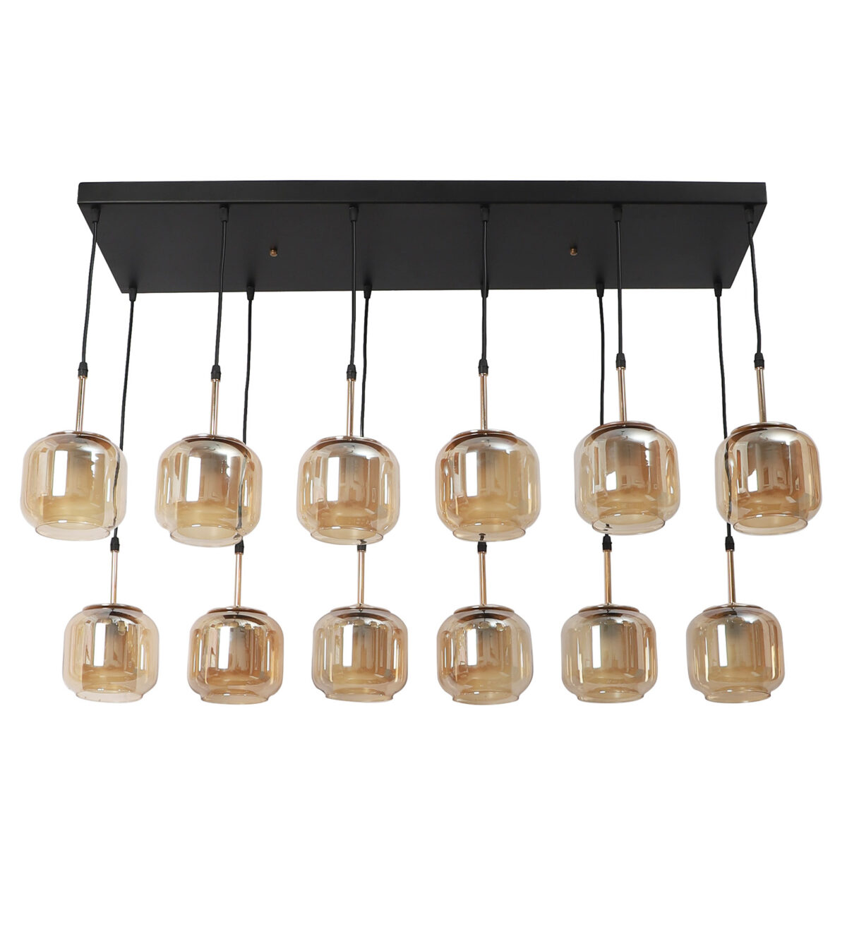 Rectangular hanging light having twelve lamps. Can be customised as per requirement in terms height, number of lamps, finish, shade colour. LAMPS NOT INCLUDED.