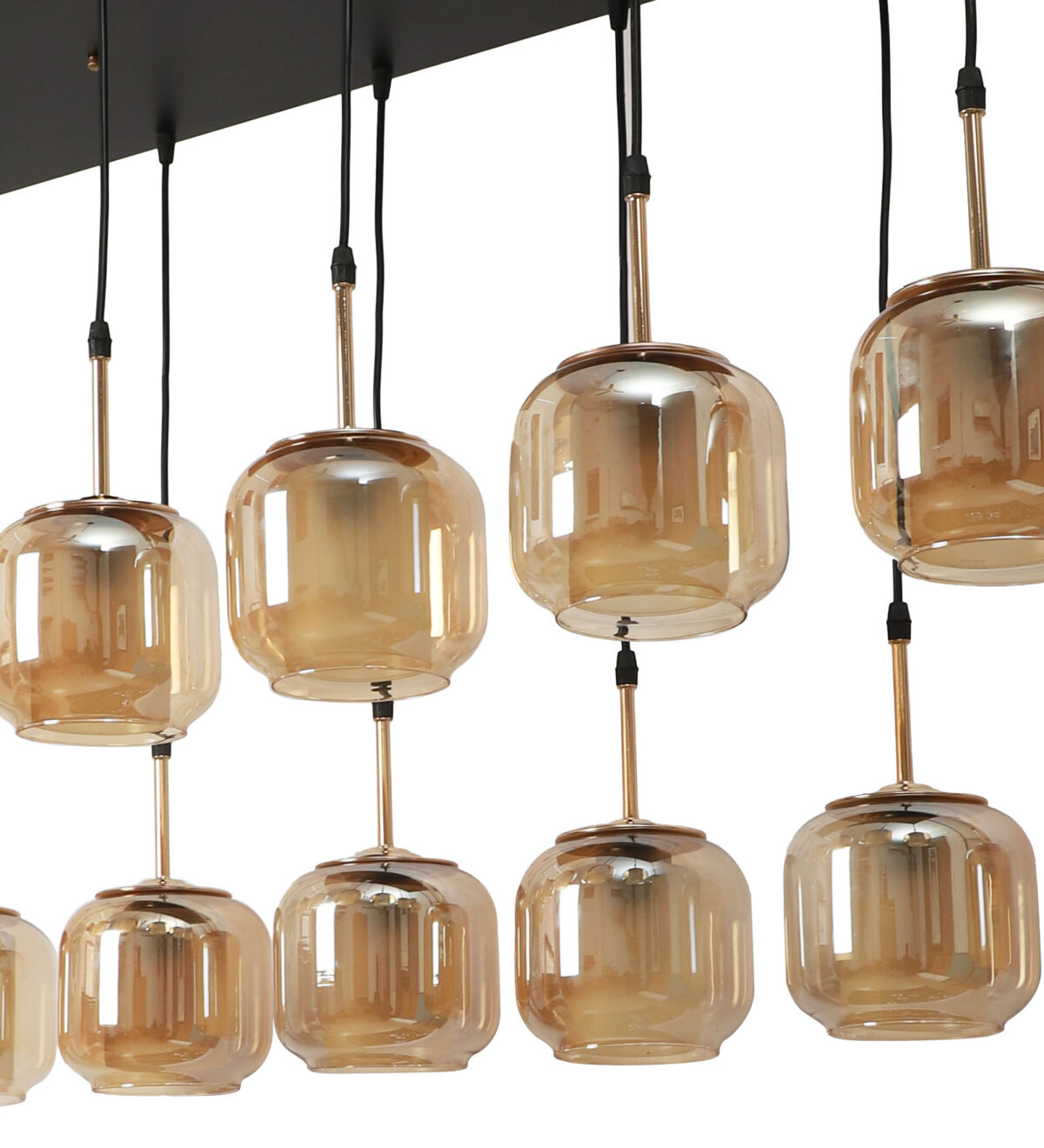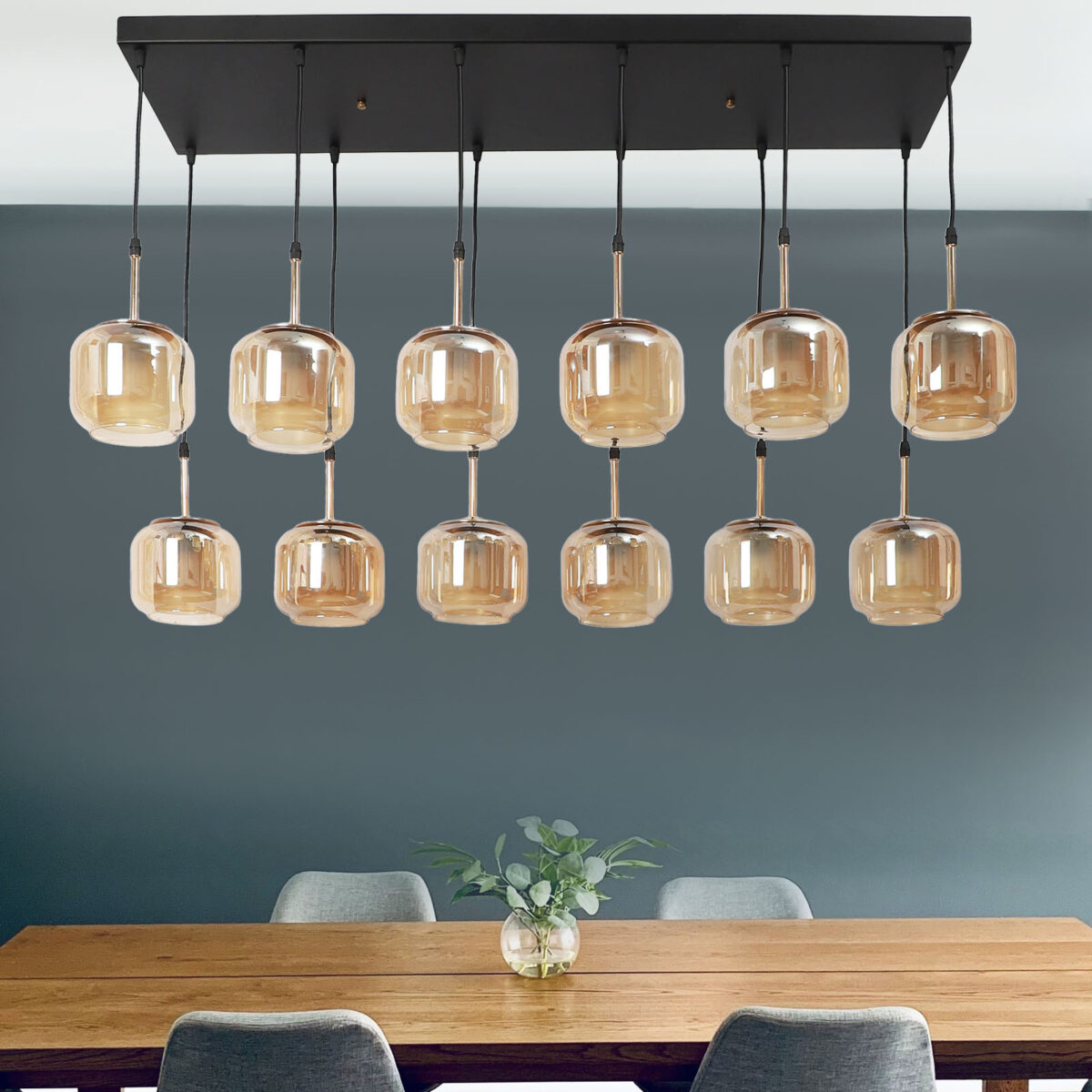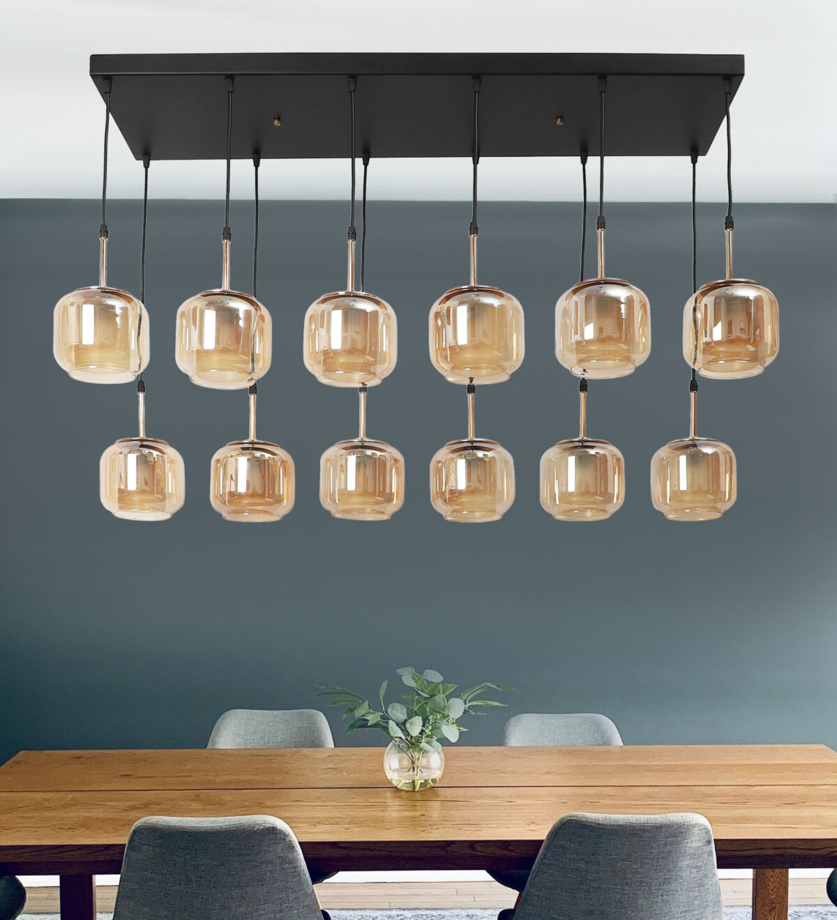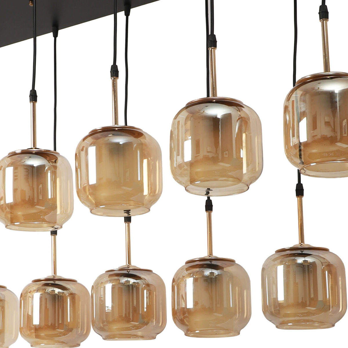 Rectangular hanging light having twelve lamps. Can be customised as per requirement in terms height, number of lamps, finish, shade colour. LAMPS NOT INCLUDED.