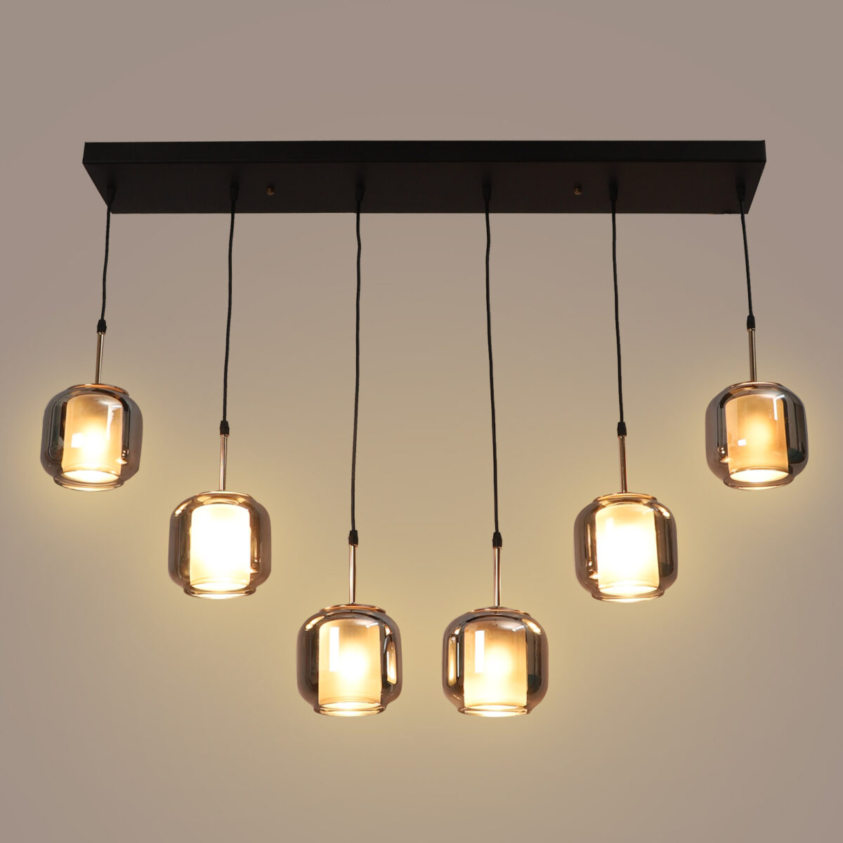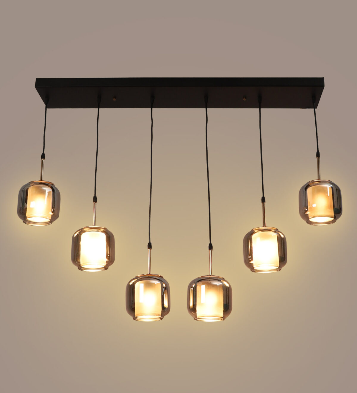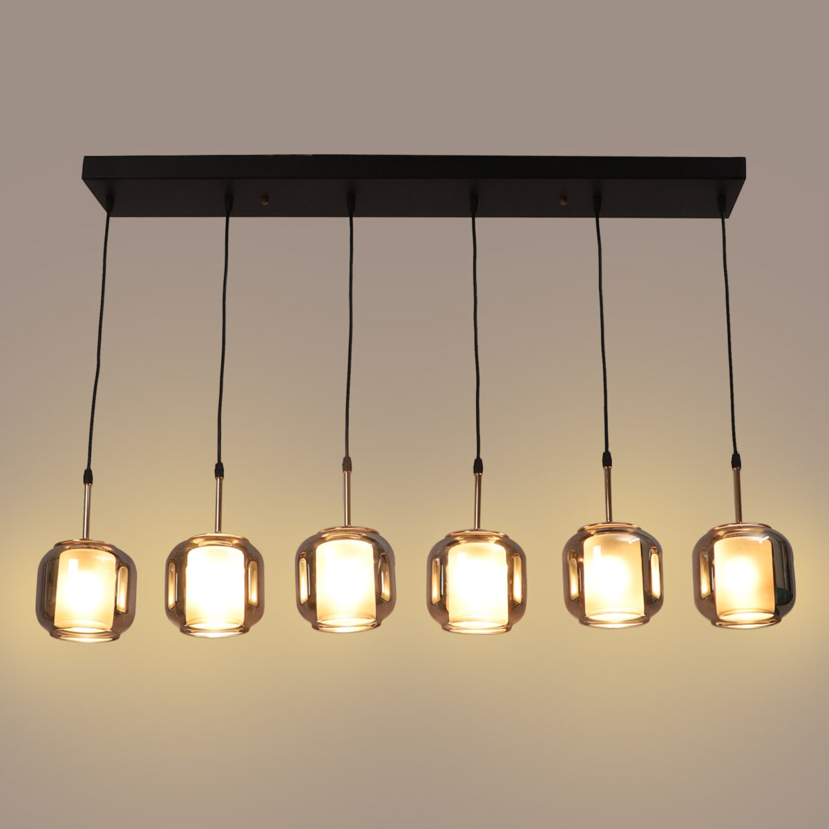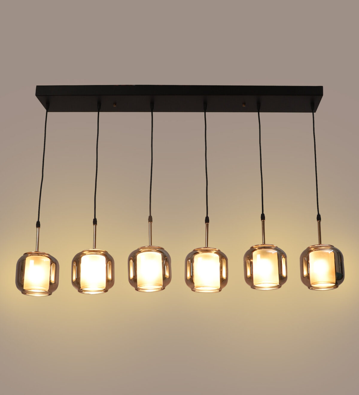 Rectangular hanging light having six lamps. Can be customised as per requirement in terms height, number of lamps, finish, shade colour. LAMPS NOT INCLUDED.
