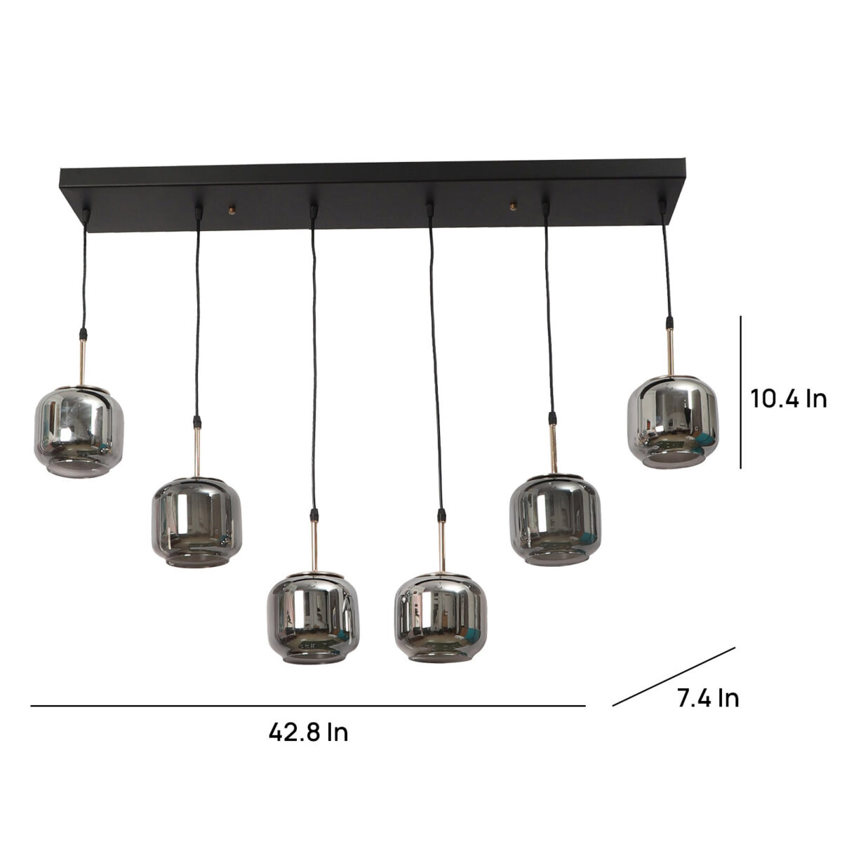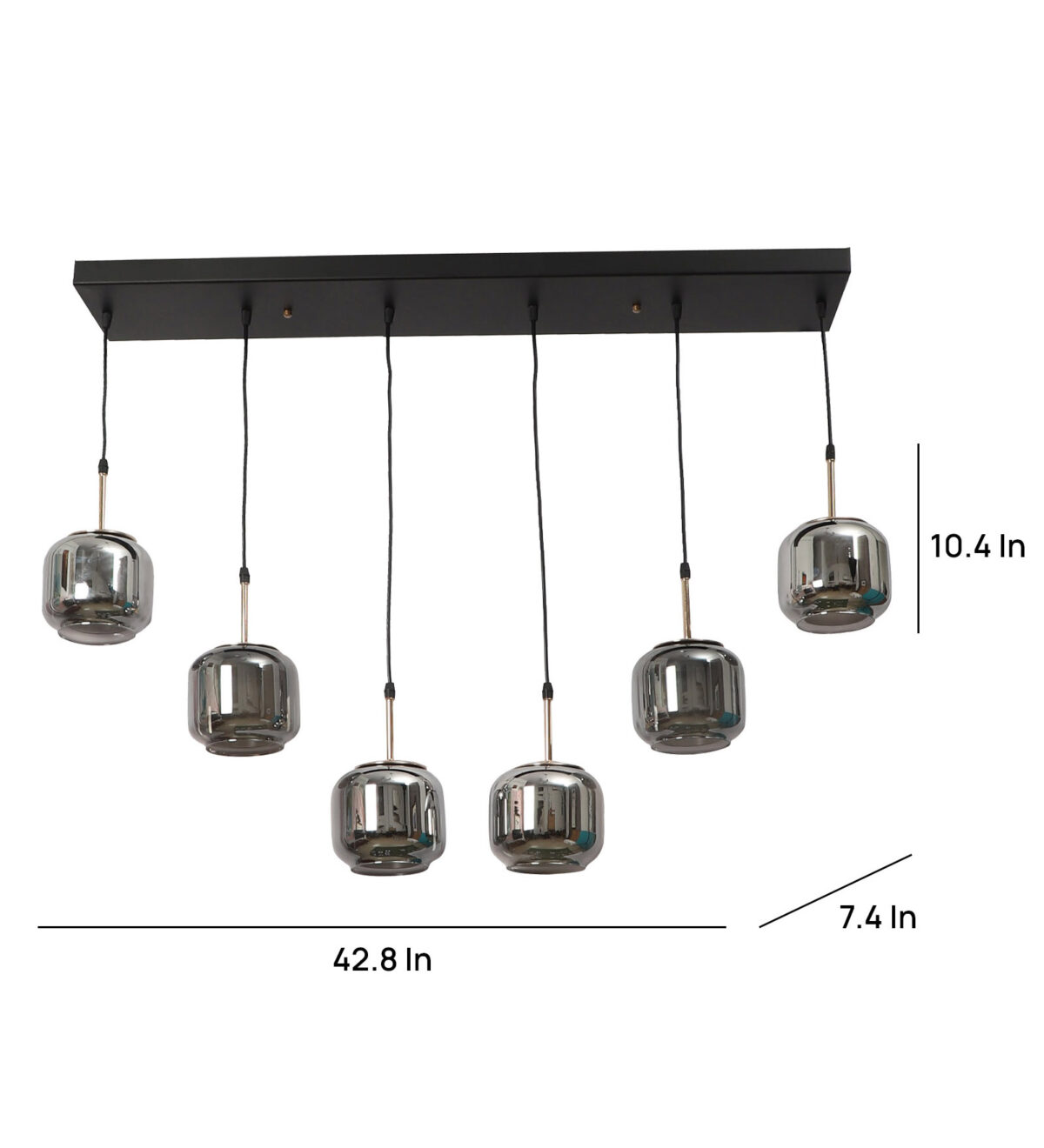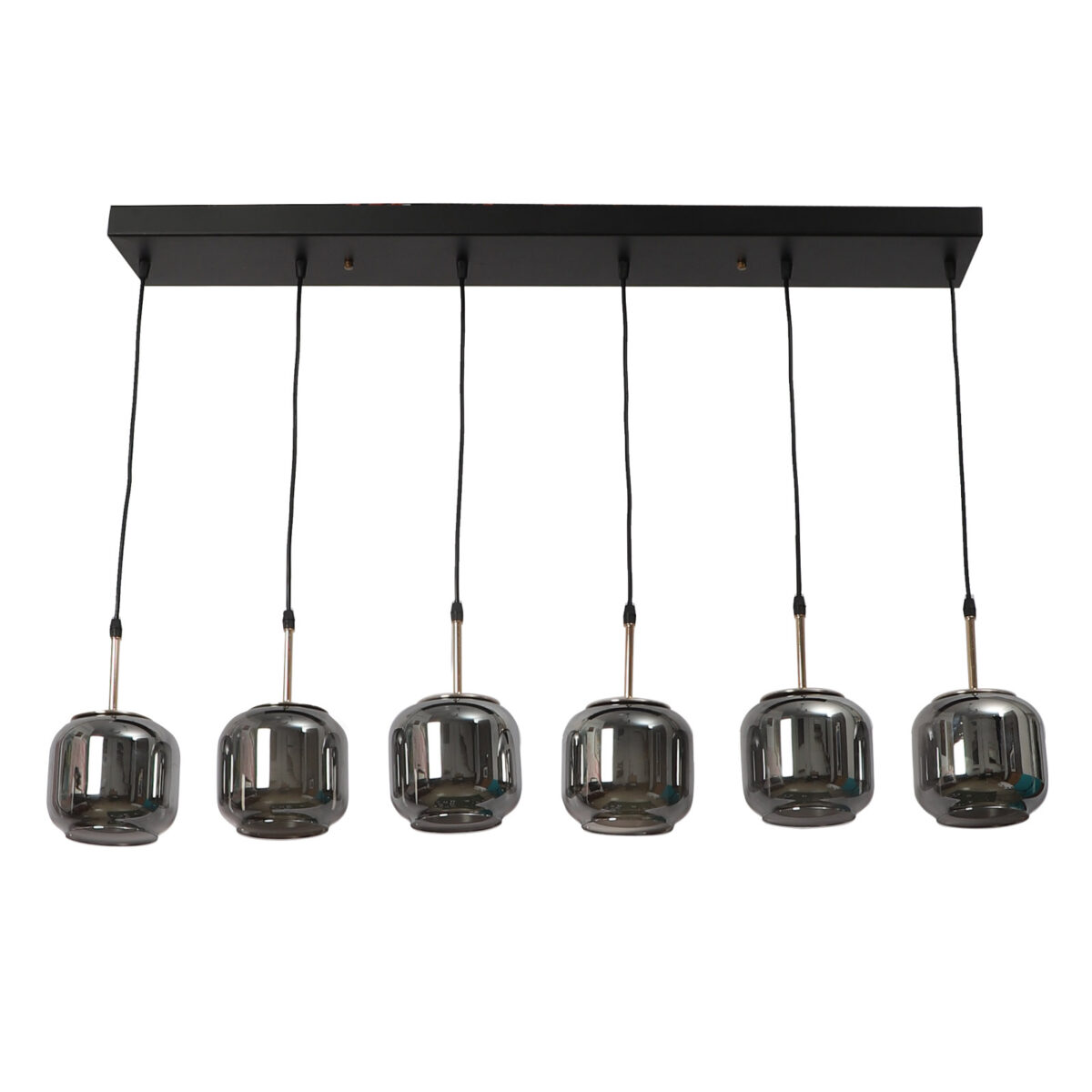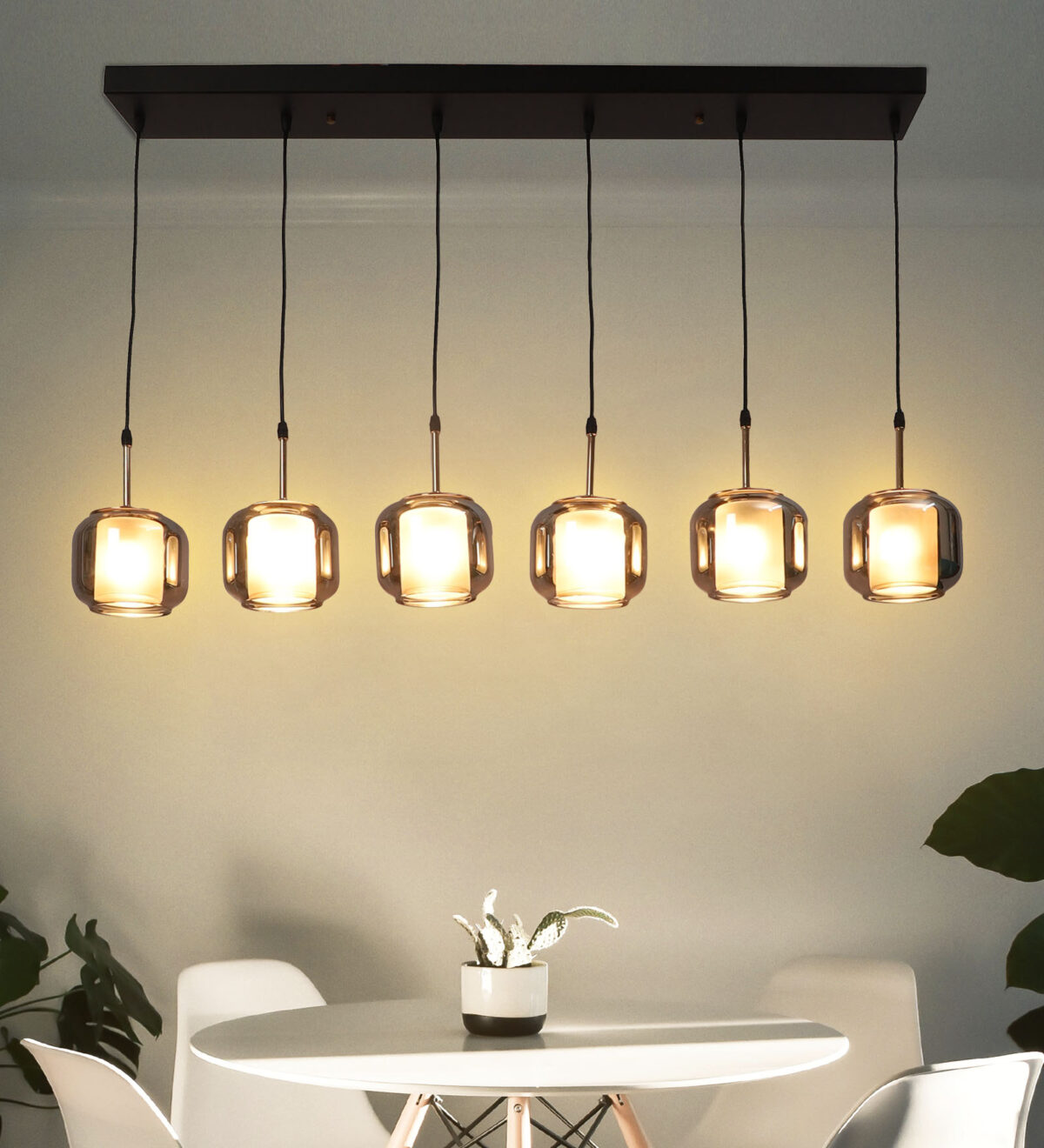 Rectangular hanging light having six lamps. Can be customised as per requirement in terms height, number of lamps, finish, shade colour. LAMPS NOT INCLUDED.