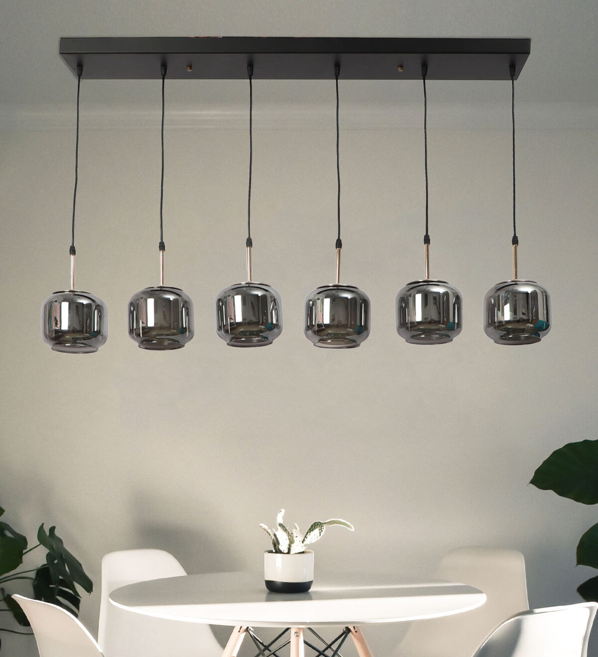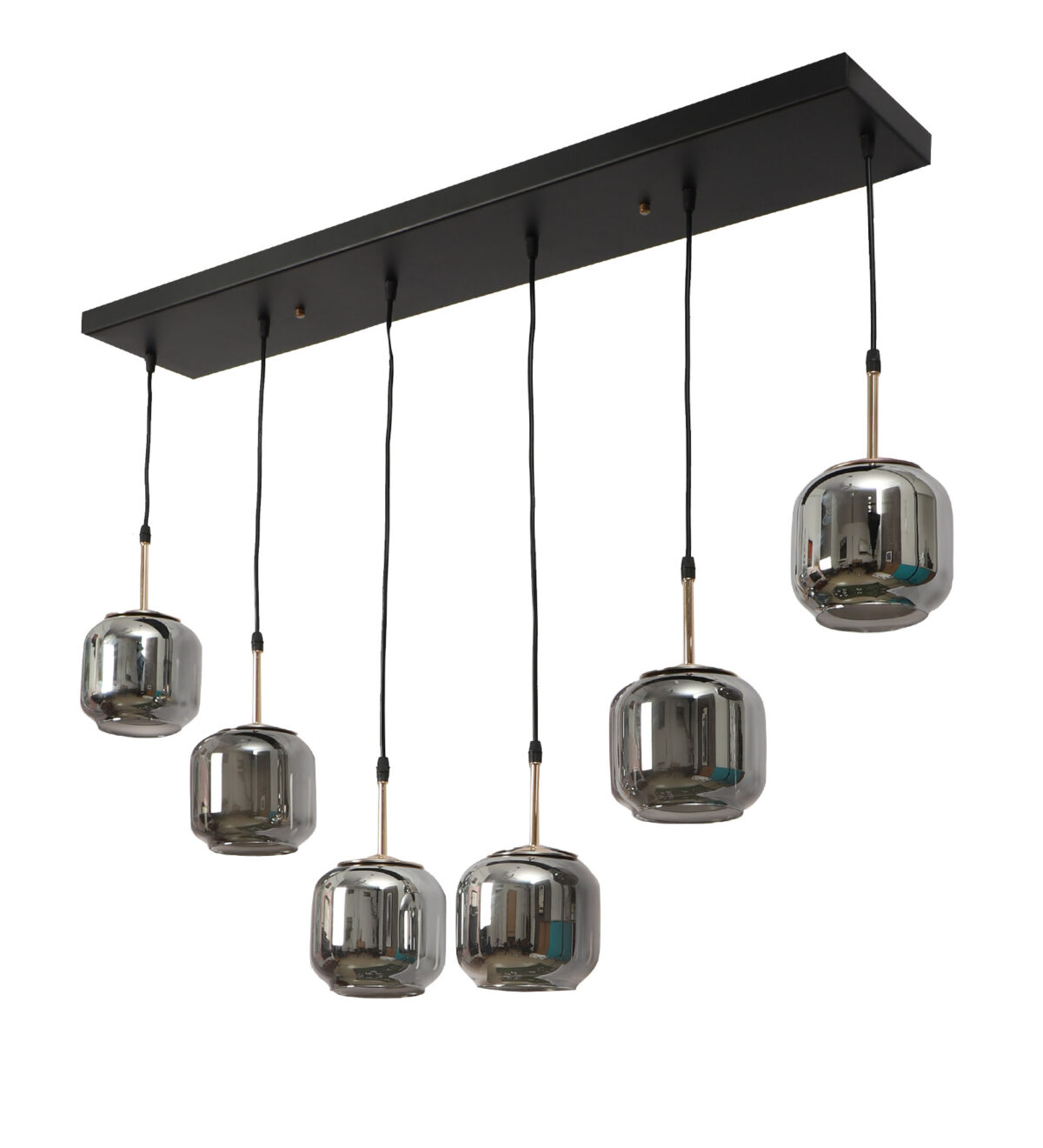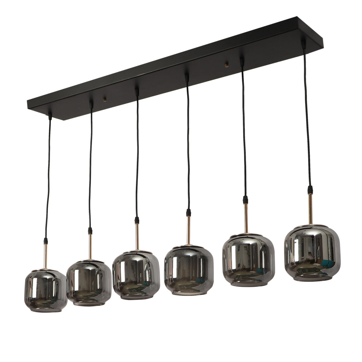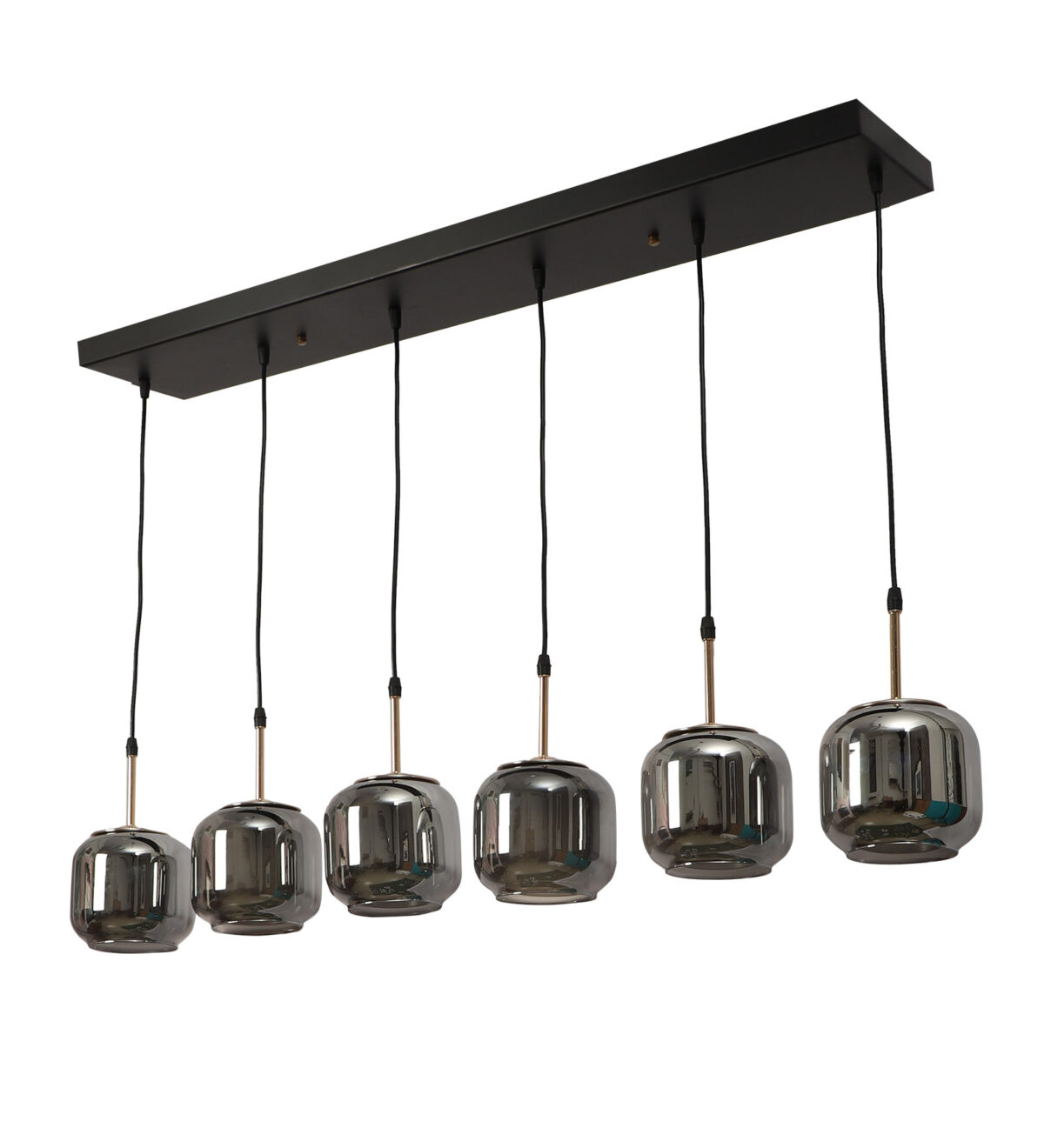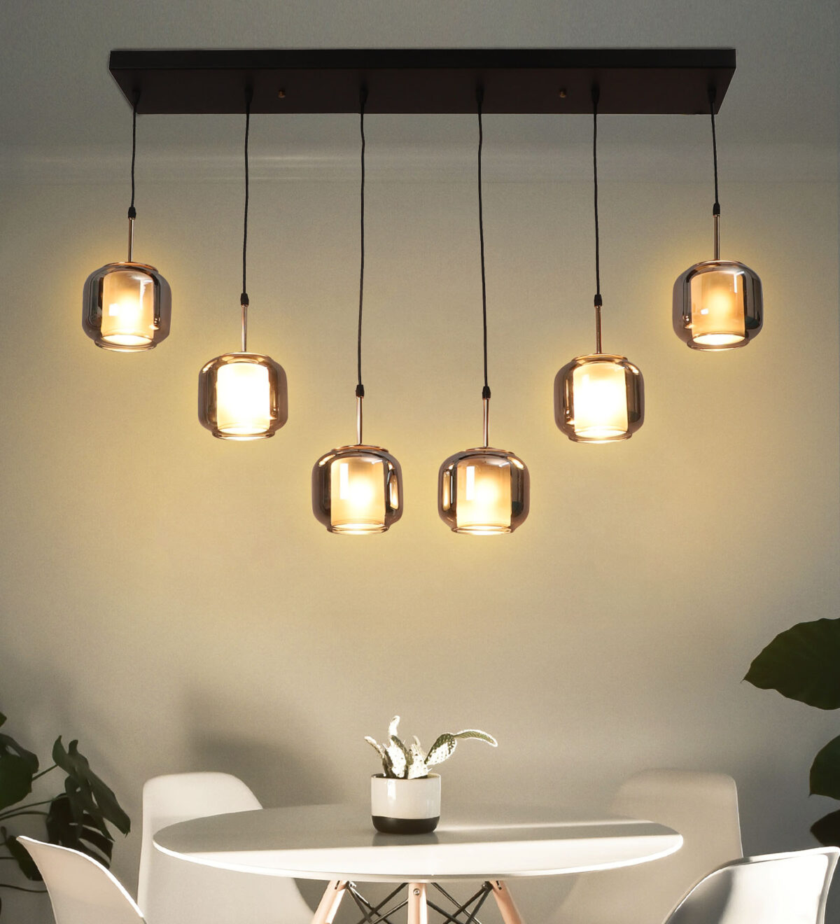 Rectangular hanging light having six lamps. Can be customised as per requirement in terms height, number of lamps, finish, shade colour. LAMPS NOT INCLUDED.