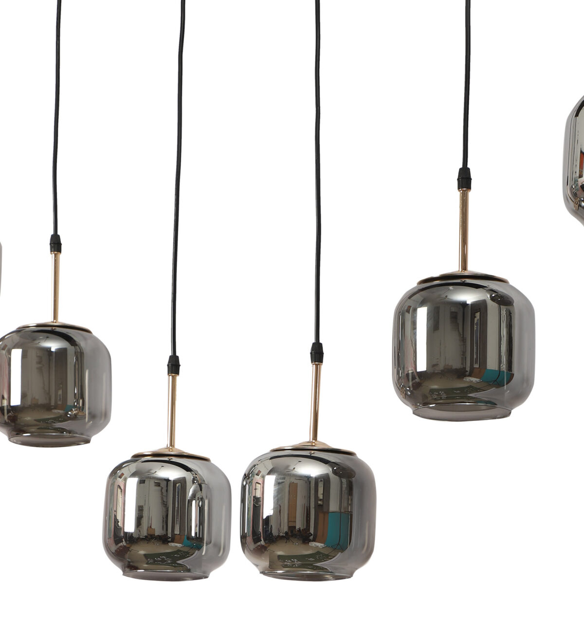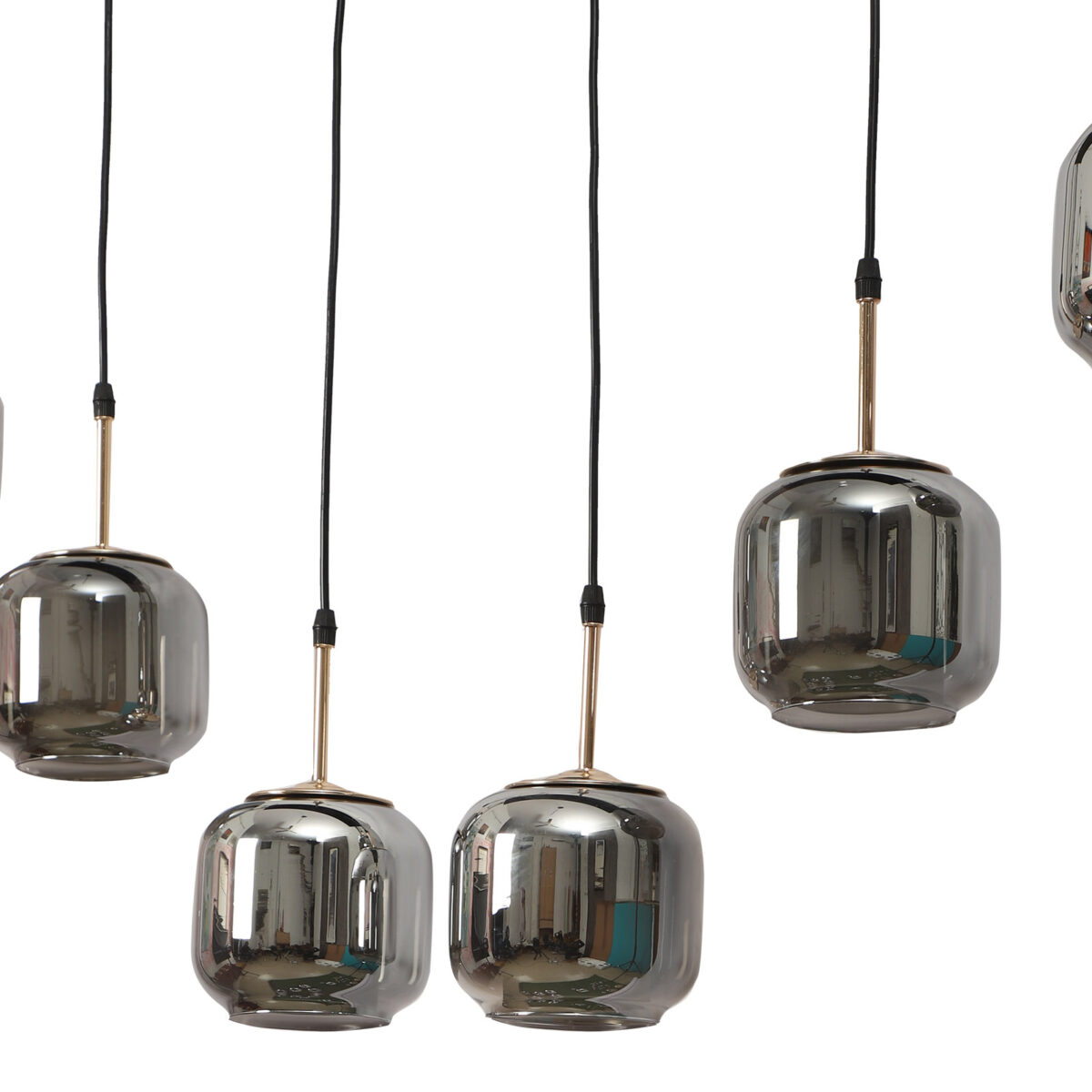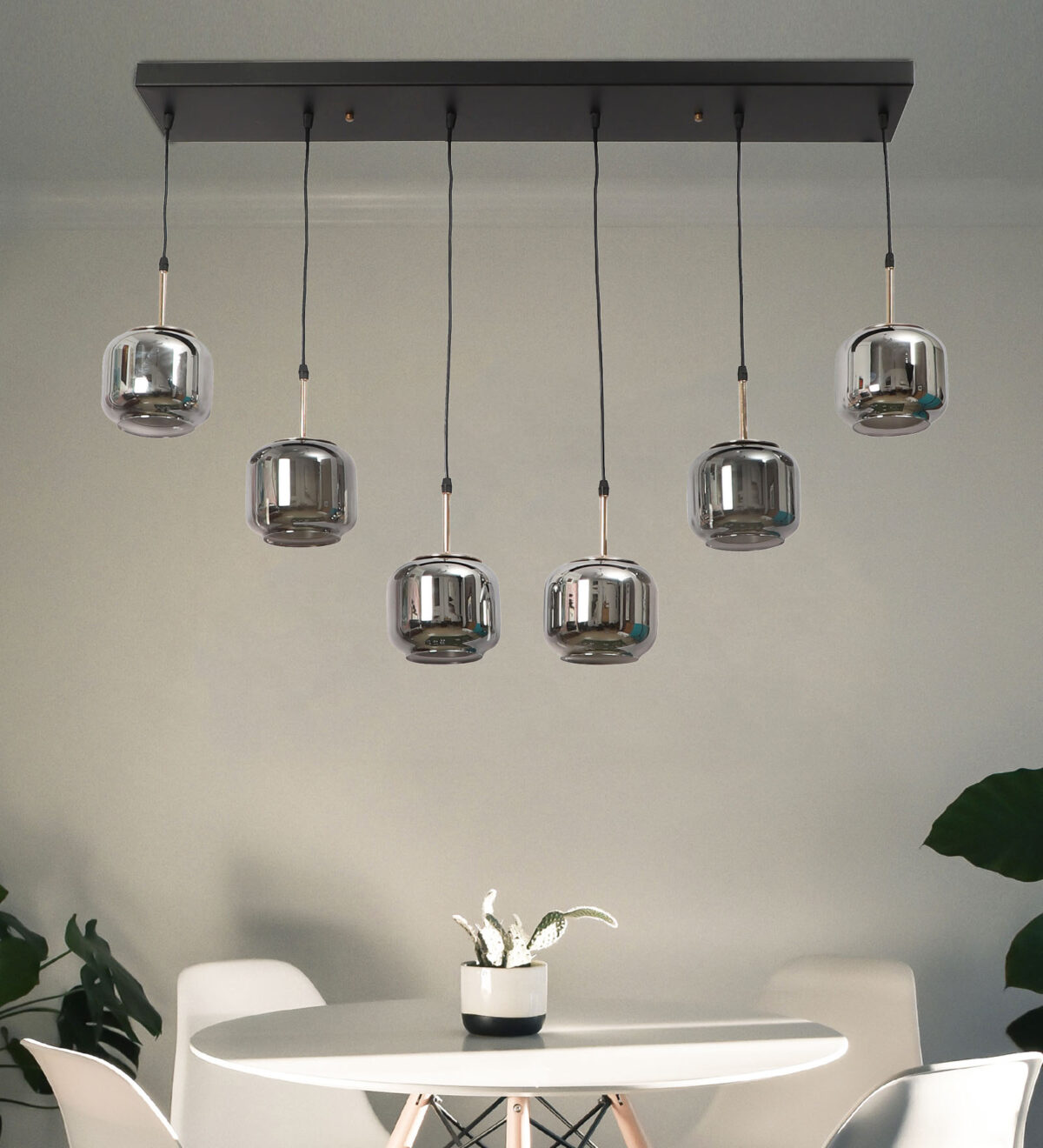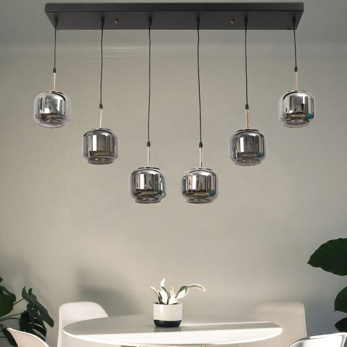 Rectangular hanging light having six lamps. Can be customised as per requirement in terms height, number of lamps, finish, shade colour. LAMPS NOT INCLUDED.