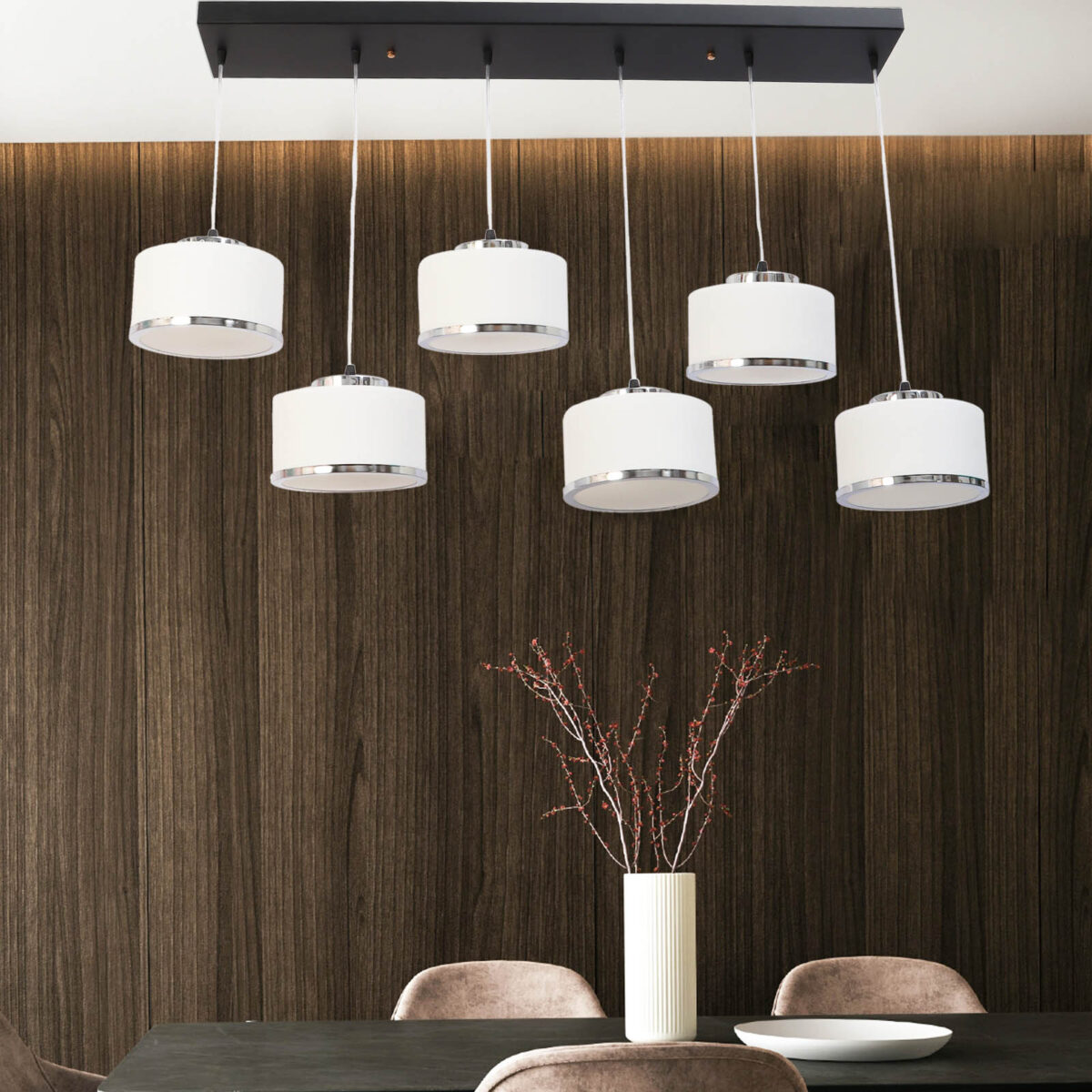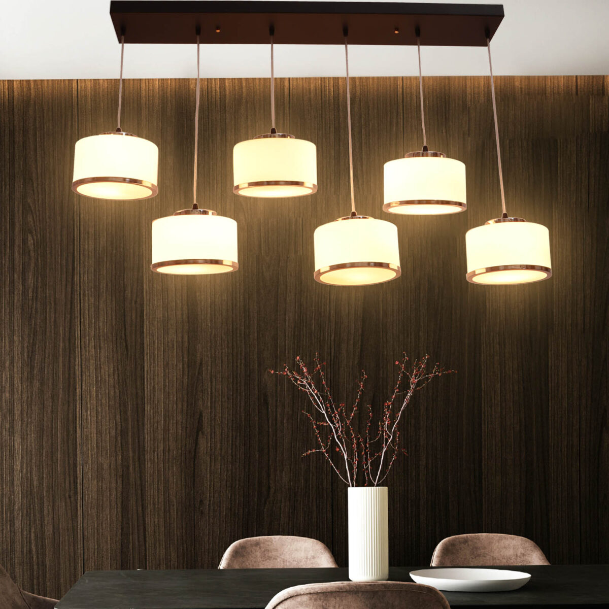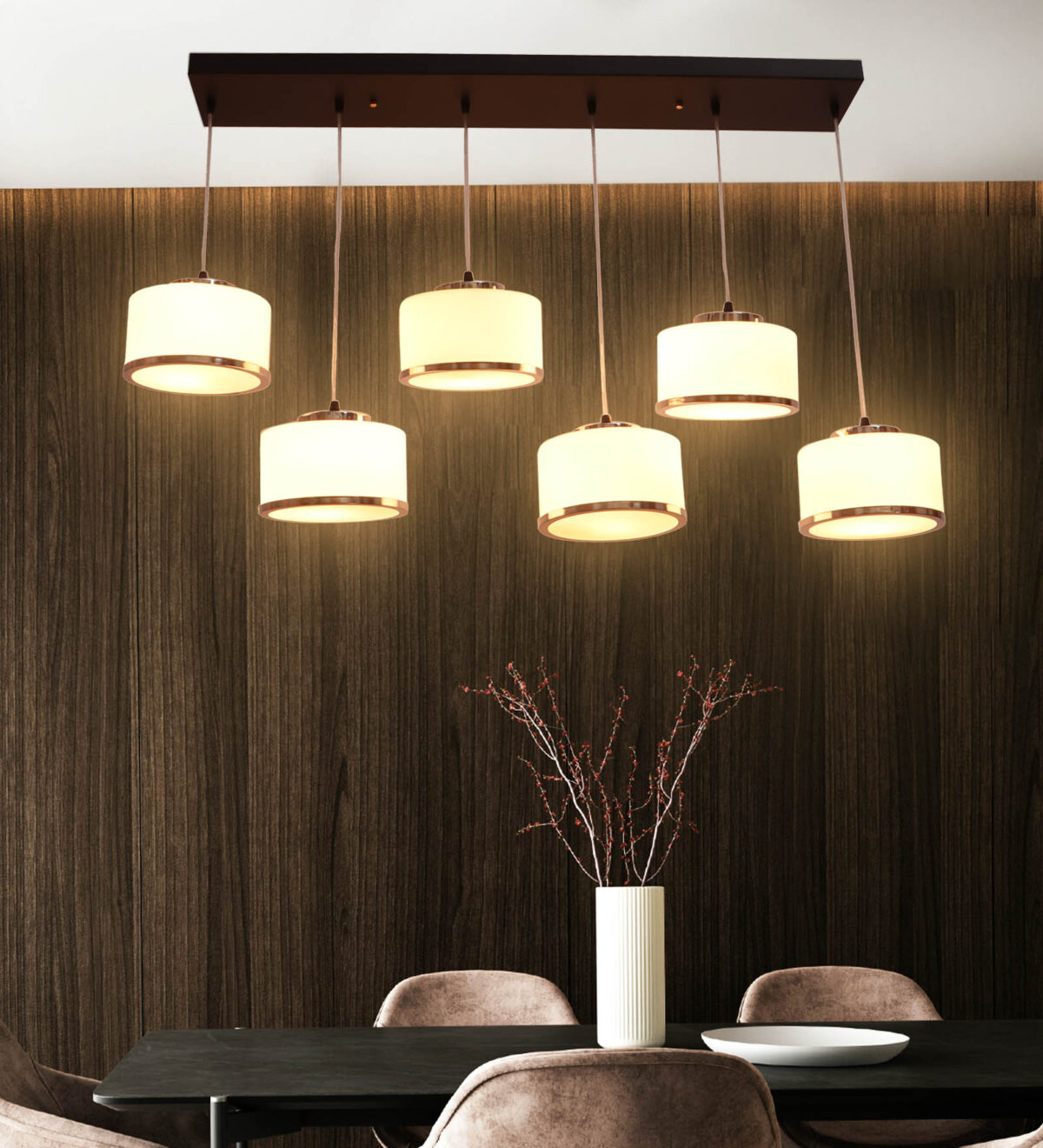 Rectangular hanging light having six lamps. Can be customised as per requirement in terms height, number of lamps. LAMPS NOT INCLUDED.