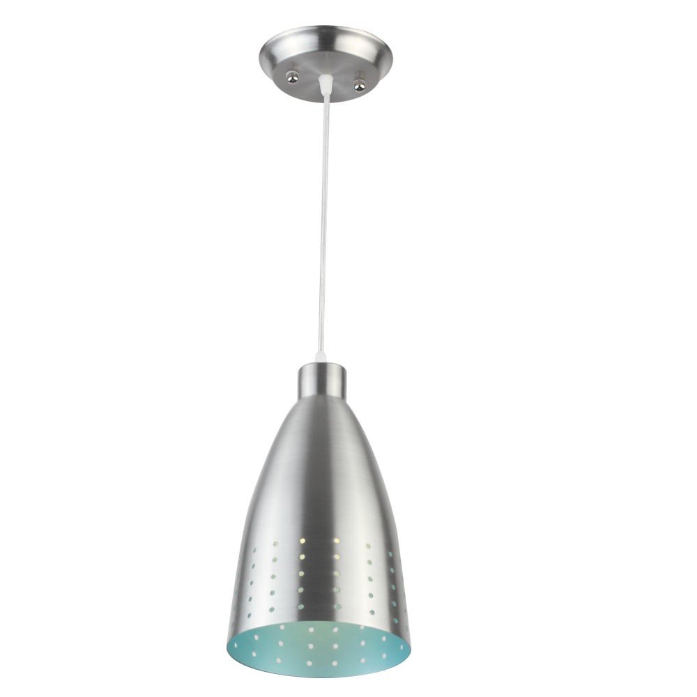 Silver (satin nickel) – blue finish, modern aluminum single hanging light. The suspension can be adjusted at time of installation to the desired height. It is maintenance free, comes with an E27 holder, only the change of lamp is required, which is available locally everywhere. Codes of other color variations in the same design – HL3535, HL3915-G, HL3915-P, HL3915-Y. Application includes both residential and commercial premises wherever it matches with your interiors. Can be customized as per requirement in case of bulk quantities. Lamp not included.