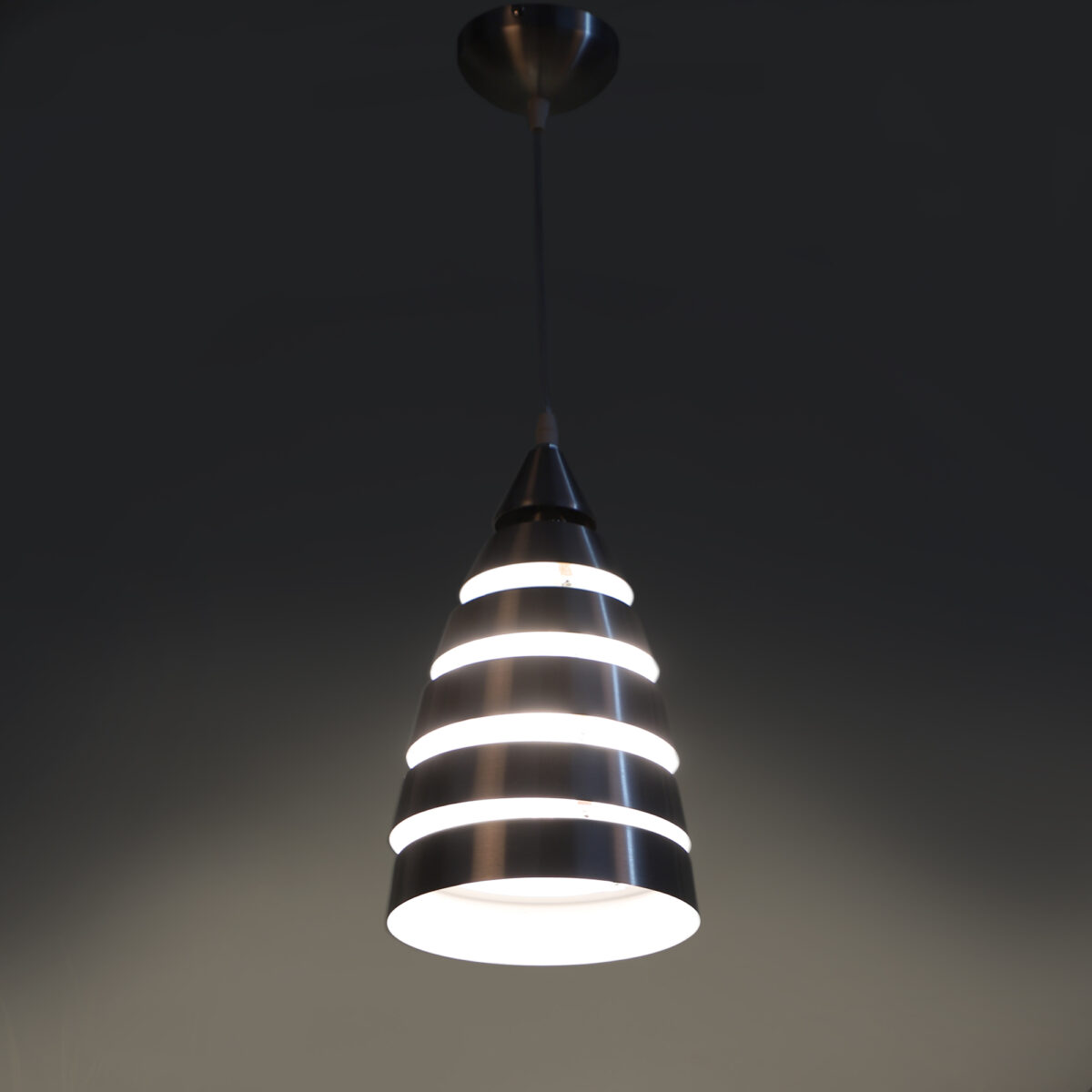 Silver (satin nickel) – white finish, modern aluminum single hanging light. The suspension can be adjusted at time of installation to the desired height. It is maintenance free, comes with an E27 holder, only the change of lamp is required, which is available locally everywhere. This along with its variants are one of the best selling design in our catalogue. Application includes both residential and commercial premises wherever it matches with your interiors. Can be customized as per requirement in case of bulk quantities. Lamp not included.