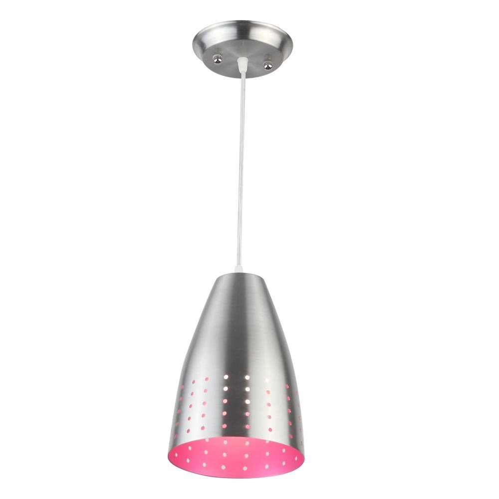 Silver (satin nickel) – pink finish, modern aluminum single hanging light. The suspension can be adjusted at time of installation to the desired height. It is maintenance free, comes with an E27 holder, only the change of lamp is required, which is available locally everywhere. Codes of other color variations in the same design – HL3670, HL3916-B, HL3916-G, HL3916-Y, HL3950-1. Application includes both residential and commercial premises wherever it matches with your interiors. Can be customized as per requirement in case of bulk quantities. Lamp not included.