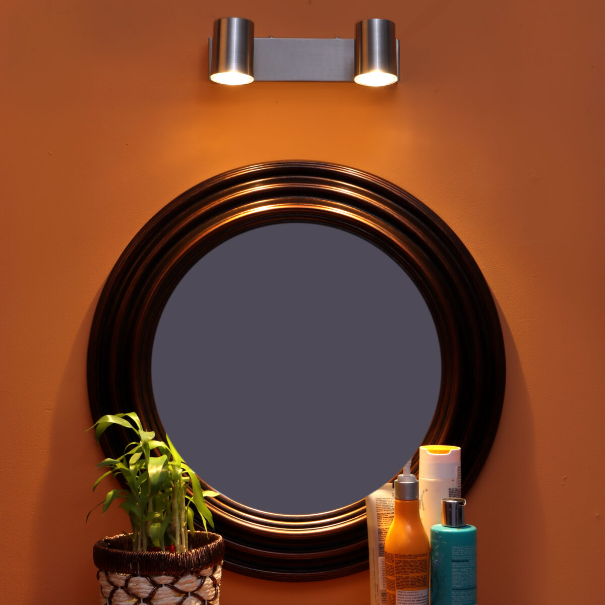 Aluminium, mild steel silver (satin nickel) finish double spot light. Great for installation above a dressing mirror, dressing table, to provide illumination while applying make-up. It can also be used as a wall light, spot light, ceiling spot light, picture light. It is maintenance free, comes with an GU10 holder, only the change of lamp is required, which is available locally everywhere You can of course swap out the bulb for one that is dimmable, has a higher light output or a different color temperature. The lighting spot can be adjusted to any required position. Matching one light code – SL78. Matching three light code – ML279-3, Matching four light code – ML279-4. Antique brass code for one light, two light, three light and four light code – SL79, ML280-2, ML280-3, ML280-4. Dark brown (wood ) finish code for one light, two light, three light and four light – SL83, ML282-2, ML282-3, ML282-4. LAMP INCLUDED.