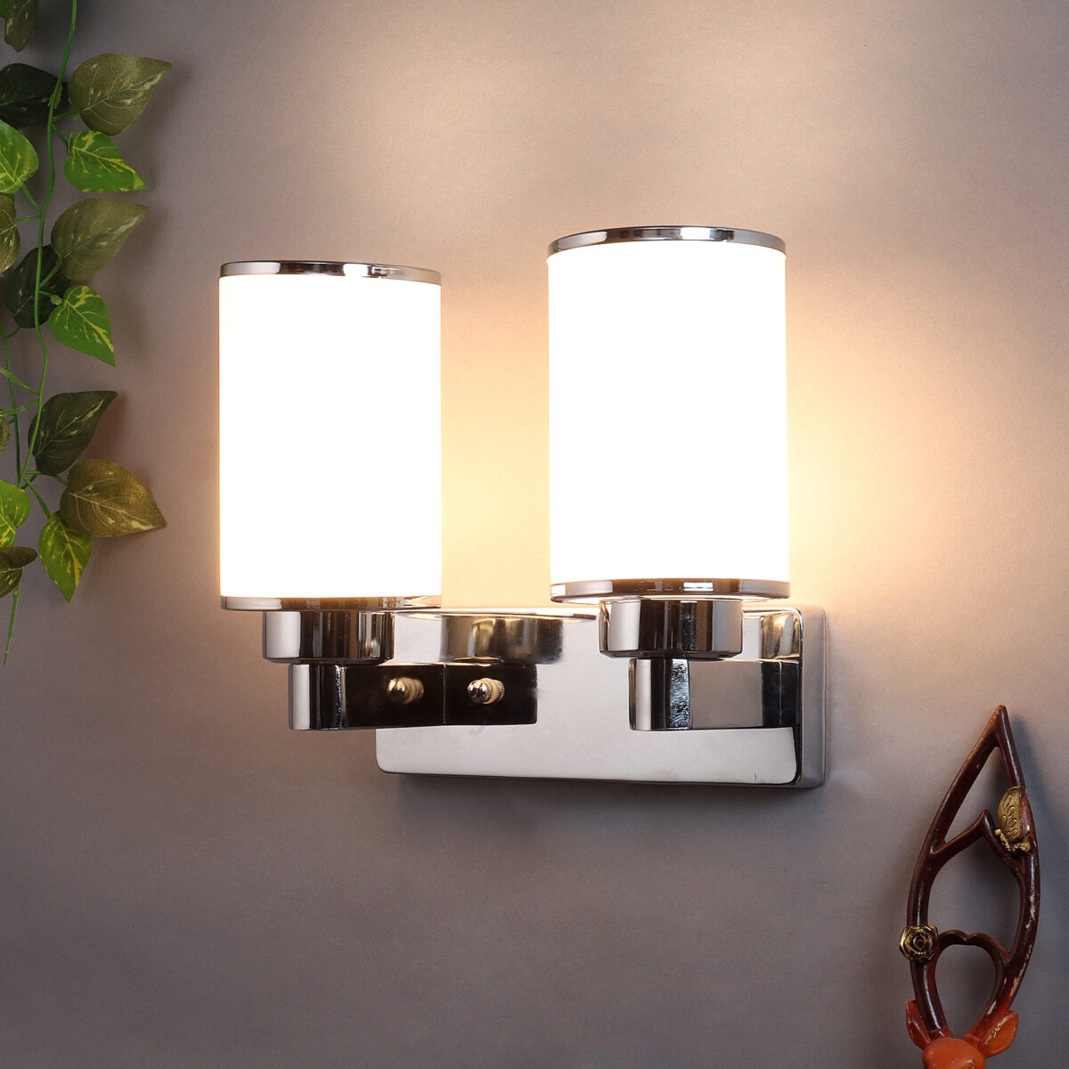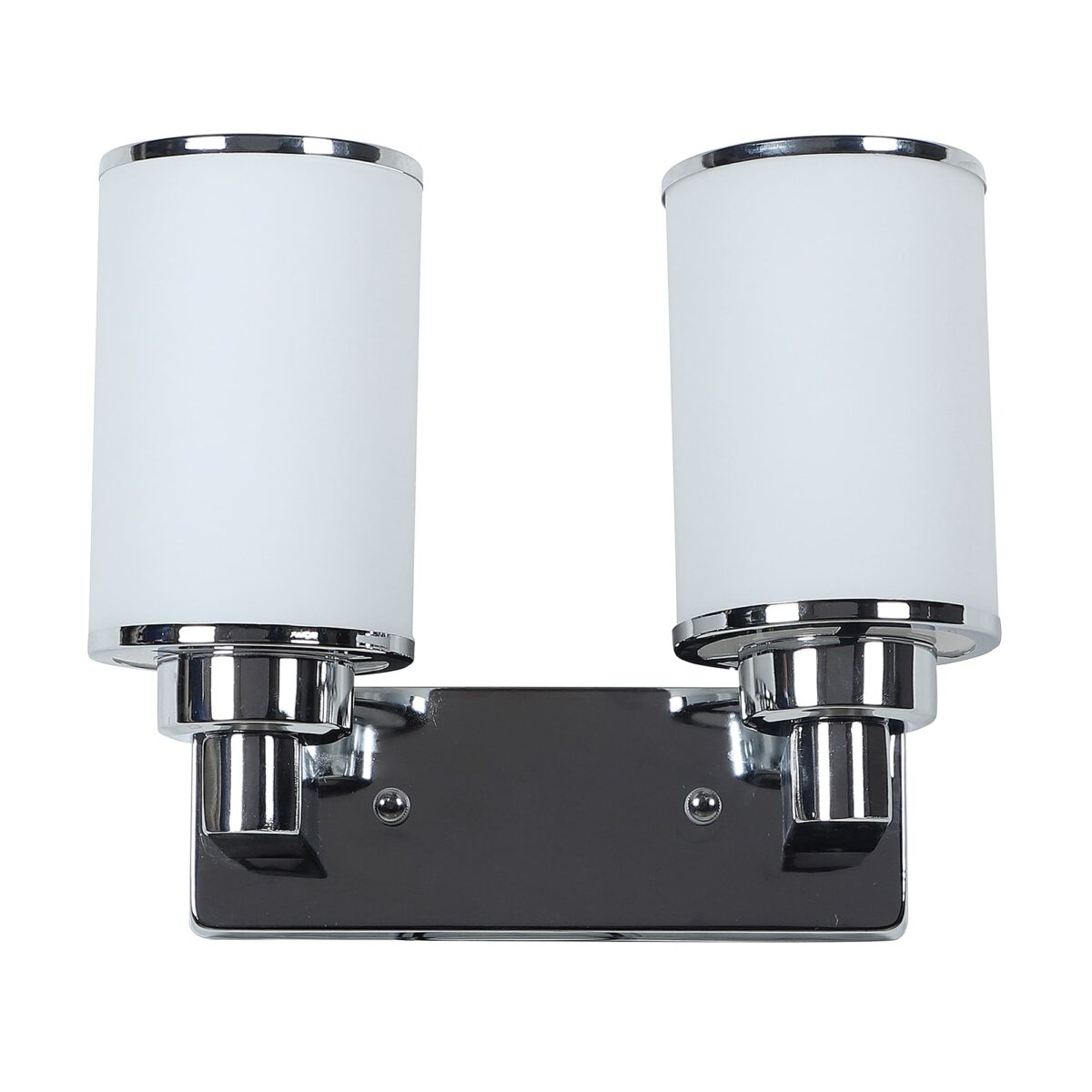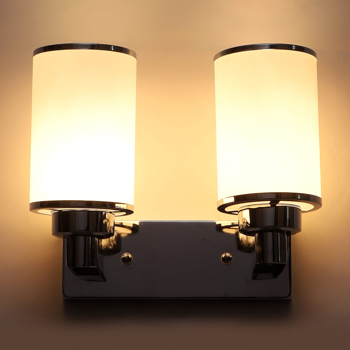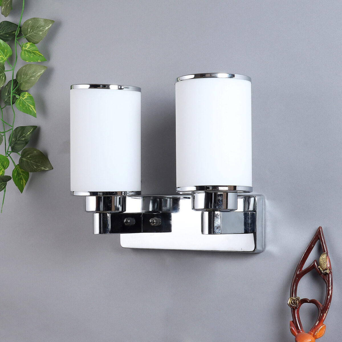 Modern silver (chrome) double wall light made of mild steel, with big round cylindrical white glasses having chrome ring at both its edges. It is maintenance free, easy to remove glass and wash it, comes with an E27 holder, only the change of lamp is required, which is available locally everywhere. You can of course swap out the bulb for one that is dimmable, has a higher light output or a different colour temperature. Application includes both residential and commercial premises wherever it matches with your interiors. single wall light code – WL2355. Can be customized as per requirement in case of bulk quantities. Lamp not included.