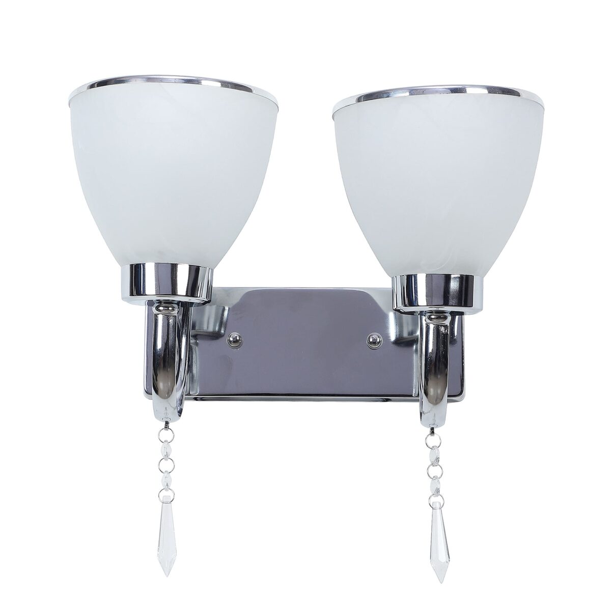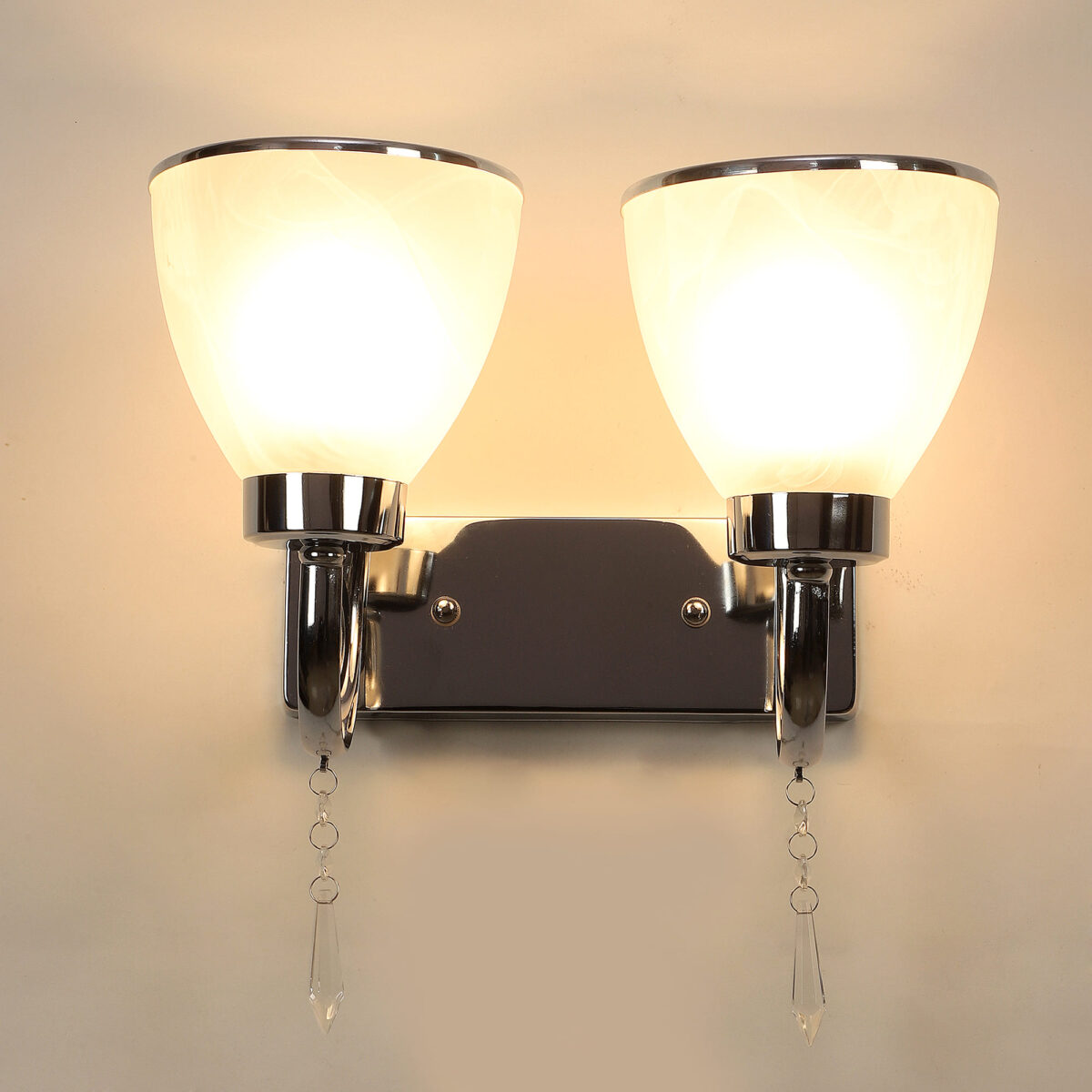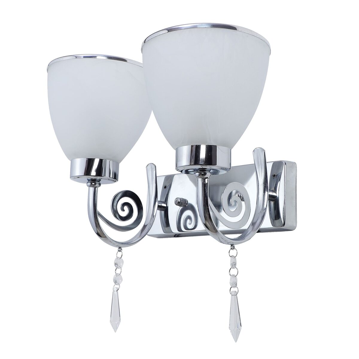 Modern silver (chrome) double wall light made of mild steel, with taper self texture designed glasses having chrome ring at its edges. Design looks amazing when lit. It is maintenance free, easy to remove glass and wash it, comes with an E27 holder, only the change of lamp is required, which is available locally everywhere. You can of course swap out the bulb for one that is dimmable, has a higher light output or a different color temperature. Application includes both residential and commercial premises wherever it matches with your interiors. Matching single wall light code – WL2451. Can be customized as per requirement in case of bulk quantities. Lamp not included.