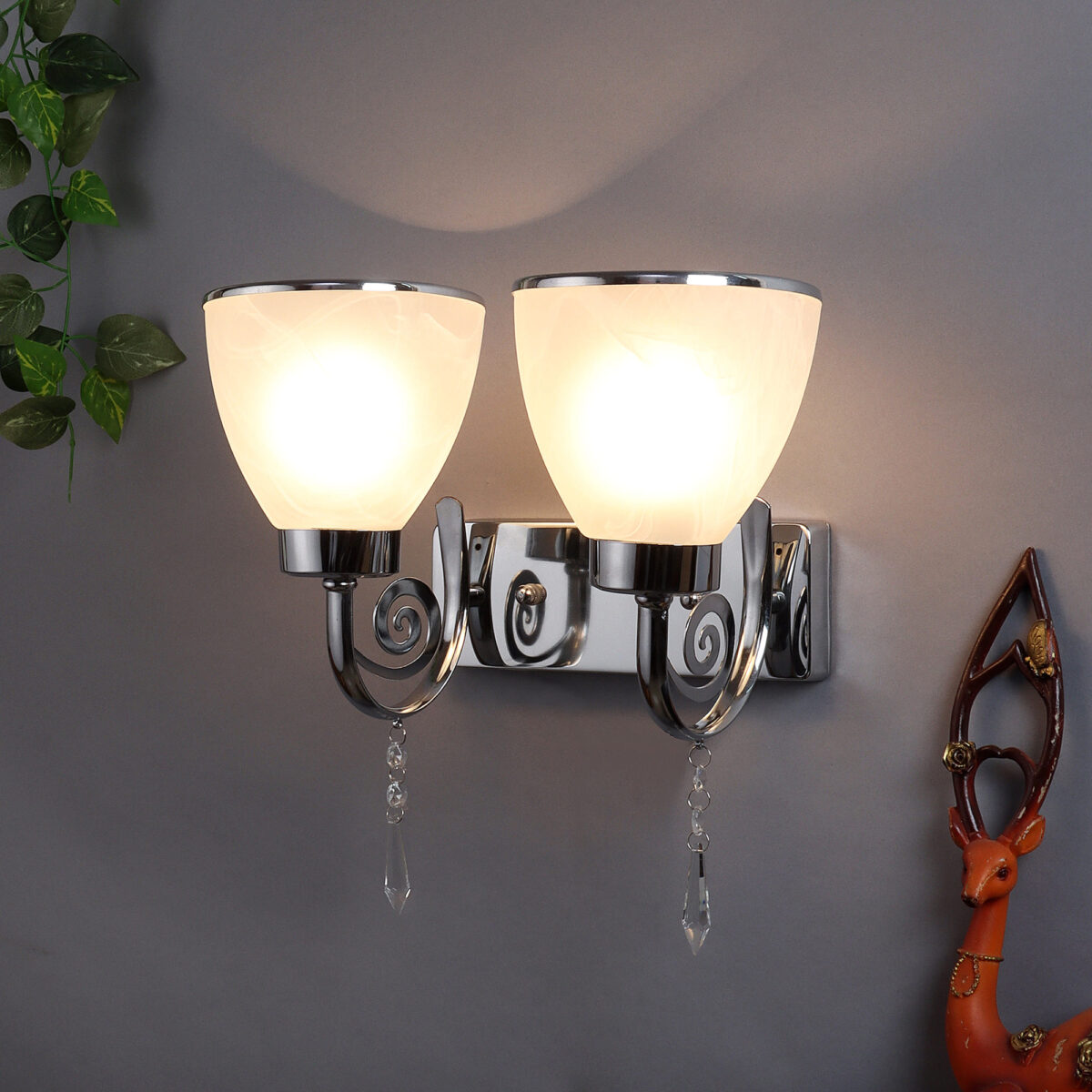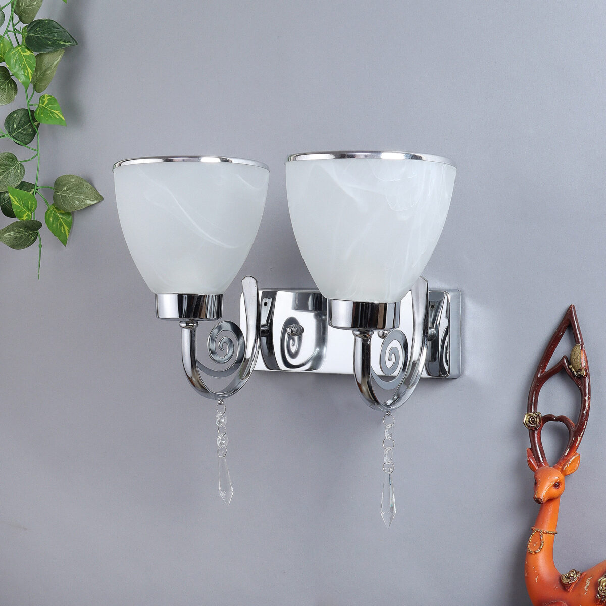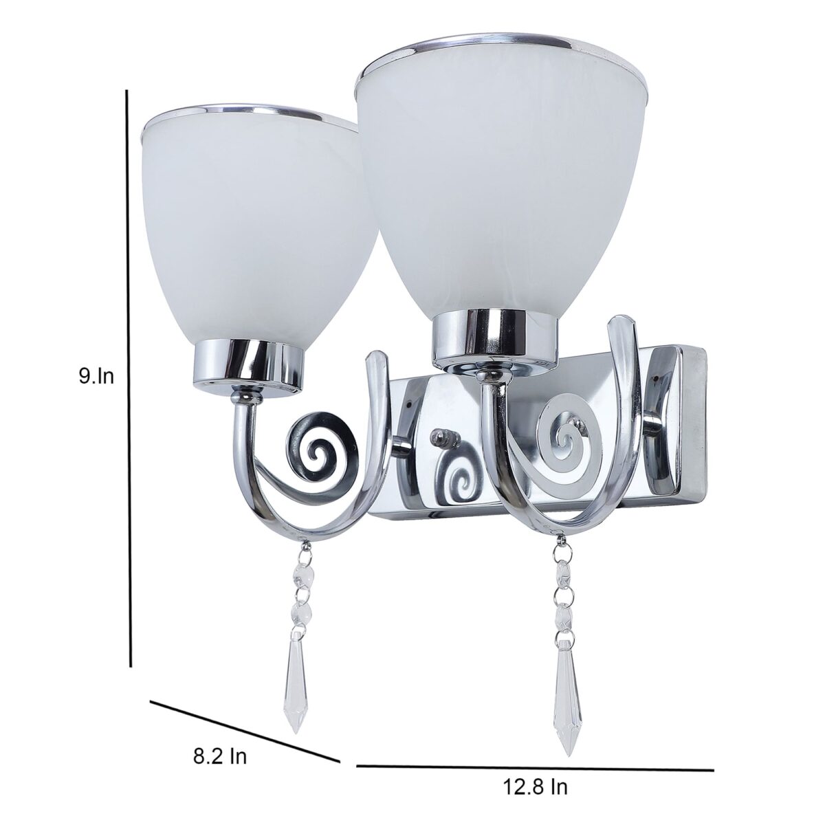 Modern silver (chrome) double wall light made of mild steel, with taper self texture designed glasses having chrome ring at its edges. Design looks amazing when lit. It is maintenance free, easy to remove glass and wash it, comes with an E27 holder, only the change of lamp is required, which is available locally everywhere. You can of course swap out the bulb for one that is dimmable, has a higher light output or a different color temperature. Application includes both residential and commercial premises wherever it matches with your interiors. Matching single wall light code – WL2451. Can be customized as per requirement in case of bulk quantities. Lamp not included.