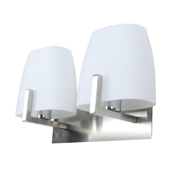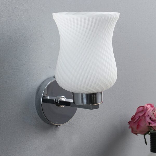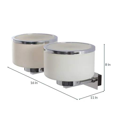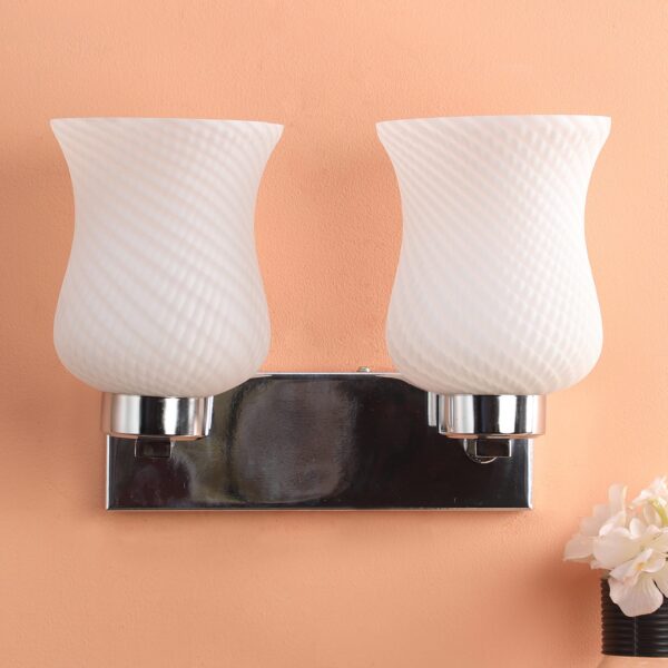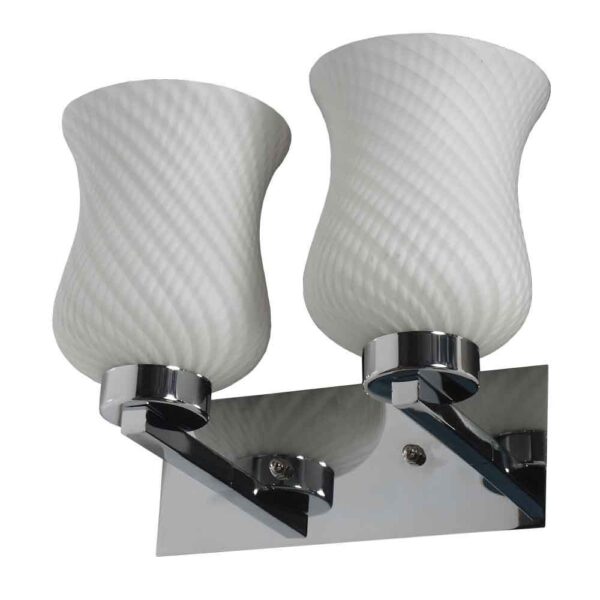 Silver (chrome) finish double wall light having round cylinderical white glass. It is maintenance free, glasses are closed from all the sides which prevents accumalation of dust and it is easy to remove glass and wash it. Comes with an E27 holder, only the change of lamp is required, which is available locally everywhere. Application includes both residential and commercial premises wherever it matches with your interiors. Matching ceiling variation – CL252. Matching chandellier variations -CH164, CH165, CH167, CH177. Matching single wall light code WL2541. All designs available in dark brown (wood) finish also. Can be customized as per requirement in case of bulk quantities. This along with its variants are the best selling products in our catalogue. LAMP NOT INCLUDED.